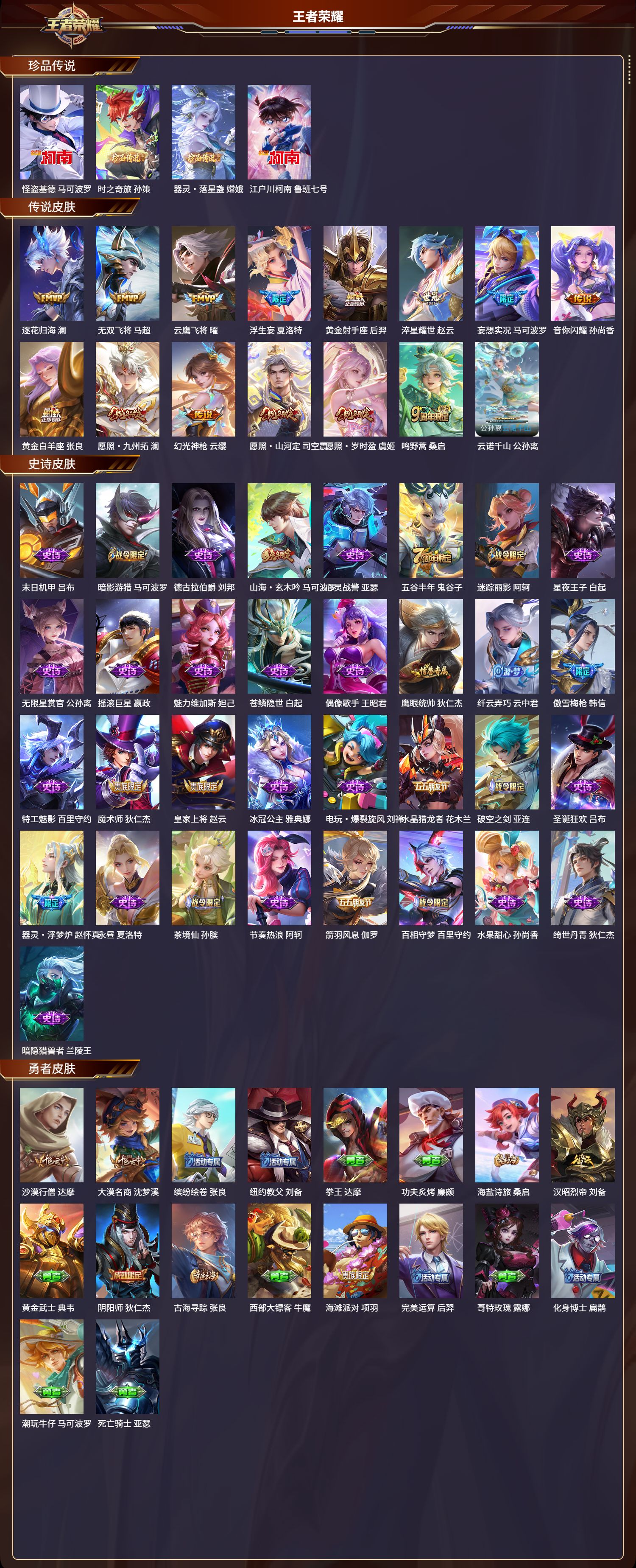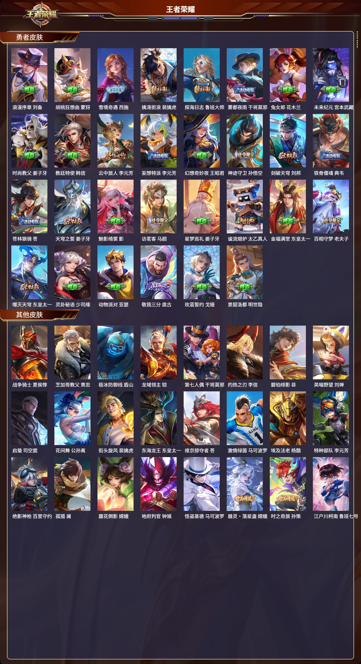【48,勇者皮肤】沙漠行僧,达摩,大漠名商,沈梦溪,缤纷绘卷,张良,纽约教父,刘备,拳王,达摩,功夫炙烤,廉颇,海盐诗旅,桑启,汉昭烈帝,刘备,黄金武士,典韦,阴阳师,狄仁杰,古海寻踪,张良,西部大镖客,牛魔,海滩派对,项羽,完美运算,后羿,哥特玫瑰,露娜,化身博士,扁鹊,潮玩牛仔,马可波罗,死亡骑士,亚瑟,浪漫序章,刘备,胡桃狂想曲,蒙犽,雪境奇遇,西施,擒涛扼浪,裴擒虎,探海日志,鲁班大师,雾都夜雨,干将莫邪,兔女郎,花木兰,未来纪元,宫本武藏,时尚教父,姜子牙,教廷特使,韩信,云中旅人,李元芳,妄想特派,李元芳,幻想奇妙夜,王昭君,神迹守卫,孙悟空,剑破天穹,刘邦,铁骨偃魂,典韦,苍林狼骑,苍,天穹之誓,姜子牙,魅影绮裳,影,访茗客,马超,星梦巡礼,姜子牙,谧流熔炉,太乙真人,金福满堂,东皇太一,百相守梦,老夫子,噬灭天穹,东皇太一,灵卦秘语,少司缘,动物派对,亚瑟,敬我三分,盘古,玫蓝誓约,戈娅,景韶洛都,明世隐,
