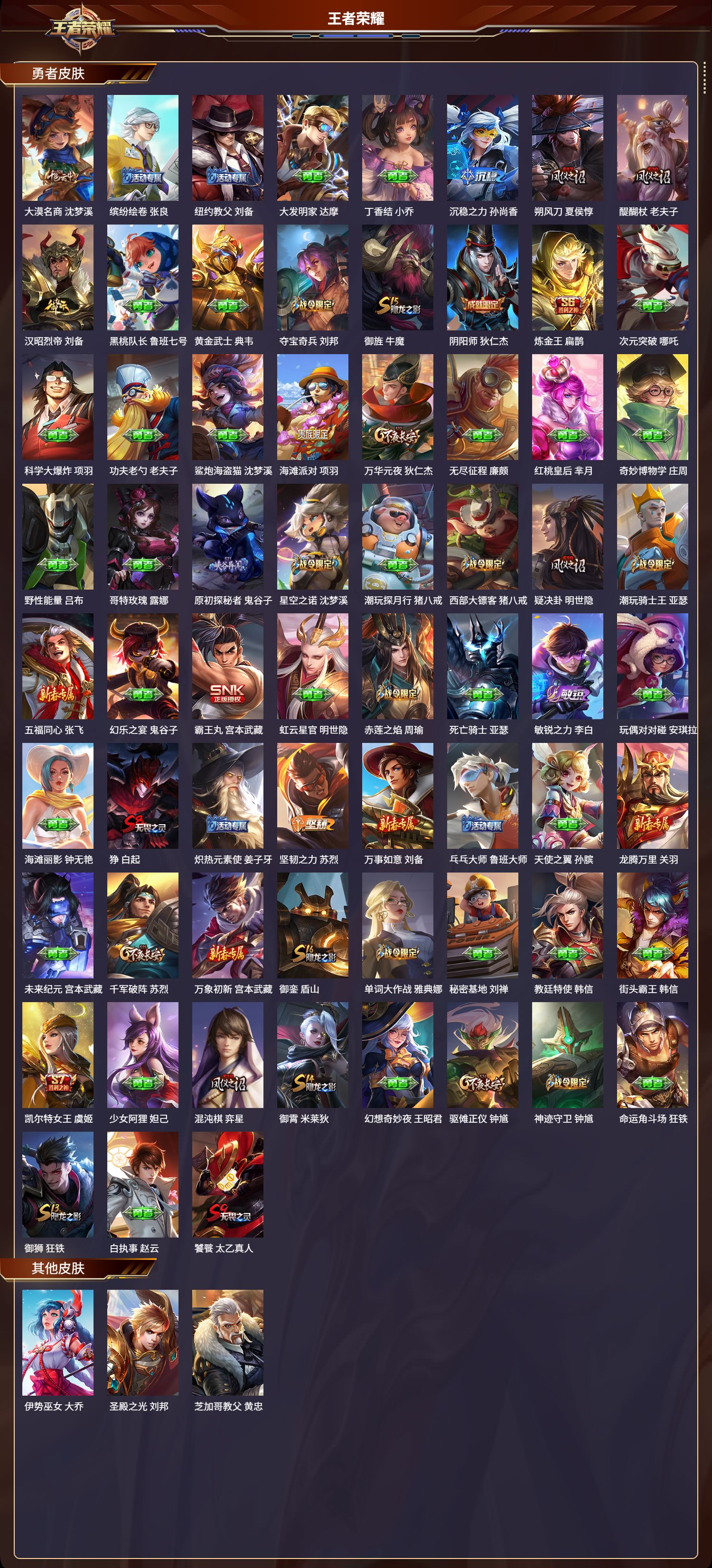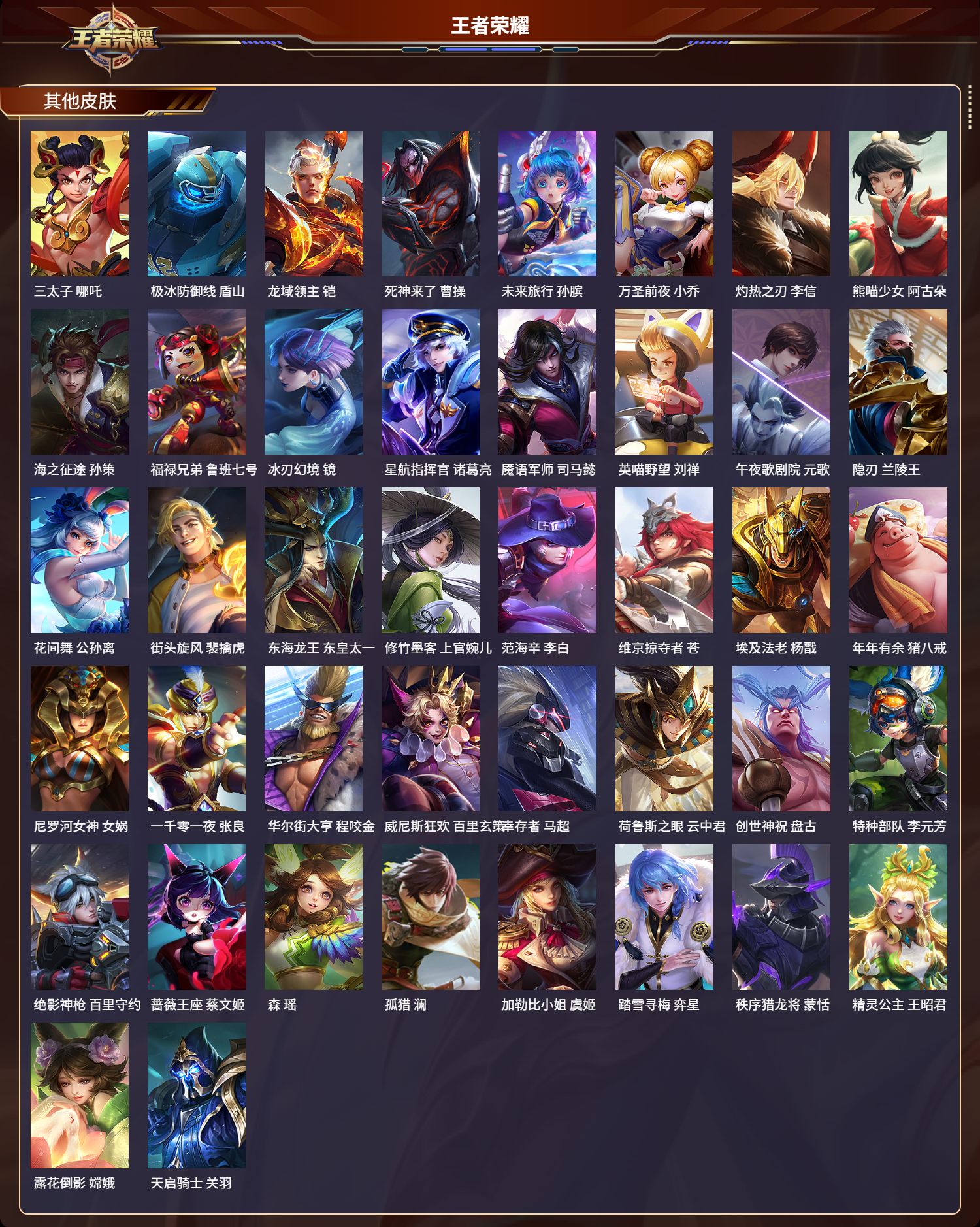 【45,其他皮肤】伊势巫女,大乔,圣殿之光,刘邦,芝加哥教父,黄忠,三太子,哪吒,极冰防御线,盾山,龙域领主,铠,死神来了,曹操,未来旅行,孙膑,万圣前夜,小乔,灼热之刃,李信,熊喵少女,阿古朵,海之征途,孙策,福禄兄弟,鲁班七号,冰刃幻境,镜,星航指挥官,诸葛亮,魇语军师,司马懿,英喵野望,刘禅,午夜歌剧院,元歌,隐刃,兰陵王,花间舞,公孙离,街头旋风,裴擒虎,东海龙王,东皇太一,修竹墨客,上官婉儿,范海辛,李白,维京掠夺者,苍,埃及法老,杨戬,年年有余,猪八戒,尼罗河女神,女娲,一千零一夜,张良,华尔街大亨,程咬金,威尼斯狂欢,百里玄策,幸存者,马超,荷鲁斯之眼,云中君,创世神祝,盘古,特种部队,李元芳,绝影神枪,百里守约,蔷薇王座,蔡文姬,森,瑶,孤猎,澜,加勒比小姐,虞姬,踏雪寻梅,弈星,秩序猎龙将,蒙恬,精灵公主,王昭君,露花倒影,嫦娥,天启骑士,关羽,