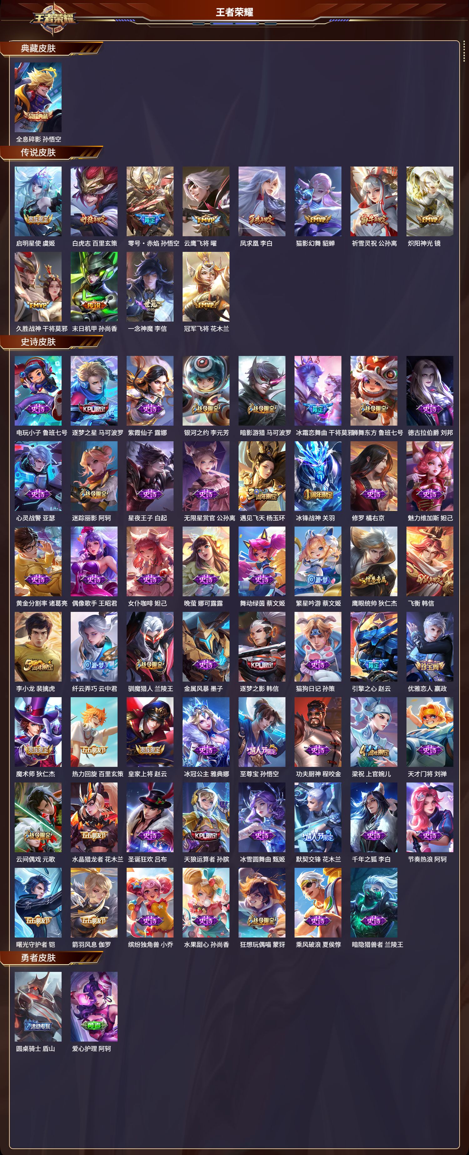 【55,史诗皮肤】电玩小子,鲁班七号,逐梦之星,马可波罗,紫霞仙子,露娜,银河之约,李元芳,暗影游猎,马可波罗,冰霜恋舞曲,干将莫邪,狮舞东方,鲁班七号,德古拉伯爵,刘邦,心灵战警,亚瑟,迷踪丽影,阿轲,星夜王子,白起,无限星赏官,公孙离,遇见飞天,杨玉环,冰锋战神,关羽,修罗,橘右京,魅力维加斯,妲己,黄金分割率,诸葛亮,偶像歌手,王昭君,女仆咖啡,妲己,晚萤,娜可露露,舞动绿茵,蔡文姬,繁星吟游,蔡文姬,鹰眼统帅,狄仁杰,飞衡,韩信,李小龙,裴擒虎,纤云弄巧,云中君,驯魔猎人,兰陵王,金属风暴,墨子,逐梦之影,韩信,猫狗日记,孙策,引擎之心,赵云,优雅恋人,嬴政,魔术师,狄仁杰,热力回旋,百里玄策,皇家上将,赵云,冰冠公主,雅典娜,至尊宝,孙悟空,功夫厨神,程咬金,梁祝,上官婉儿,天才门将,刘禅,云间偶戏,元歌,水晶猎龙者,花木兰,圣诞狂欢,吕布,天狼运算者,孙膑,冰雪圆舞曲,甄姬,默契交锋,花木兰,千年之狐,李白,节奏热浪,阿轲,曙光守护者,铠,箭羽风息,伽罗,缤纷独角兽,小乔,水果甜心,孙尚香,狂想玩偶喵,蒙犽,乘风破浪,夏侯惇,暗隐猎兽者,兰陵王,
