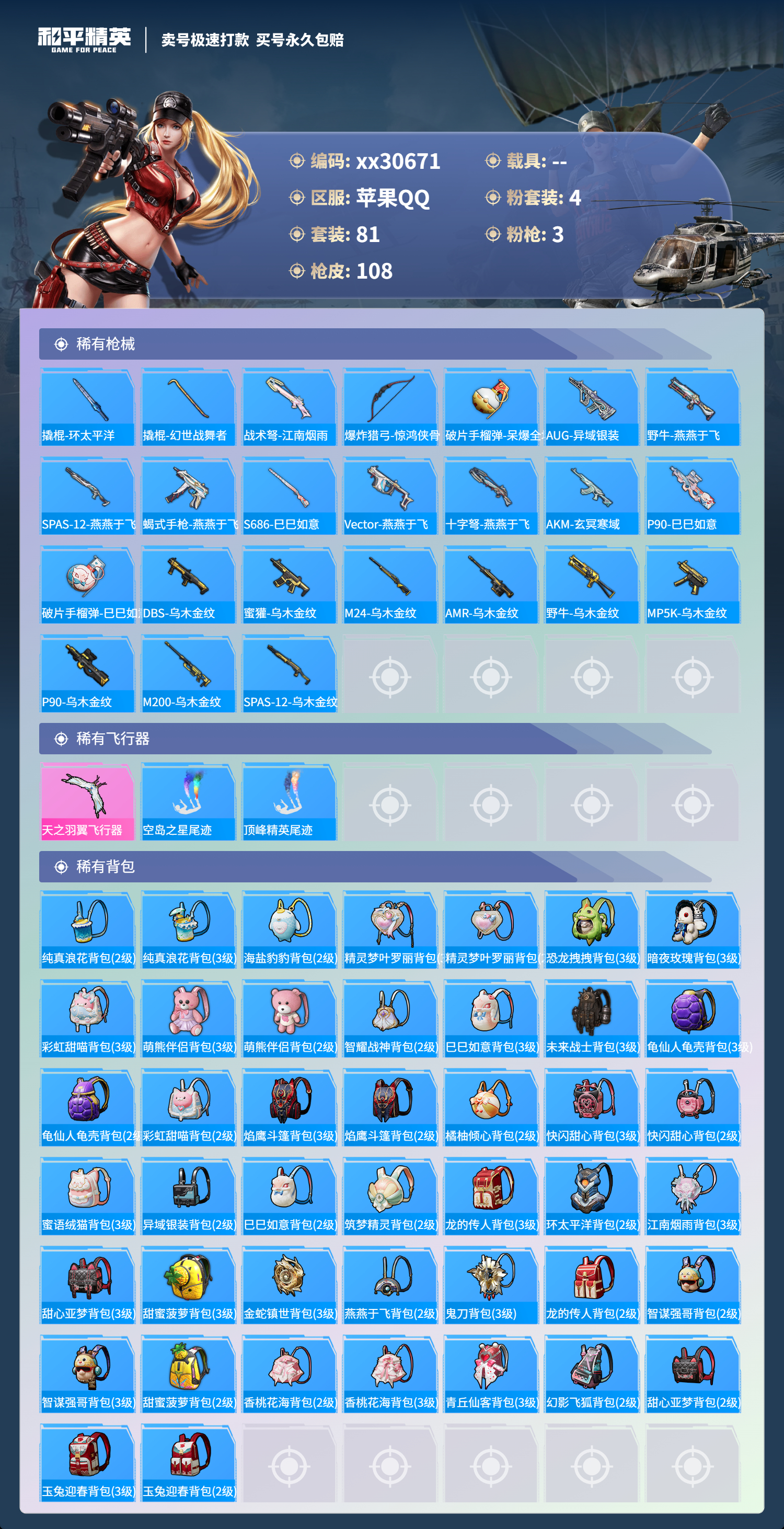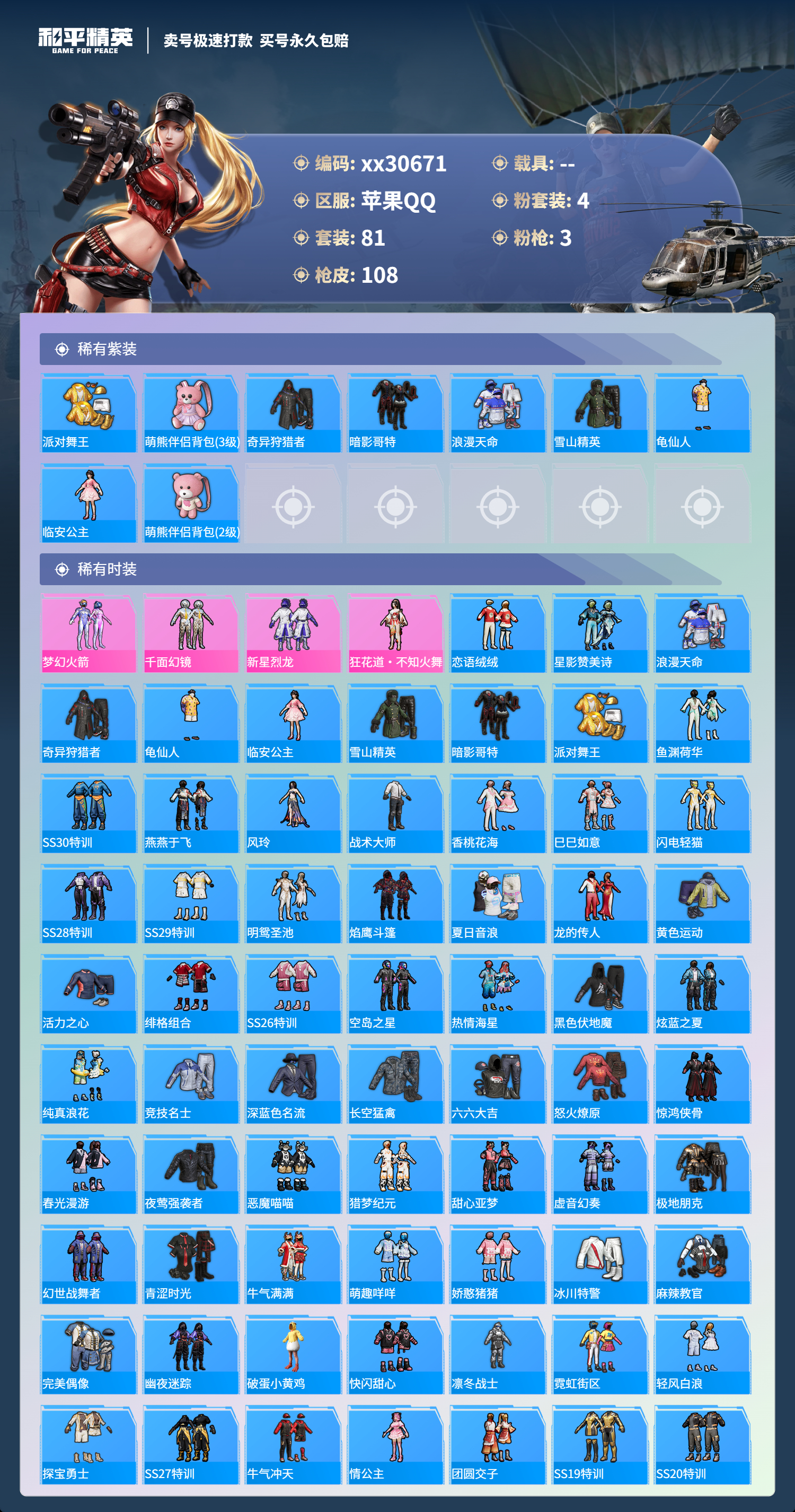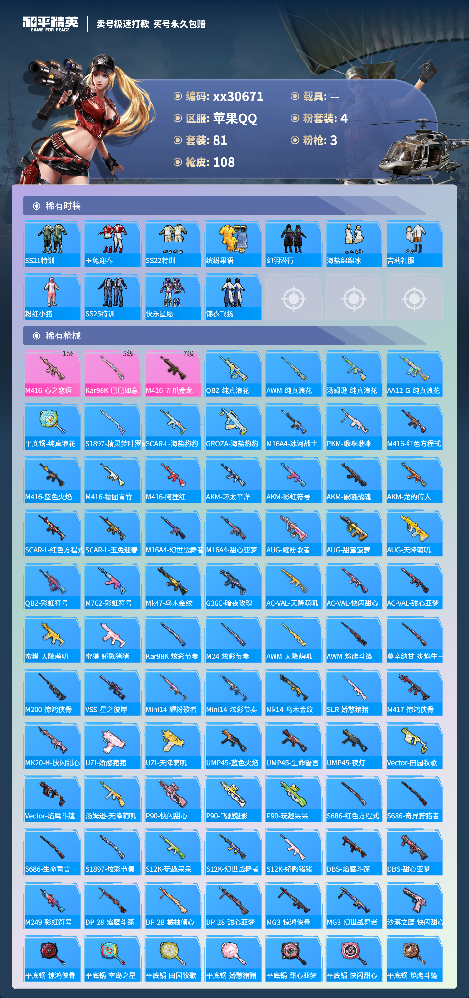 PX_1900448-@30671,可二次,苹果手Q-7王牌印记-4粉装-3特效枪-0载具-34868热力值-81套装-108枪皮-1卓越印记-0传奇印记