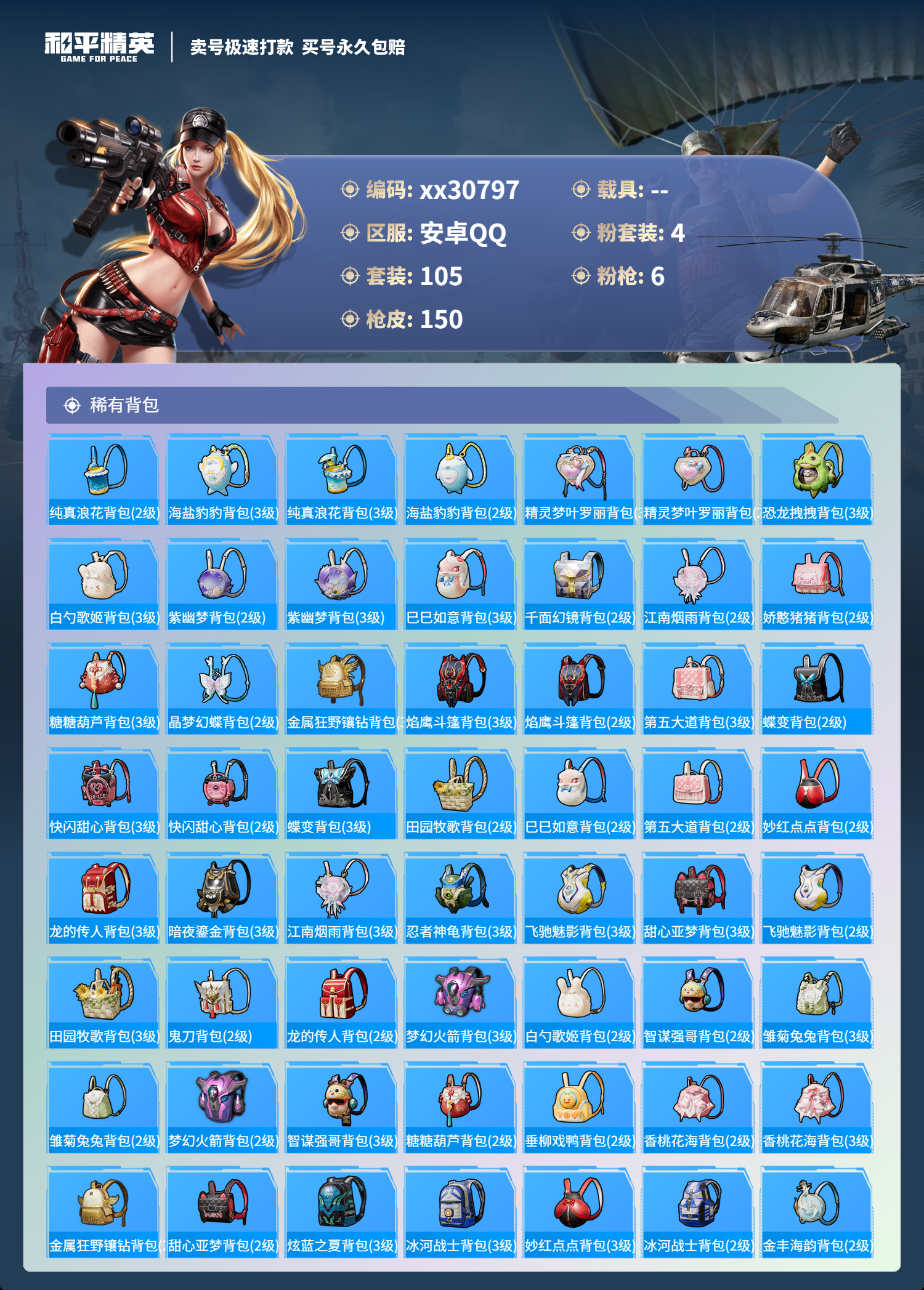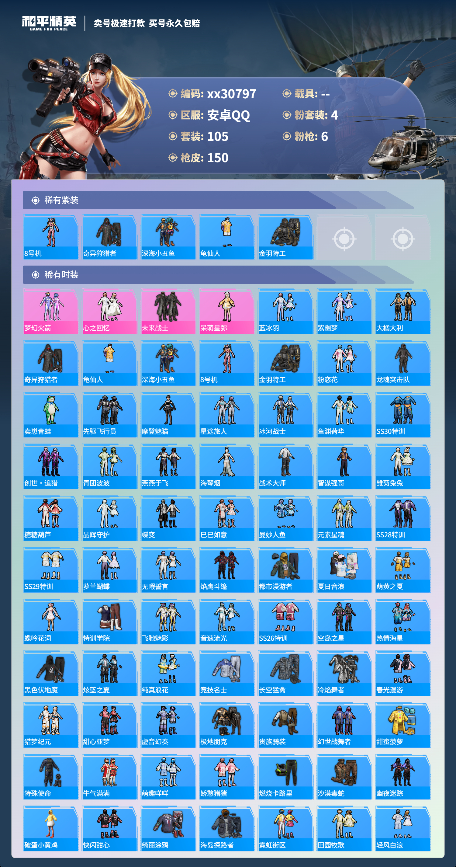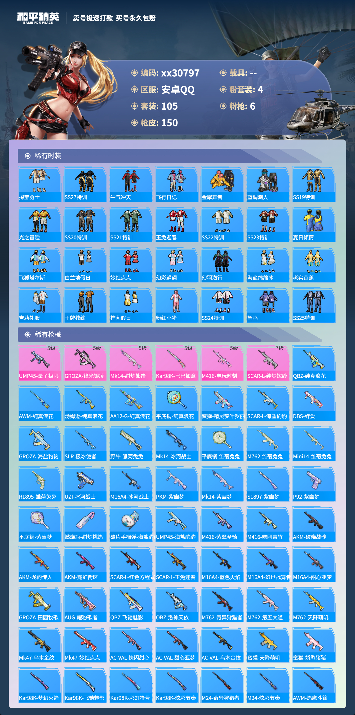 PX_1904477-@30797,可二次,安卓手Q-11王牌印记-4粉装-6特效枪-0载具-45275热力值-105套装-150枪皮-1卓越印记-1传奇印记