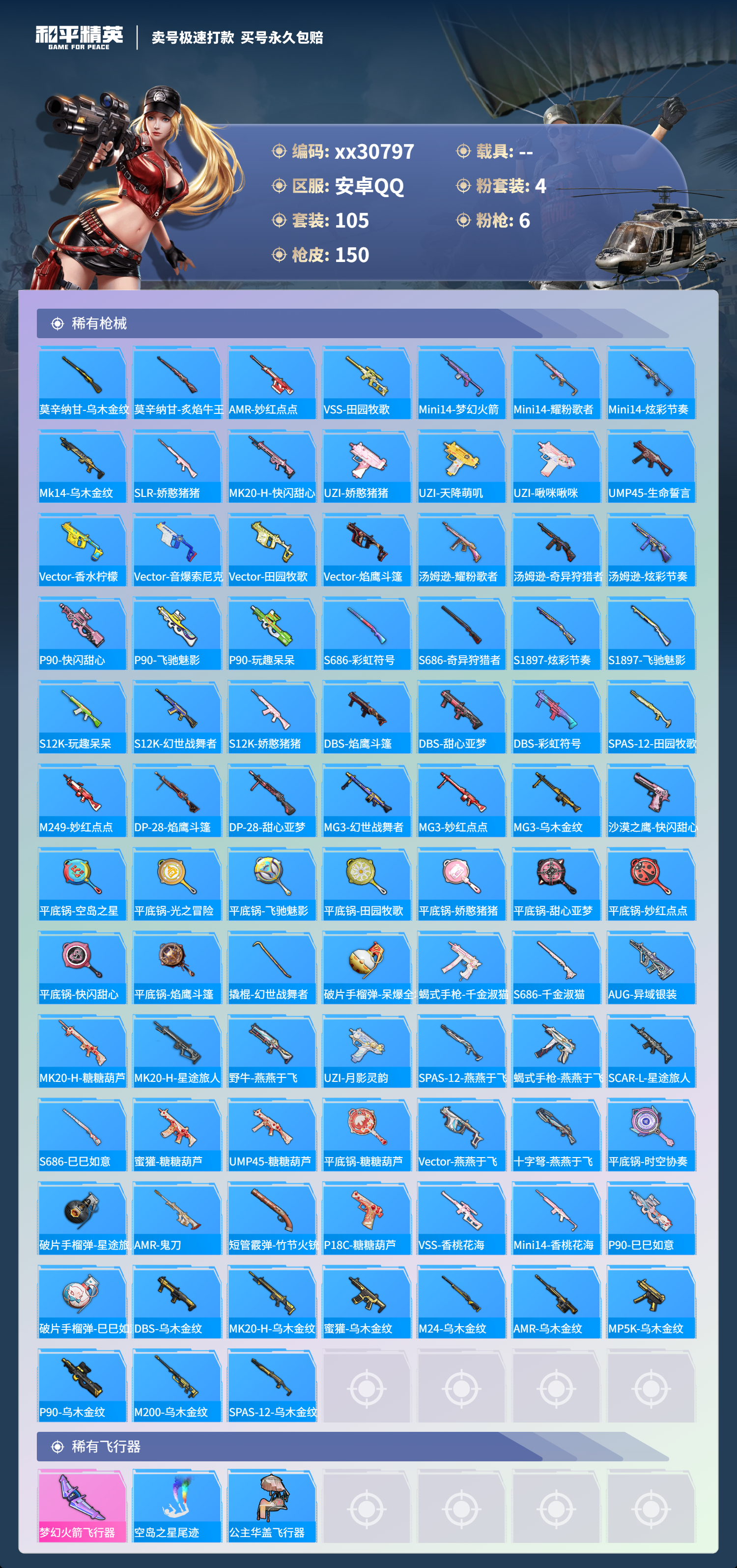 【150稀有枪械】,UMP45-量子极限/5级,QBZ-纯真浪花,AWM-纯真浪花,汤姆逊-纯真浪花,DBS-乌木金纹,AA12-G-纯真浪花,平底锅-纯真浪花,蜜獾-精灵梦叶罗丽,SCAR-L-海盐豹豹,DBS-绊爱,GROZA-海盐豹豹,GROZA-镜光银凌/5级,Mk14-甜梦熊击/5级,Kar98K-巳巳如意/5级,SLR-极冰使者,野牛-雏菊兔兔,Mk14-冰河战士,平底锅-雏菊兔兔,M762-雏菊兔兔,Mini14-雏菊兔兔,R1895-雏菊兔兔,UZI-冰河战士,M16A4-冰河战士,MK20-H-乌木金纹,M416-电玩时刻/5级,SCAR-L-纯梦嫁纱/7级,PKM-紫幽梦,Mk14-紫幽梦,蜜獾-乌木金纹,S1897-紫幽梦,P92-紫幽梦,平底锅-紫幽梦,燃烧瓶-甜梦桃焰,破片手榴弹-海盐豹豹,UMP45-海盐豹豹,M416-紫翼圣骑,M416-糯团青竹,AKM-破晓战魂,AKM-龙的传人,AKM-霓虹街区,SCAR-L-红色方程式,SCAR-L-玉兔迎春,M16A4-蓝色火焰,M16A4-幻世战舞者,M16A4-甜心亚梦,GROZA-田园牧歌,AUG-耀粉歌者,QBZ-飞驰魅影,QBZ-洛神天依,M762-奇异狩猎者,M762-第五大道,M762-天降萌叽,Mk47-乌木金纹,Mk47-妙红点点,AC-VAL-快闪甜心,AC-VAL-甜心亚梦,AC-VAL-乌木金纹,蜜獾-天降萌叽,蜜獾-娇憨猪猪,Kar98K-梦幻火箭,Kar98K-飞驰魅影,Kar98K-彩虹符号,Kar98K-炫彩节奏,M24-乌木金纹,M24-奇异狩猎者,M24-炫彩节奏,AWM-焰鹰斗篷,莫辛纳甘-乌木金纹,莫辛纳甘-炙焰牛王,AMR-乌木金纹,AMR-妙红点点,VSS-田园牧歌,Mini14-梦幻火箭,Mini14-耀粉歌者,Mini14-炫彩节奏,Mk14-乌木金纹,SLR-娇憨猪猪,MK20-H-快闪甜心,UZI-娇憨猪猪,UZI-天降萌叽,UZI-啾咪啾咪,UMP45-生命誓言,Vector-香水柠檬,Vector-音爆索尼克,Vector-田园牧歌,Vector-焰鹰斗篷,汤姆逊-耀粉歌者,汤姆逊-奇异狩猎者,汤姆逊-炫彩节奏,MP5K-乌木金纹,P90-乌木金纹,P90-快闪甜心,P90-飞驰魅影,P90-玩趣呆呆,S686-彩虹符号,S686-奇异狩猎者,S1897-炫彩节奏,S1897-飞驰魅影,S12K-玩趣呆呆,S12K-幻世战舞者,S12K-娇憨猪猪,DBS-焰鹰斗篷,DBS-甜心亚梦,DBS-彩虹符号,SPAS-12-田园牧歌,M249-妙红点点,DP-28-焰鹰斗篷,DP-28-甜心亚梦,MG3-幻世战舞者,MG3-妙红点点,MG3-乌木金纹,沙漠之鹰-快闪甜心,平底锅-空岛之星,平底锅-光之冒险,平底锅-飞驰魅影,平底锅-田园牧歌,平底锅-娇憨猪猪,平底锅-甜心亚梦,平底锅-妙红点点,平底锅-快闪甜心,平底锅-焰鹰斗篷,撬棍-幻世战舞者,破片手榴弹-呆爆全场,蝎式手枪-千金淑猫,S686-千金淑猫,AUG-异域银装,MK20-H-糖糖葫芦,MK20-H-星途旅人,野牛-燕燕于飞,UZI-月影灵韵,M200-乌木金纹,SPAS-12-燕燕于飞,蝎式手枪-燕燕于飞,SCAR-L-星途旅人,S686-巳巳如意,蜜獾-糖糖葫芦,UMP45-糖糖葫芦,SPAS-12-乌木金纹,平底锅-糖糖葫芦,Vector-燕燕于飞,十字弩-燕燕于飞,平底锅-时空协奏,破片手榴弹-星途旅人,AMR-鬼刀,短管霰弹-竹节火铳,P18C-糖糖葫芦,VSS-香桃花海,Mini14-香桃花海,P90-巳巳如意,破片手榴弹-巳巳如意,