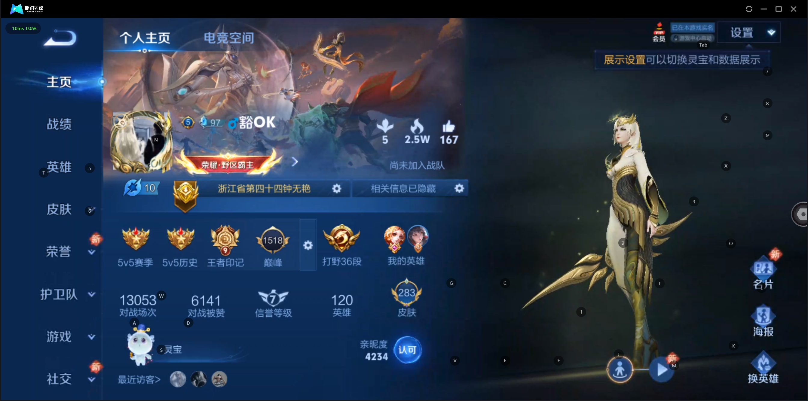 W10022【安卓区V8】可二次实名,英雄104,皮肤161,典藏:李白鸣剑.曳