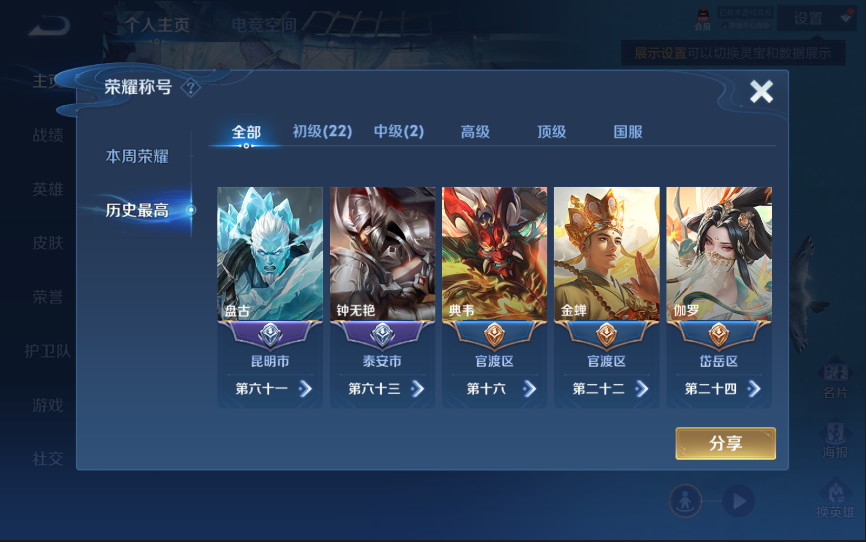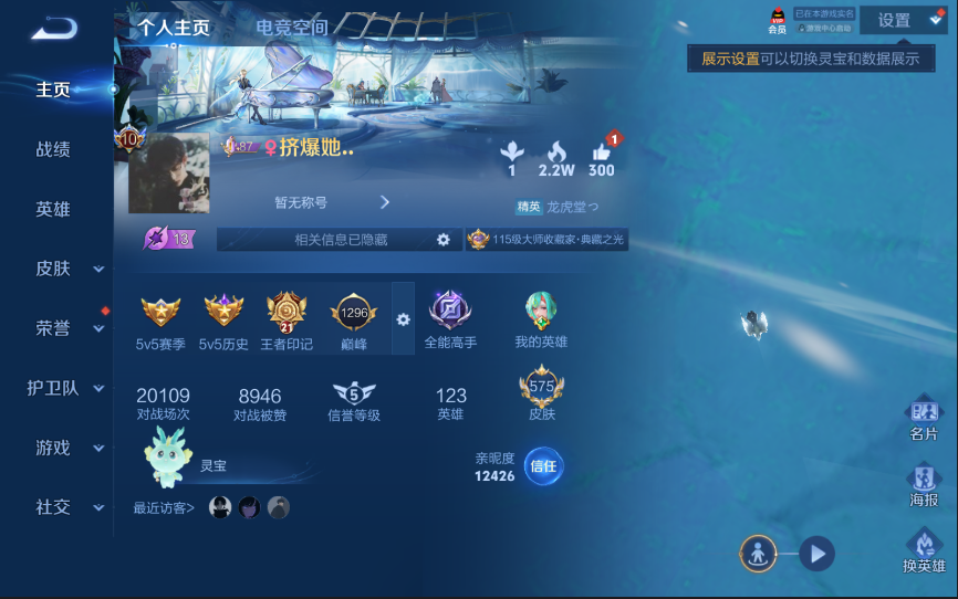 W10022【安卓区V8】可二次实名,英雄104,皮肤161,典藏:李白鸣剑.曳