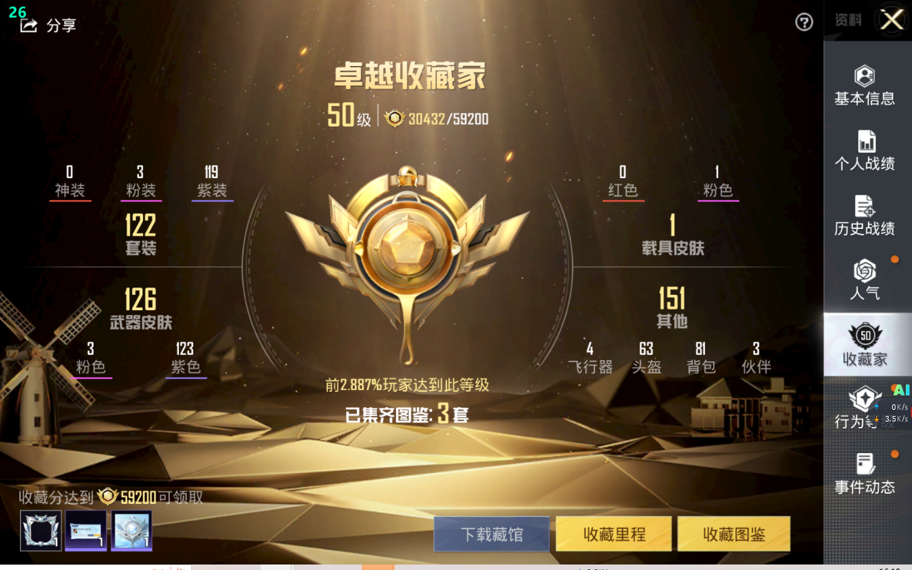 PX_1960389-可二次 等级61级 120套装 138枪皮 历史Z高7星 1卓越印记 8王牌印记 热力值45403 1车3粉3特效 玛莎拉蒂Quattroporte夜幕蓝 满级M4五爪金龙 5级AKM梦之光华 满级Kar98K巳巳如意 圣堂之誓 仲夏莫吉托 朗月武圣 迅捷狂鲨 浪