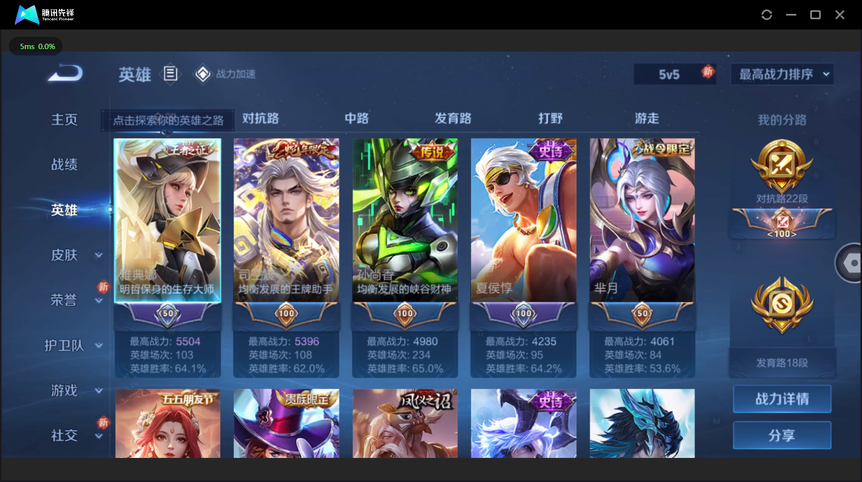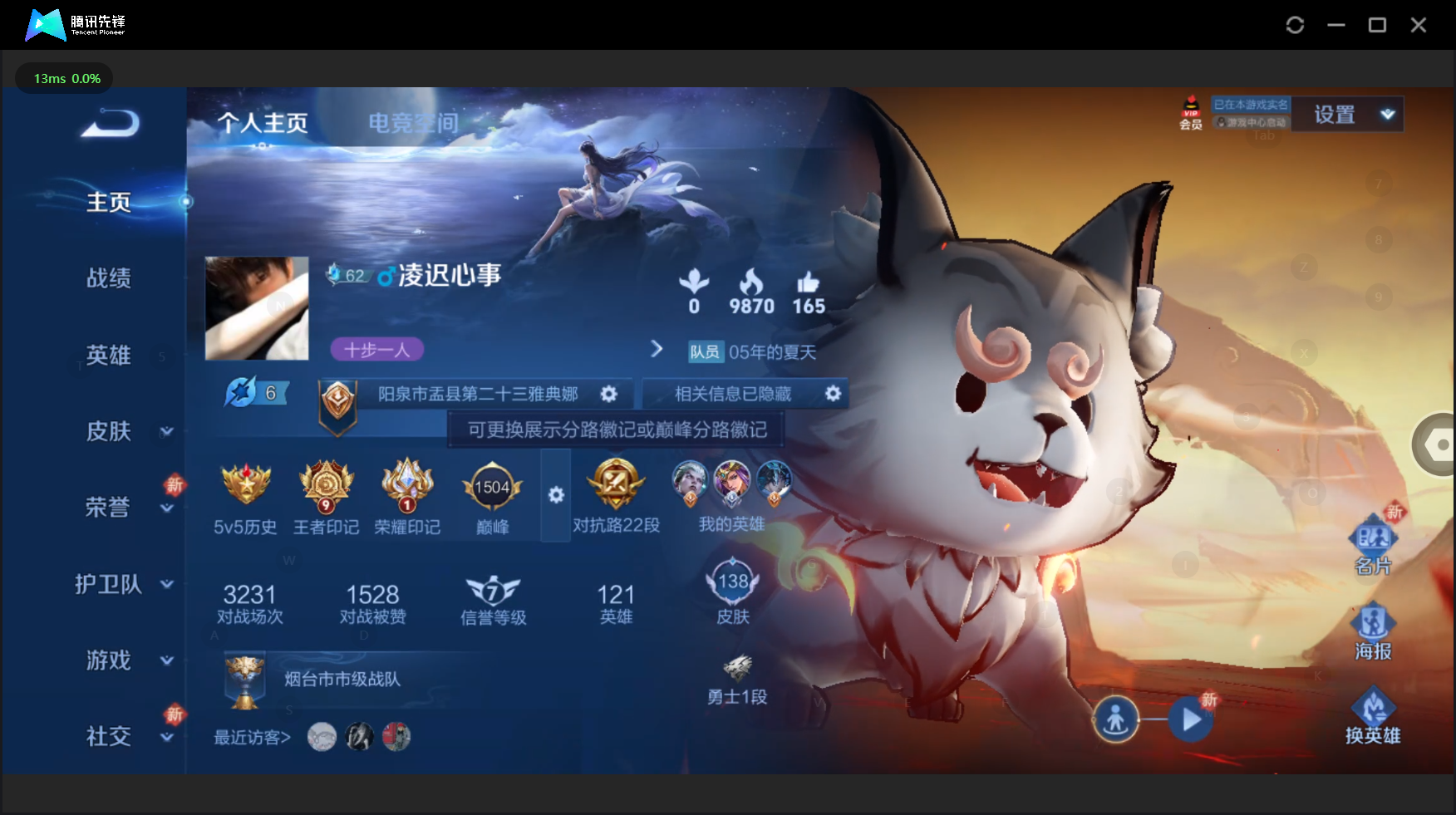 W10022【安卓区V8】可二次实名,英雄104,皮肤161,典藏:李白鸣剑.曳