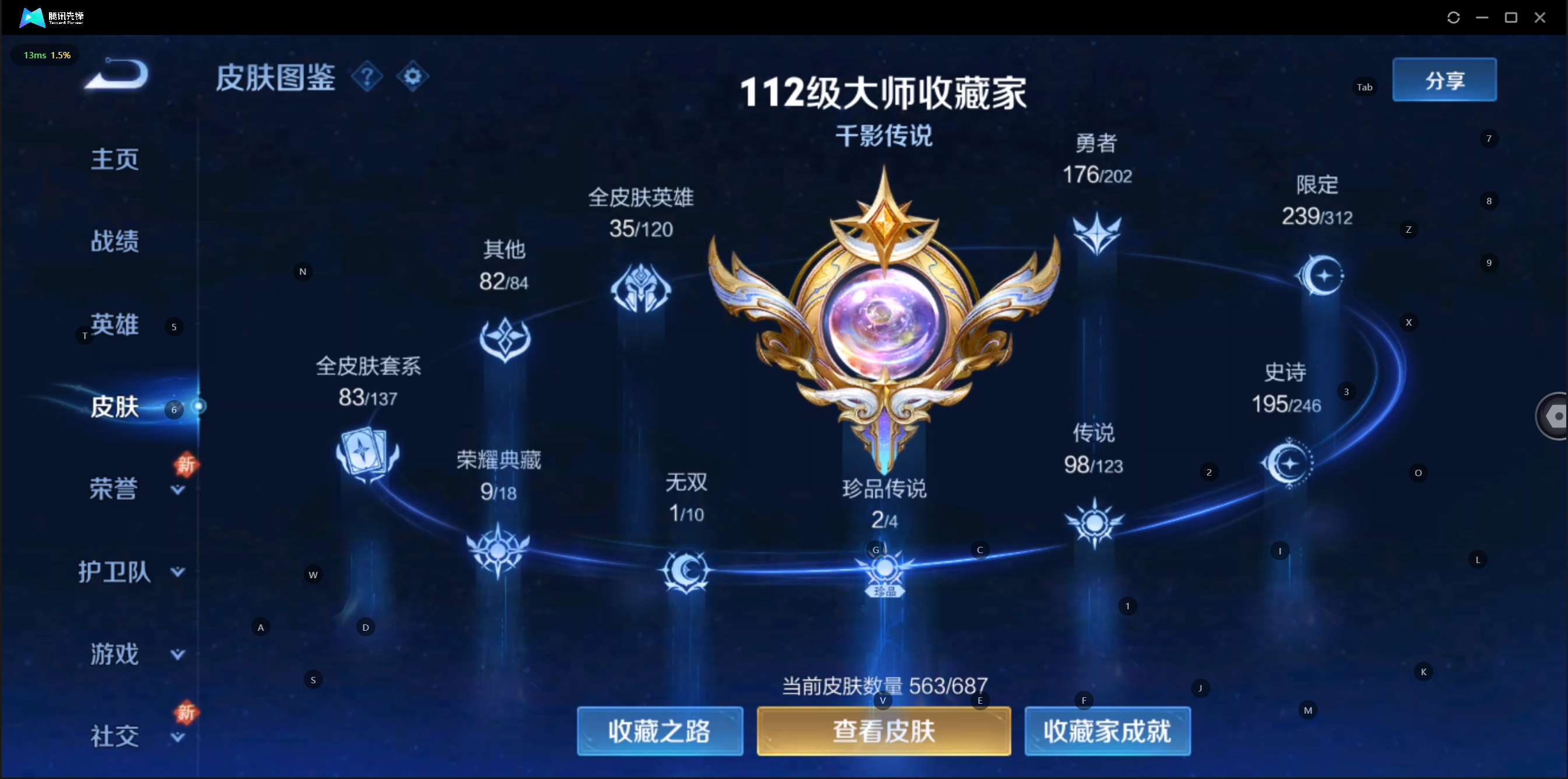 PX_1993905-可二次v10,38.4W贵族积分,2.2W流光积分,563皮肤,10典藏,1无双,1珍品,98传说,8星传说,岁雨灵司,玉鸾吟,时之愿境,荆棘舞步,未来机甲,幻海之心,幽冥火,幽冥之眼,青丘·九尾,幻阙歌,银·白咏叹调,九霄神辉,鸣剑·曳影,天鹅之梦,无限飓风号,星域神启,全息碎影,杀手不太冷,怪盗基德,江户川柯南,李逍遥,天魔缭乱,白虎志,落雪白狼,浮生妄,凤求凰,时之祈愿女,至