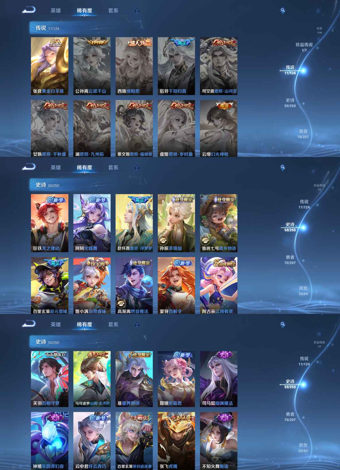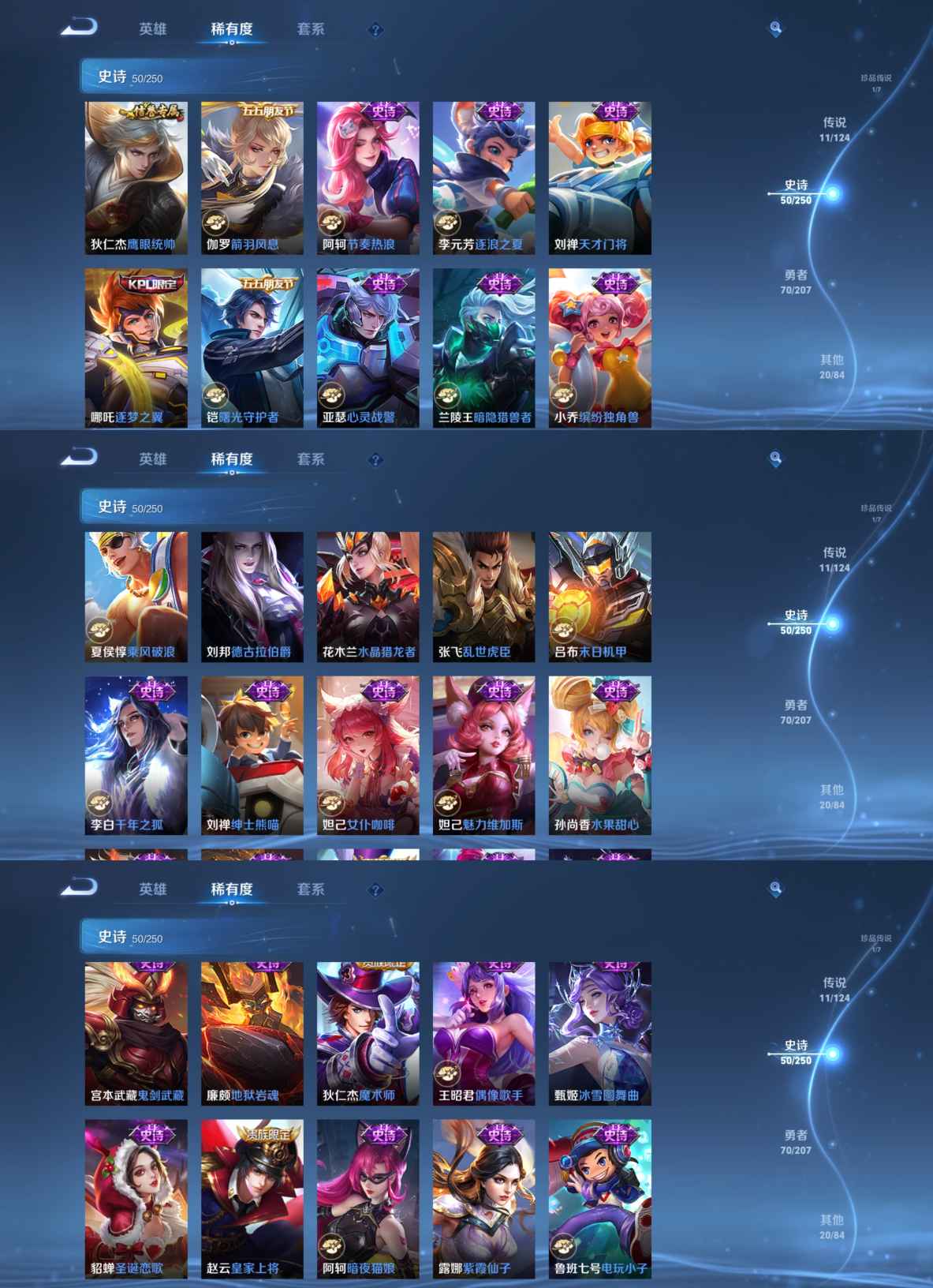 【史诗皮肤】,蔬乡物语,蔬乡物语,茶境仙,器灵·浮梦炉,布丁狗之约,谧流熔炉,电玩小子,逐梦之翼,龙之律动,虎魄,山海·玄木吟,聚星闪耀,江河有灵,幻夜行动,超元猎域,完美运算,百解令,暖冬絮语,漠中幻影,化蝶舞,星界游侠,魅语,拒霜思,女仆咖啡,魅力维加斯,魔术师,鹰眼统帅,圣诞恋歌,箭羽风息,鬼剑武藏,水晶猎龙者,曙光守护者,暗隐猎兽者,千年之狐,逐浪之夏,地狱岩魂,德古拉伯爵,绅士熊喵,天才门将,紫霞仙子,末日机甲,暗渊魔法,水果甜心,偶像歌手,乘风破浪,缤纷独角兽,心灵战警,纤云弄巧,乱世虎臣,皇家上将,冰雪圆舞曲,乐园奇幻夜,暗夜猫娘,节奏热浪,原初追逐者,