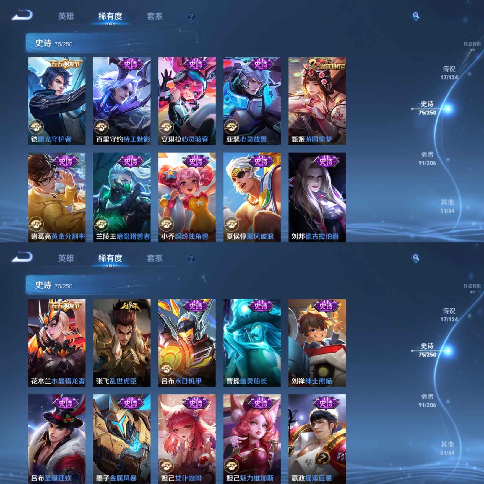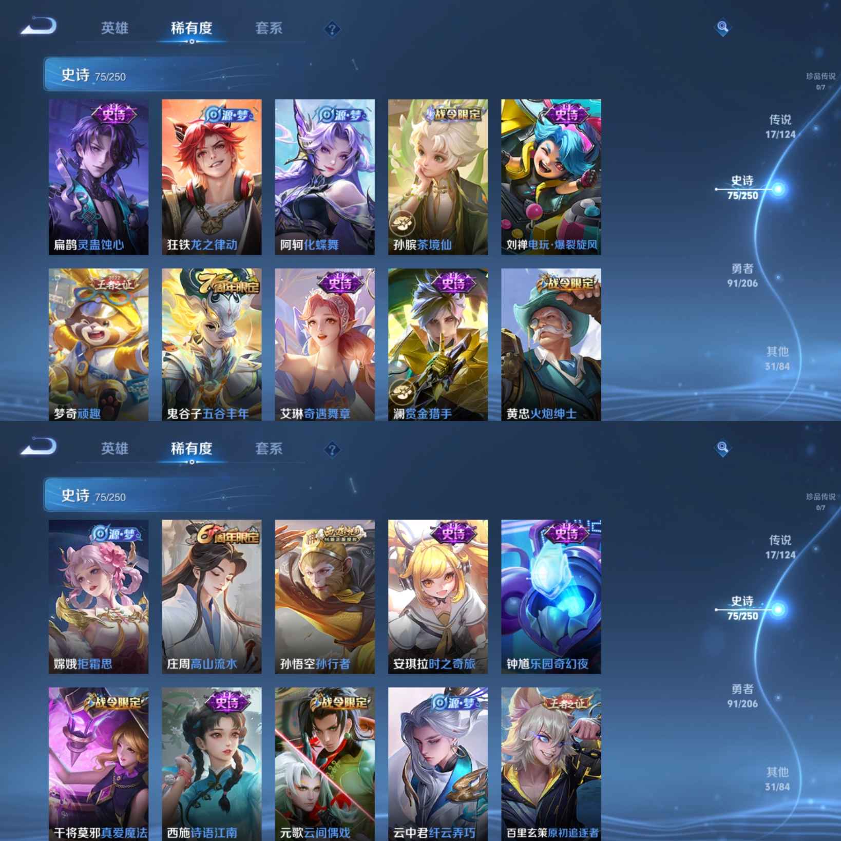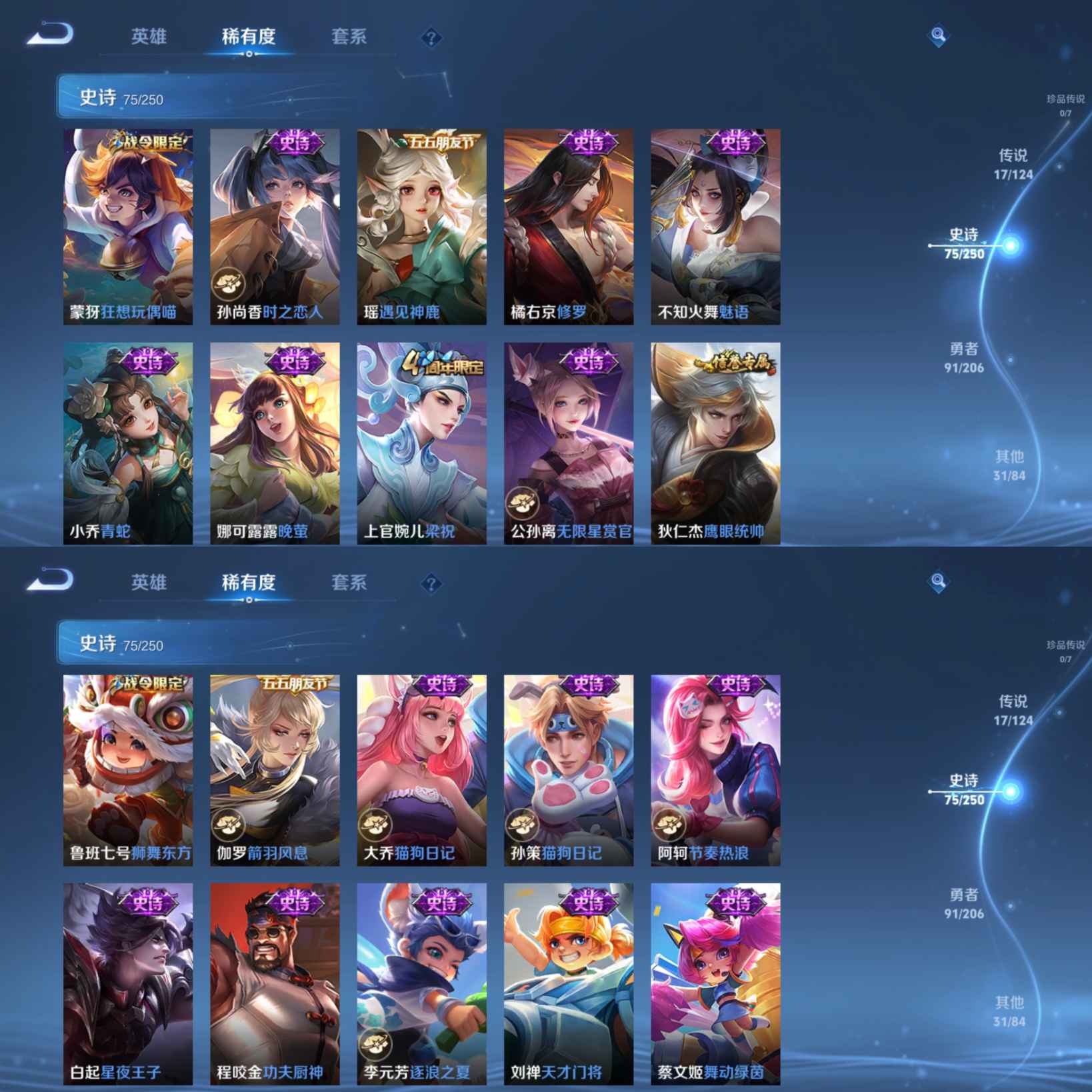 【史诗皮肤】,茶境仙,布丁狗之约,谧流熔炉,电玩小子,灵蛊蚀心,孙行者,龙之律动,诗语江南,遇见神鹿,完美运算,化蝶舞,顽趣,魅语,舞动绿茵,幽灵船长,拒霜思,功夫厨神,女仆咖啡,魅力维加斯,猫狗日记,魔术师,鹰眼统帅,圣诞恋歌,箭羽风息,真爱魔法,无限星赏官,鬼剑武藏,水晶猎龙者,修罗,火炮绅士,曙光守护者,暗隐猎兽者,逐浪之夏,地狱岩魂,德古拉伯爵,绅士熊喵,天才门将,紫霞仙子,狮舞东方,圣诞狂欢,末日机甲,狂想玩偶喵,金属风暴,晚萤,梁祝,猫狗日记,水果甜心,蔷薇恋人,时之恋人,偶像歌手,乘风破浪,缤纷独角兽,青蛇,心灵战警,摇滚巨星,暗夜贵公子,云间偶戏,纤云弄巧,乱世虎臣,皇家上将,冰雪圆舞曲,游园惊梦,乐园奇幻夜,王者之锤,黄金分割率,高山流水,五谷丰年,未来纪元,奇遇舞章,赏金猎手,暗夜猫娘,节奏热浪,心灵骇客,时之奇旅,星夜王子,特工魅影,原初追逐者,