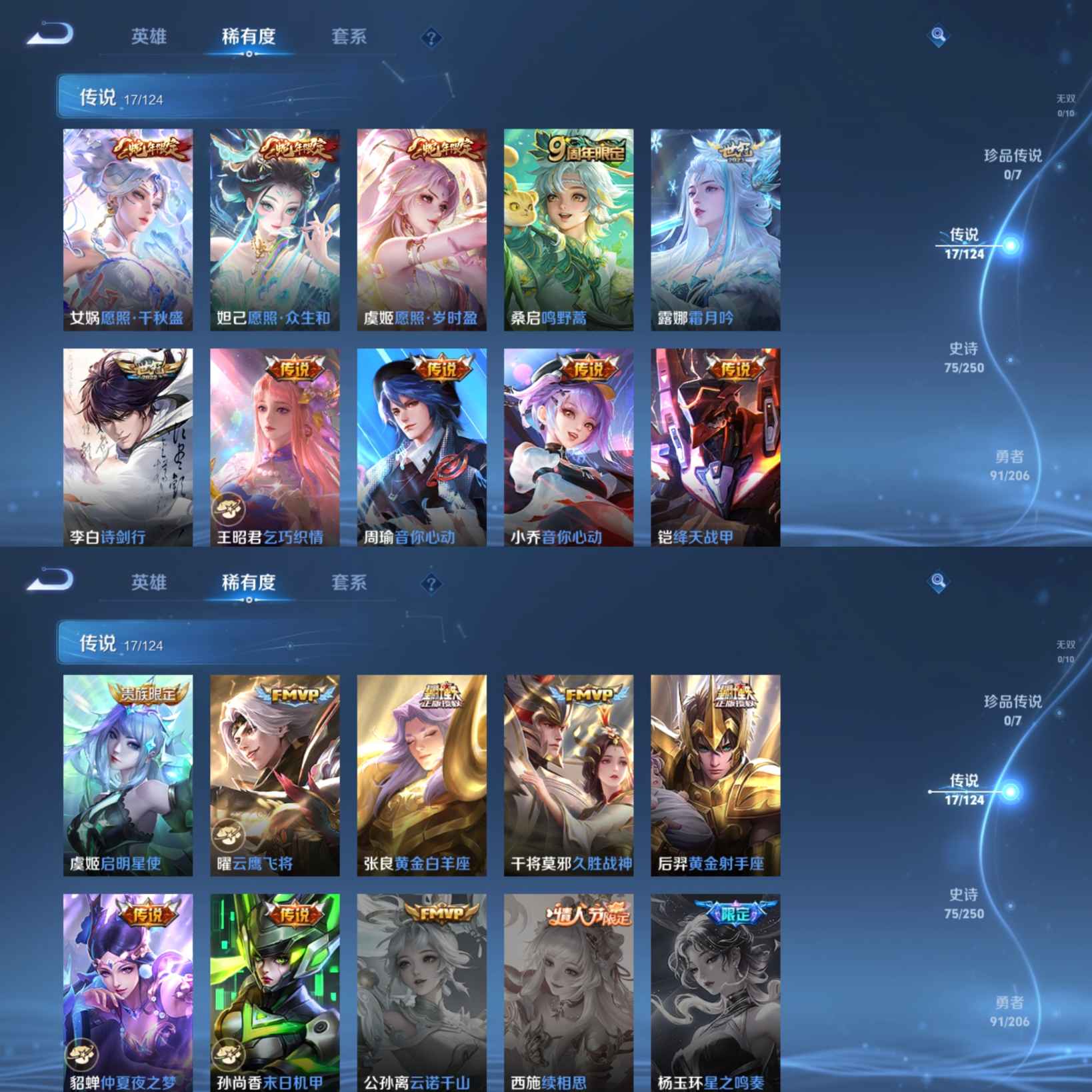【传说皮肤】,鸣野蒿,霜月吟,愿照·千秋盛,愿照·众生和,愿照·岁时盈,诗剑行,仲夏夜之梦,久胜战神,黄金射手座,绛天战甲,末日机甲,乞巧织情,音你心动,云鹰飞将,启明星使,黄金白羊座,音你心动,