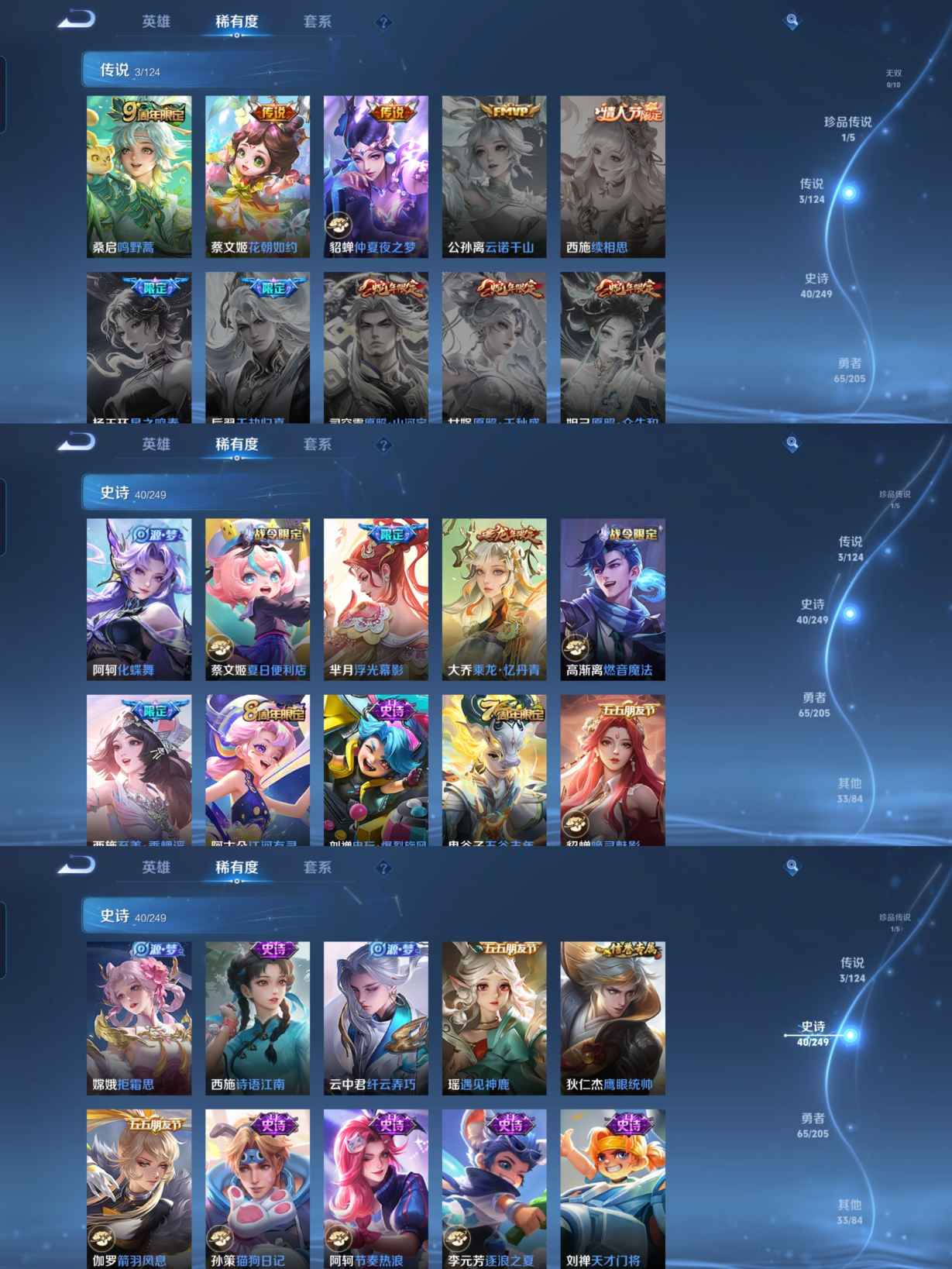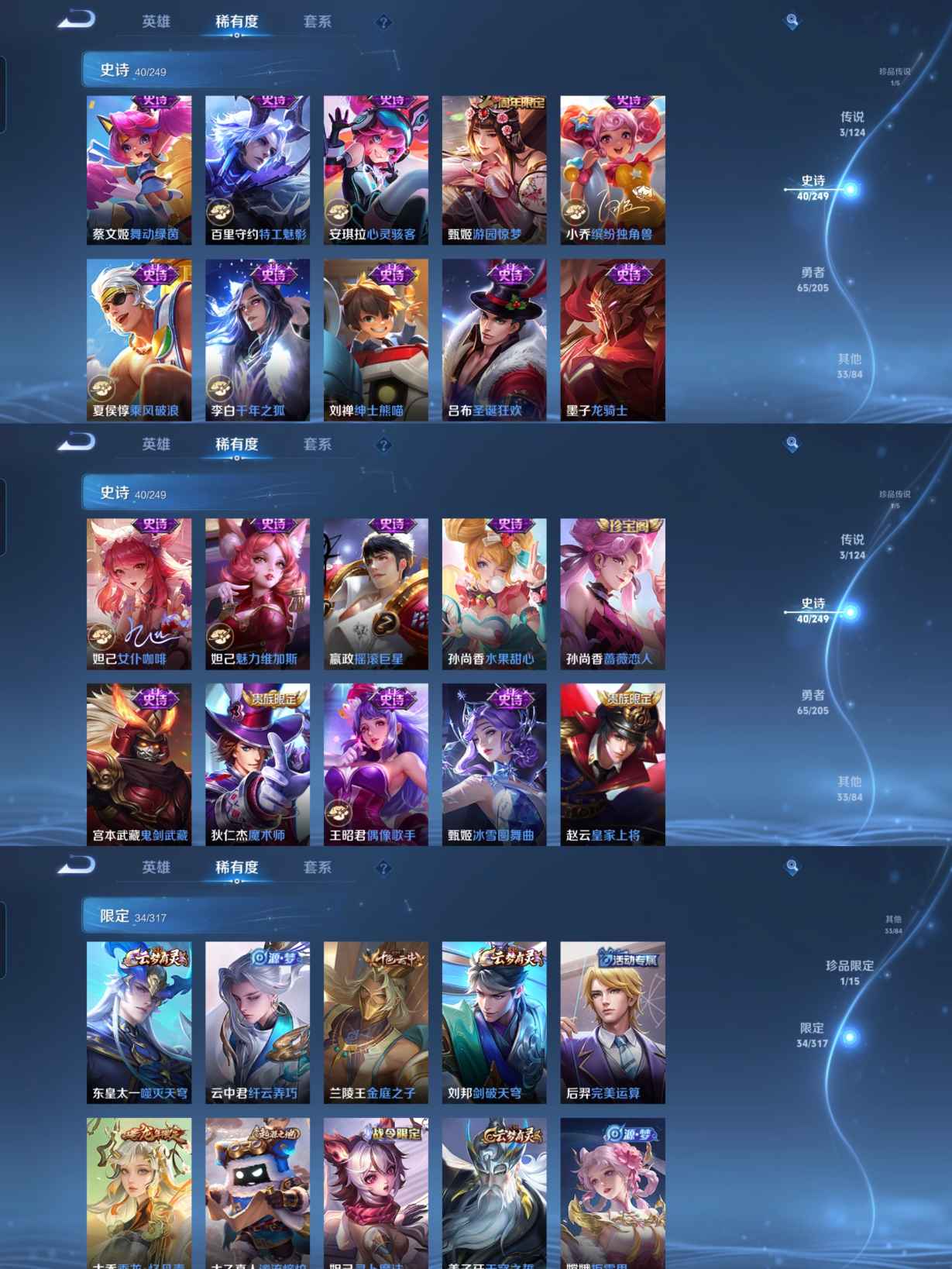 【史诗皮肤】,诗语江南,遇见神鹿,至美·乘鲤谣,浮光幕影,夏日便利店,王牌新星,聚星闪耀,江河有灵,乘龙·忆丹青,完美运算,舞动绿茵,拒霜思,女仆咖啡,魅力维加斯,魔术师,鹰眼统帅,箭羽风息,鬼剑武藏,千年之狐,逐浪之夏,绅士熊喵,天才门将,圣诞狂欢,龙骑士,猫狗日记,水果甜心,蔷薇恋人,偶像歌手,乘风破浪,缤纷独角兽,摇滚巨星,纤云弄巧,皇家上将,冰雪圆舞曲,游园惊梦,五谷丰年,唤灵魅影,节奏热浪,心灵骇客,特工魅影,