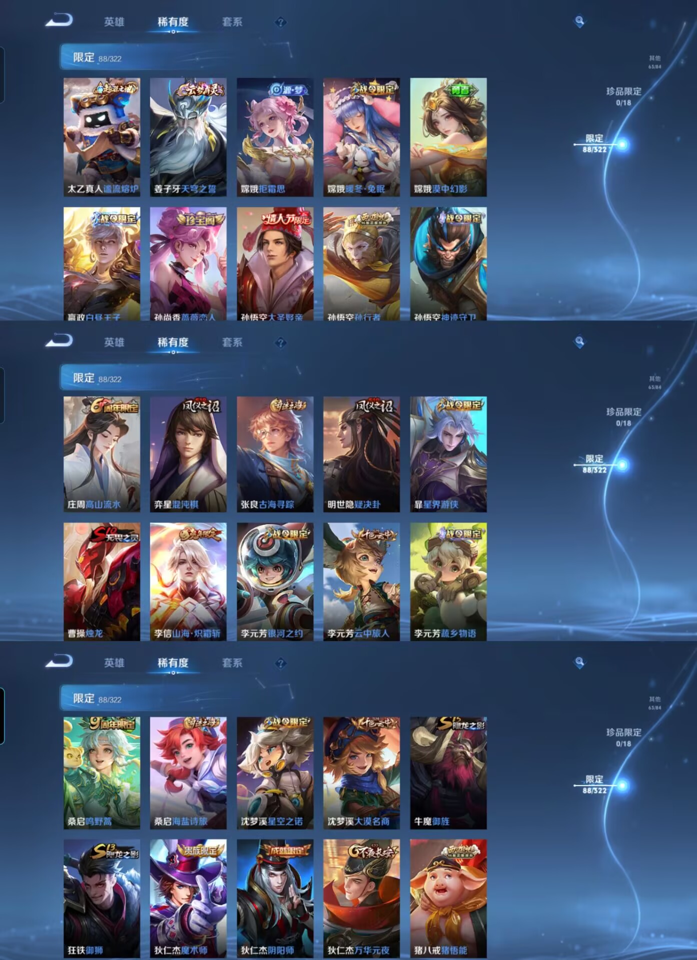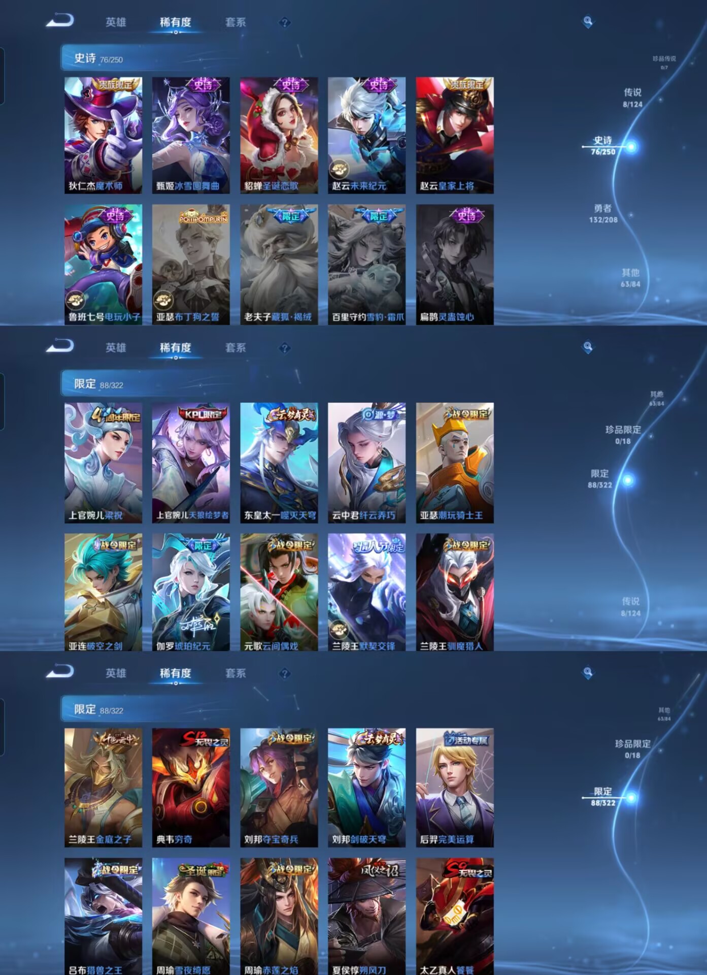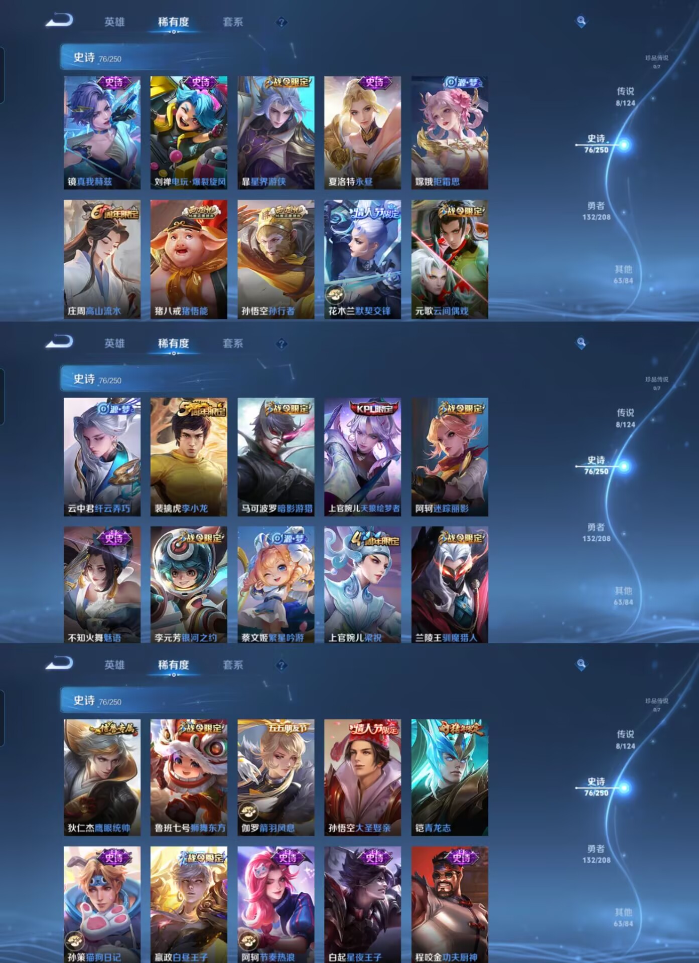 【史诗皮肤】,蔬乡物语,蔬乡物语,破空之剑,默契交锋,青龙志,谧流熔炉,电玩小子,逐梦之星,天狼绘梦者,大圣娶亲,孙行者,真我赫兹,夏日便利店,琥珀纪元,雪夜绮愿,聚星闪耀,江河有灵,决胜大满贯,超元猎域,完美运算,漠中幻影,顽岩魄,化蝶舞,星界游侠,魅语,舞动绿茵,幽灵船长,繁星吟游,拒霜思,功夫厨神,女仆咖啡,魅力维加斯,魔术师,鹰眼统帅,圣诞恋歌,箭羽风息,鬼剑武藏,白龙吟,水晶猎龙者,曙光守护者,暗隐猎兽者,驯魔猎人,千年之狐,逐浪之夏,银河之约,德古拉伯爵,绅士熊喵,天才门将,狮舞东方,圣诞狂欢,末日机甲,暗影游猎,金属风暴,梁祝,李小龙,猫狗日记,水果甜心,蔷薇恋人,乘风破浪,缤纷独角兽,冰冠公主,心灵战警,暗夜贵公子,白昼王子,云间偶戏,纤云弄巧,乱世虎臣,皇家上将,冰雪圆舞曲,游园惊梦,黄金分割率,猪悟能,高山流水,未来纪元,永昼,节奏热浪,迷踪丽影,心灵骇客,星夜王子,特工魅影,