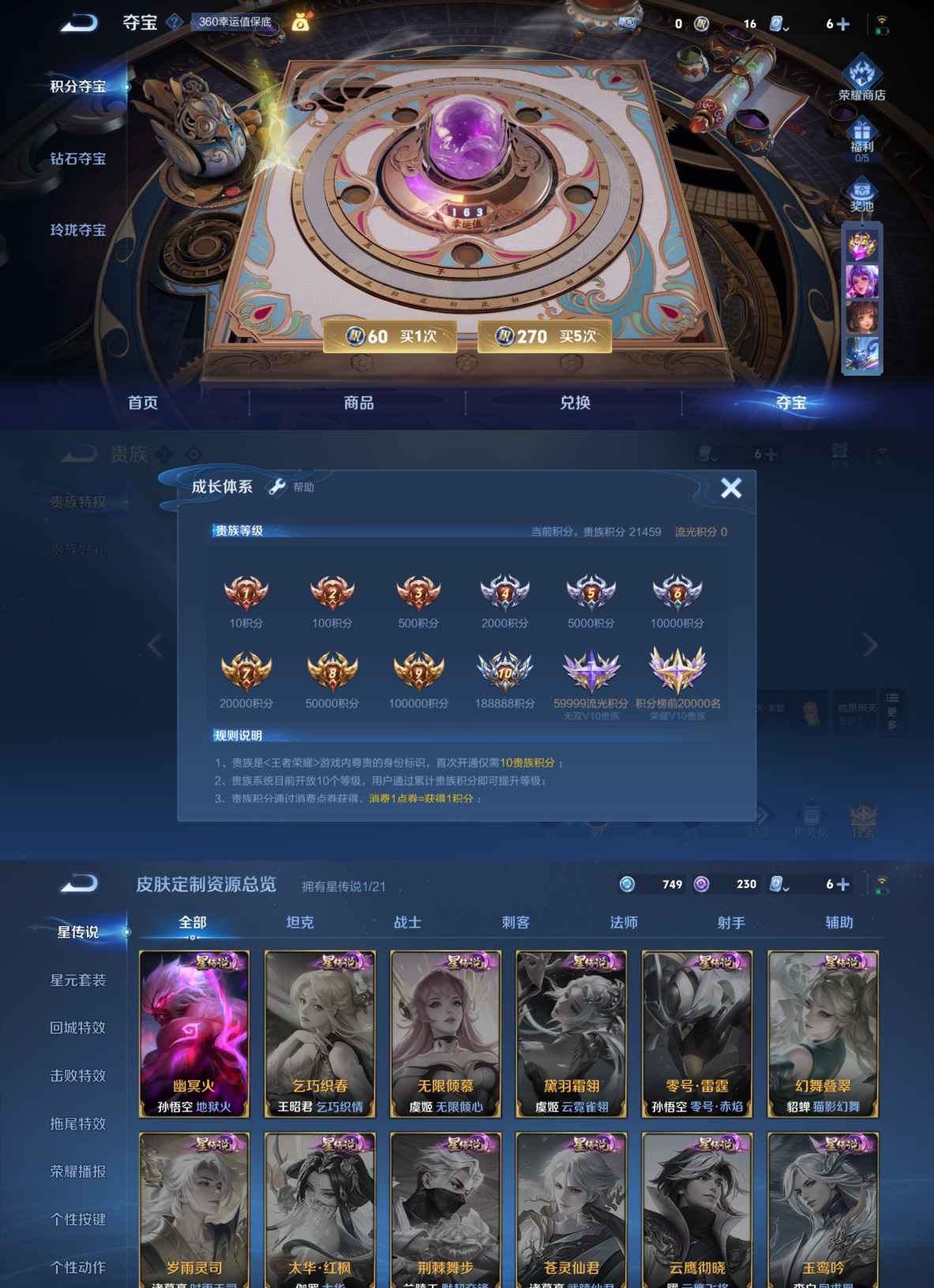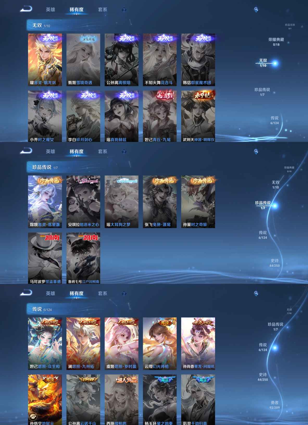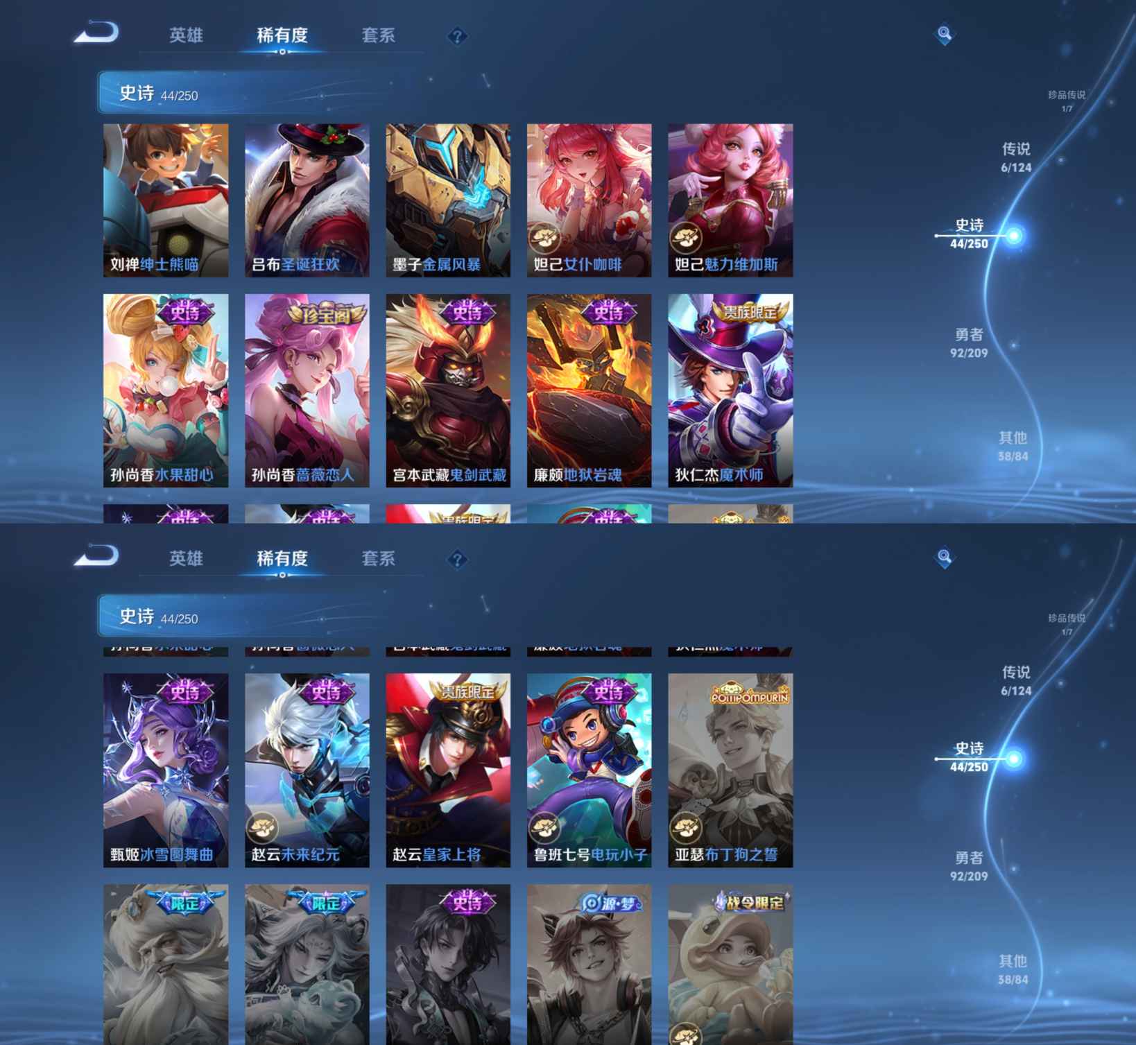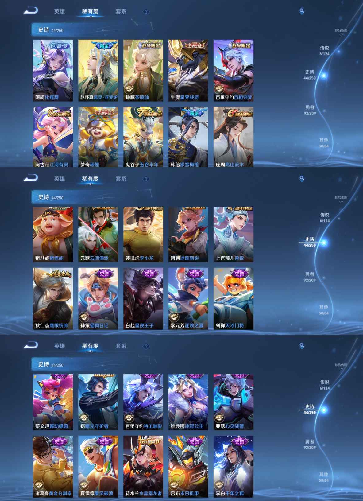 【史诗皮肤】,茶境仙,星界战将,百相守梦,傲雪梅枪,器灵·浮梦炉,谧流熔炉,电玩小子,聚星闪耀,江河有灵,完美运算,化蝶舞,顽趣,舞动绿茵,女仆咖啡,魅力维加斯,魔术师,鹰眼统帅,鬼剑武藏,水晶猎龙者,曙光守护者,千年之狐,逐浪之夏,地狱岩魂,绅士熊喵,天才门将,圣诞狂欢,末日机甲,金属风暴,梁祝,李小龙,猫狗日记,水果甜心,蔷薇恋人,乘风破浪,冰冠公主,心灵战警,云间偶戏,皇家上将,冰雪圆舞曲,黄金分割率,猪悟能,高山流水,五谷丰年,未来纪元,迷踪丽影,星夜王子,特工魅影,