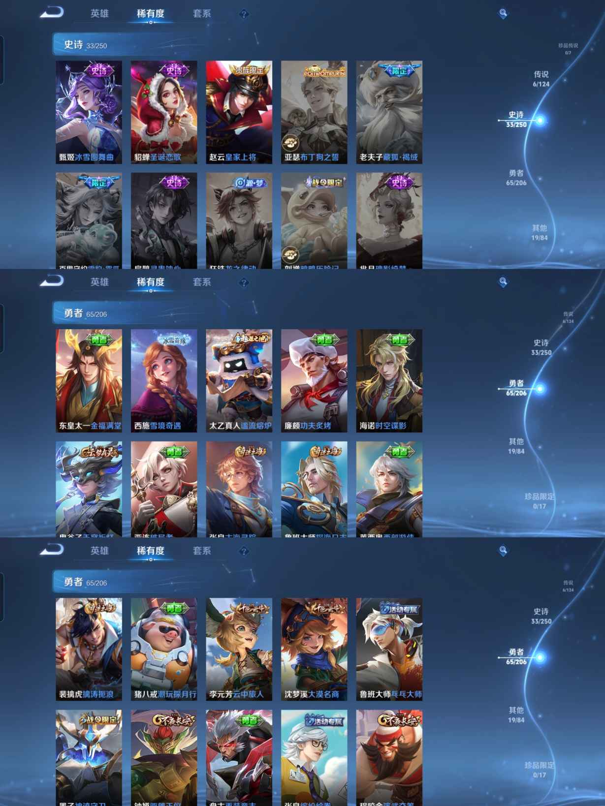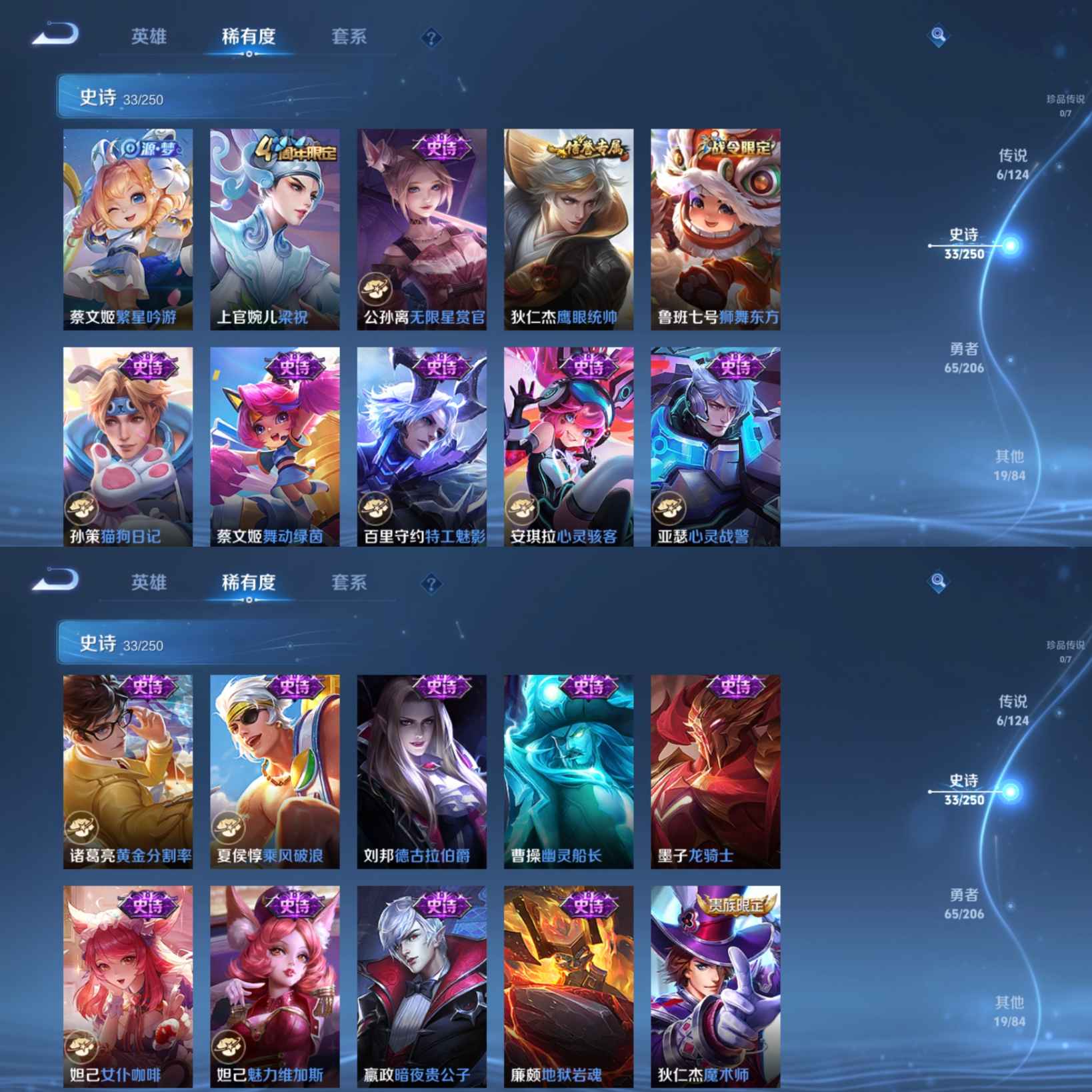 【史诗皮肤】,天狼溯光者,傲雪梅枪,神威,山海·玄木吟,化蝶舞,舞动绿茵,幽灵船长,繁星吟游,女仆咖啡,魅力维加斯,魔术师,鹰眼统帅,圣诞恋歌,无限星赏官,地狱岩魂,德古拉伯爵,狮舞东方,狂想玩偶喵,胡桃异想国,龙骑士,梁祝,李小龙,猫狗日记,乘风破浪,心灵战警,暗夜贵公子,云间偶戏,纤云弄巧,皇家上将,冰雪圆舞曲,黄金分割率,心灵骇客,特工魅影,