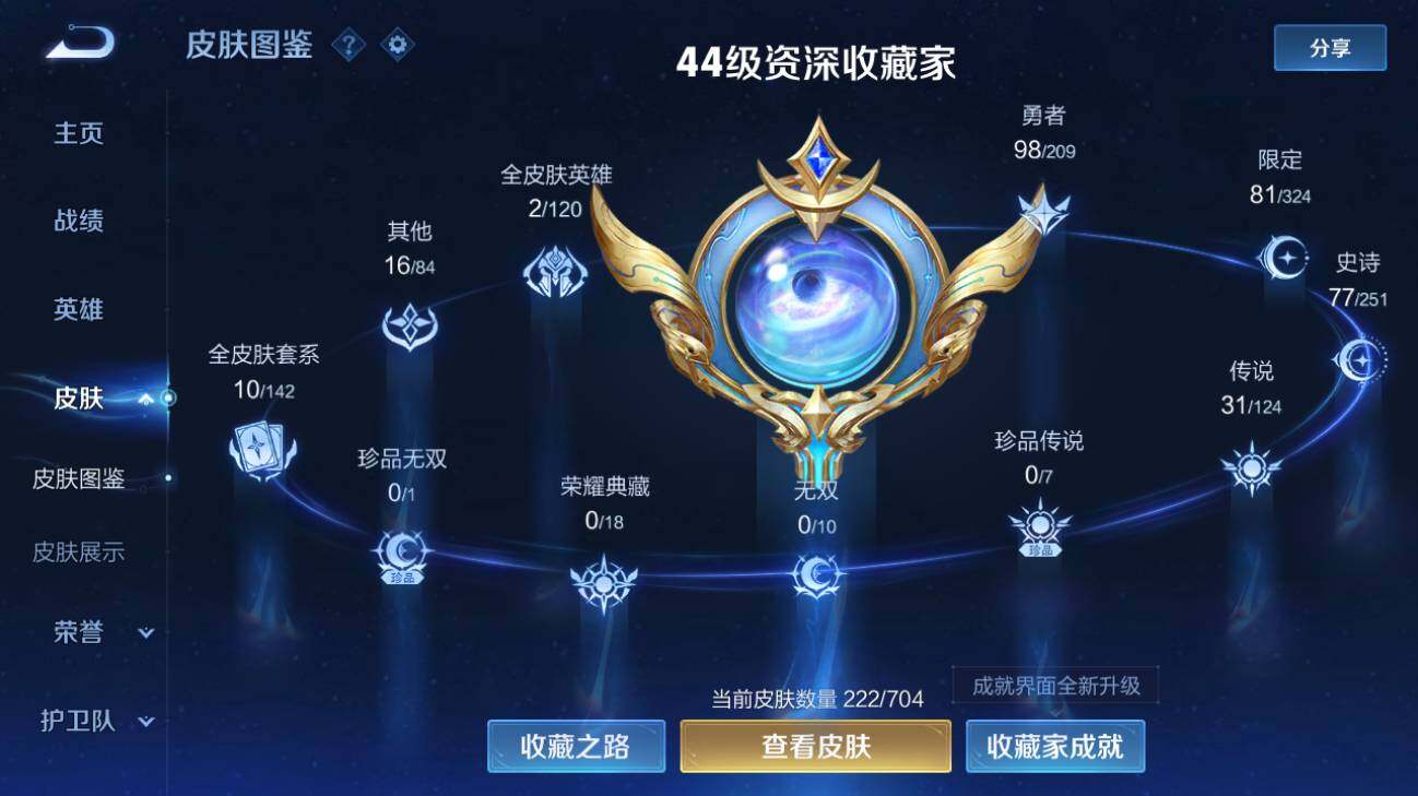 【史诗皮肤】:鲁班七号电玩小子,项羽苍穹之光,赵云皇家上将,赵云未来纪元,貂蝉圣诞恋歌,甄姬冰雪圆舞曲,狄仁杰魔术师,廉颇地狱岩魂,宫本武藏鬼剑武藏,孙尚香蔷薇恋人,孙尚香水果甜心,嬴政暗夜贵公子,嬴政摇滚巨星,妲己魅力维加斯,妲己女仆咖啡,墨子龙骑士,墨子金属风暴,吕布圣诞狂欢,曹操幽灵船长,吕布末日机甲,张飞乱世虎臣,韩信白龙吟,孙悟空至尊宝,花木兰水晶猎龙者,刘邦德古拉伯爵,夏侯惇乘风破浪,小乔缤纷独角兽,兰陵王暗隐猎兽者,诸葛亮黄金分割率,亚瑟心灵战警,雅典娜冰冠公主,安琪拉心灵骇客,百里守约特工魅影,铠曙光守护者,蔡文姬舞动绿茵,刘禅天才门将,李元芳逐浪之夏,程咬金功夫厨神,白起星夜王子,大乔猫狗日记,孙悟空大圣娶亲,狄仁杰鹰眼统帅,公孙离无限星赏官,上官婉儿梁祝,典韦岱宗,大乔白蛇,小乔青蛇,不知火舞魅语,橘右京修罗,张飞虎魄,蒙犽狂想玩偶喵,裴擒虎李小龙,云中君纤云弄巧,花木兰默契交锋,伽罗天狼溯光者,嫦娥拒霜思,韩信傲雪梅枪,夏洛特永昼,鬼谷子五谷丰年,盾山梦圆繁星,元歌无心,马可波罗山海玄木吟,瑶山海碧波行,百里守约真我赫兹,周瑜雪夜绮愿,妲己灵卜魔法,高渐离燃音魔法,伽罗琥珀纪元,姬小满妄想食味,芈月浮光幕影,蔡文姬夏日便利店,亚连破空之剑,弈星炽弈燎原,艾琳陌上桑,赵怀真器灵浮梦炉,阿轲化蝶舞,狂铁龙之律动,百里守约雪豹霜爪