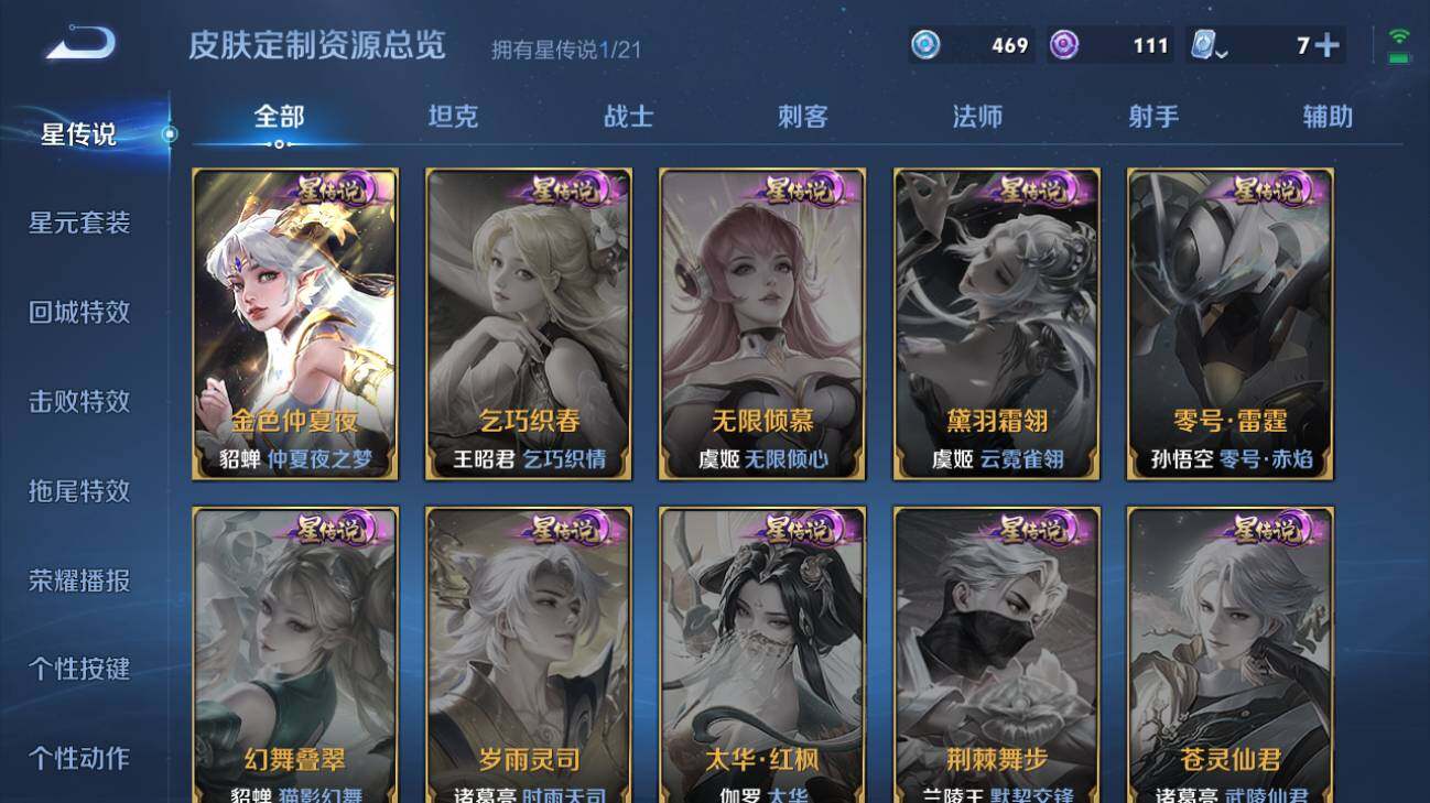 【传说皮肤】:狄仁杰超时空战士,宫本武藏地狱之眼,貂蝉仲夏夜之梦,后羿黄金射手座,张良黄金白羊座,貂蝉猫影幻舞,伽罗太华,李信一念神魔,曜云鹰飞将,虞姬启明星使,镜炽阳神光,诸葛亮时雨天司,王昭君乞巧织情,孙策末日机甲,百里守约碎云,不知火舞绯月行,李信山海炽霜斩,小乔山海琳琅生,干将莫邪画中仙,兰陵王影龙天霄,大乔时之奇旅,赵云乘龙铭钟鼎,典韦战鼓燎原,朵莉亚心动手记,铠冥王哈迪斯,夏侯惇霜北刀,桑启鸣野蒿,王昭君映山客,云缨幻光神枪,虞姬愿照岁时盈,女娲愿照千秋盛