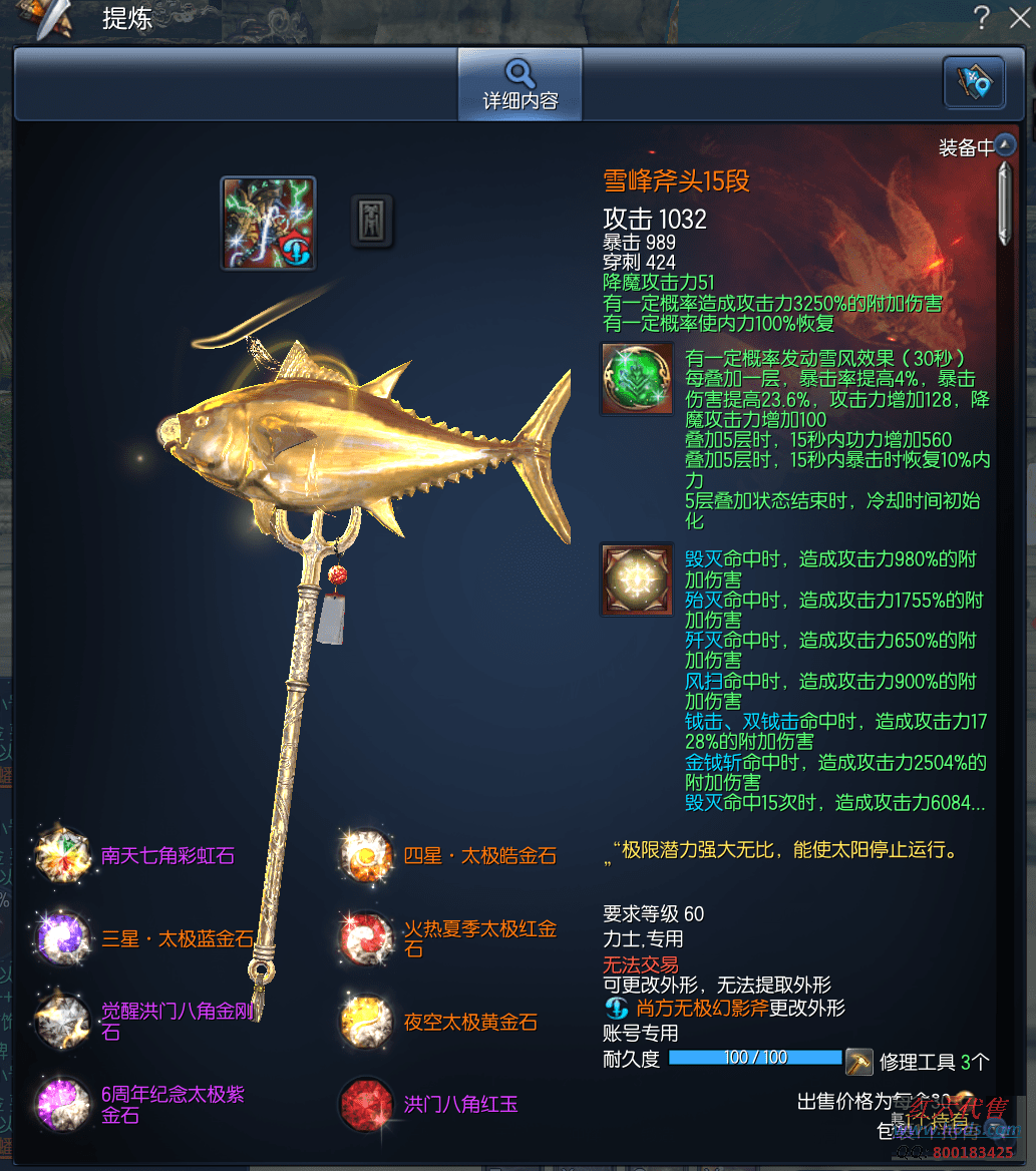 11914,无日峰力士,侠义团86段,四星太极石,三星太极石,雪峰元气石15段,征伐真气石15段,雪峰斧头15段,泰王耳环1段,卓越泰王戒指2段,卓越邪花项链3段,卓越邪花耳环3段,极凰手镯6段,狂天腰带12段,齐天手套8段,极花秘功牌8段,武乾神功牌8段,毁灭南天魂15段,黄龙灵15段,烬灭守护石3段,晨晖星15段,衣服112,《秒伤圣地起手4000多万稳定1800W-2000W》12000R,