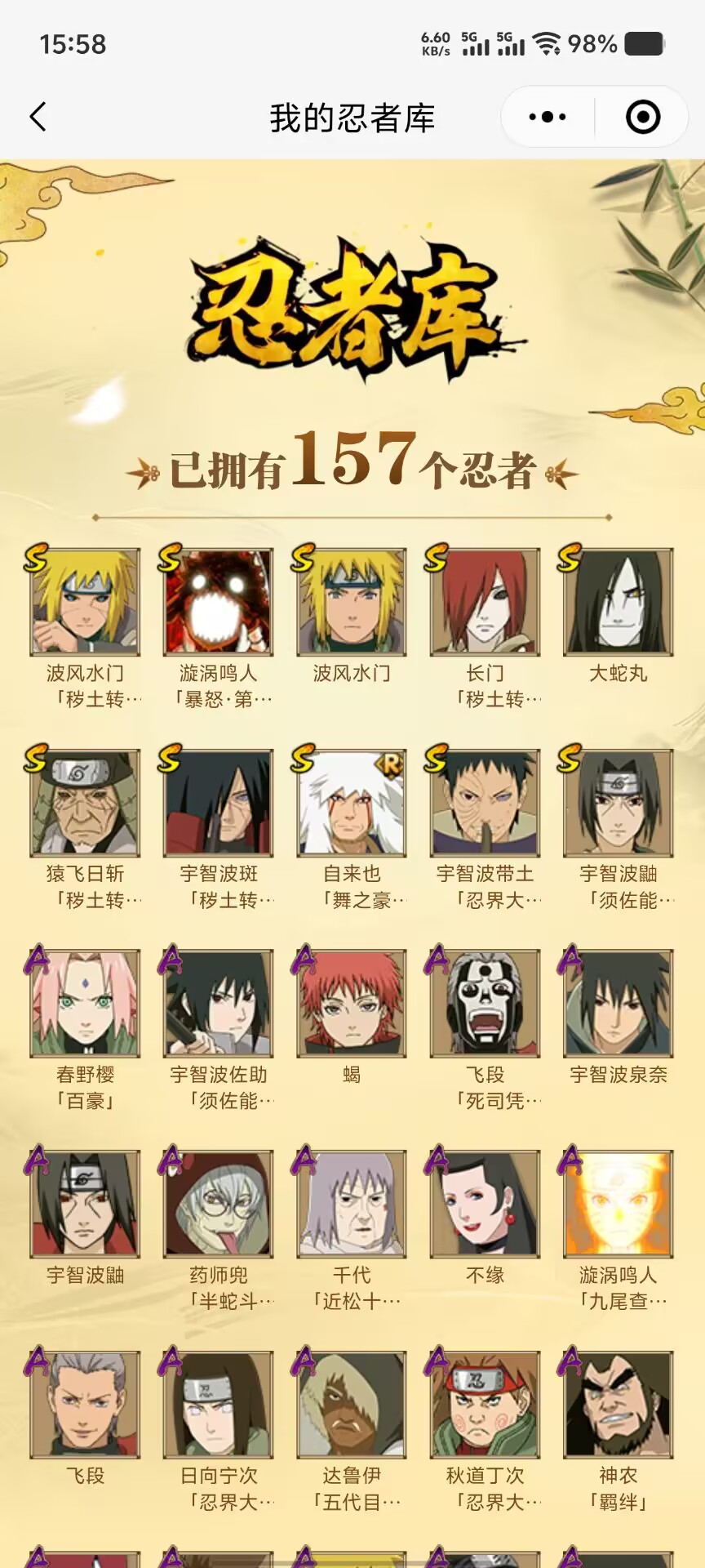 【A忍者】,长十郎「六代目水影」,不缘,日向宁次「忍界大战」,漩涡博人「桃式显现」,宇智波泉奈,神农「羁绊」,长门「青年」,达鲁伊「五代目雷影」,波风水门「青年」,千手扉间「漂泊武士」,宇智波佐助「须佐能乎」,迪达拉「秽土转生」,漩涡鸣人「九尾查克拉」,千代「近松十人卫」,药师兜「半蛇斗篷」,宇智波鼬「新春限定」,秋道丁次「忍界大战」,大蛇丸「晓」,春野樱「百豪」,照美冥「五代目水影」,飞段「死司凭血」,飞段,我爱罗「疾风传」,蝎,干柿鬼鲛,宇智波鼬,猿飞阿斯玛,迈特凯,桃地再不斩,
