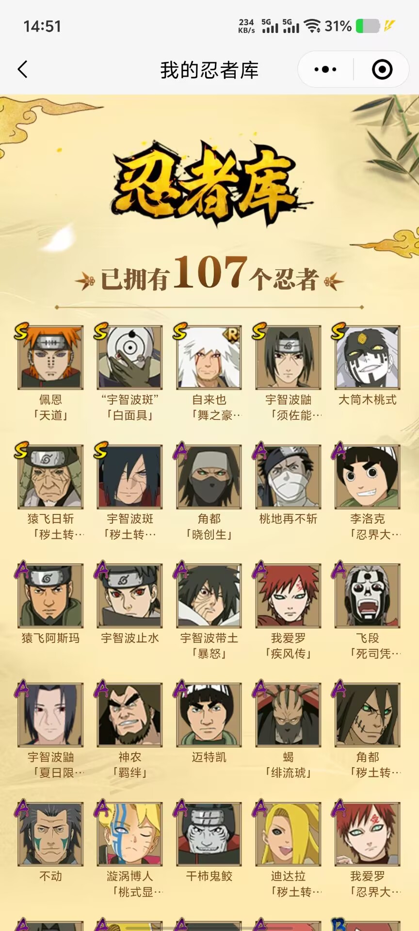 【A忍者】,漩涡博人「桃式显现」,宇智波鼬「夏日限定」,李洛克「忍界大战」,不动,蝎「绯流琥」,宇智波泉奈,神农「羁绊」,角都「秽土转生」,宇智波止水,迪达拉「秽土转生」,宇智波带土「暴怒」,角都「晓创生」,我爱罗「忍界大战」,飞段「死司凭血」,迪达拉,我爱罗「疾风传」,蝎,干柿鬼鲛,宇智波鼬,猿飞阿斯玛,迈特凯,桃地再不斩,