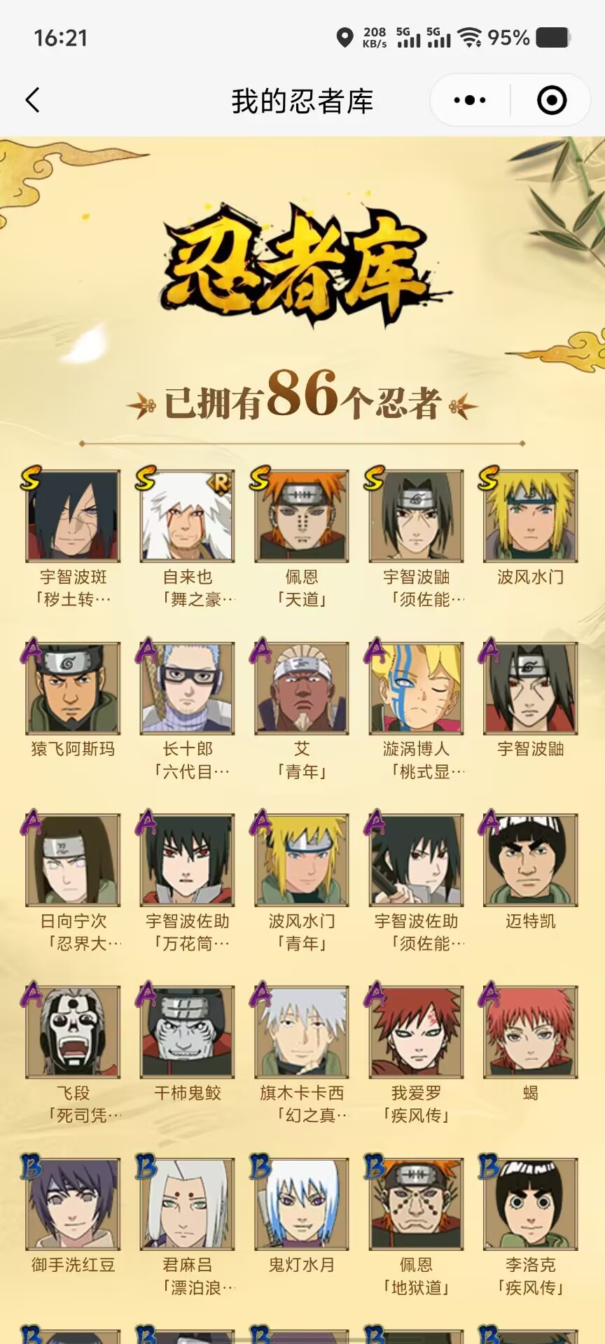 【A忍者】,长十郎「六代目水影」,日向宁次「忍界大战」,漩涡博人「桃式显现」,旗木卡卡西「幻之真容」,艾「青年」,波风水门「青年」,宇智波佐助「须佐能乎」,宇智波佐助「万花筒写轮眼」,飞段「死司凭血」,我爱罗「疾风传」,蝎,干柿鬼鲛,宇智波鼬,猿飞阿斯玛,迈特凯,