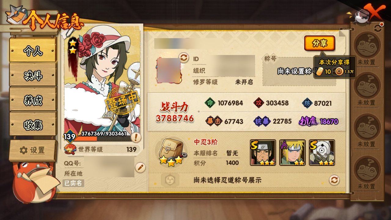 PX_1878702-实名:,可修改,贵族等级:,V7,S忍数:,10,A忍数:,20,战力值(万):,378,S级忍者:,千手柱间「秽土转生」,药师兜「仙人模式」,佩恩「天道」,大蛇丸,波风水门,迈特凯「死门」,自来也,「舞之豪杰」,宇智波斑,「白面具」,春野樱,「忍界大战」,宇智波斑「秽土转生·解」,通灵兽:,忍犬,忍龟,蛤蟆吉,蓝蛇,猿魔,蛤蟆仙人,镰鼬,山椒鱼,蜃,鲛鲨,蛤蟆健,砂之守鹤