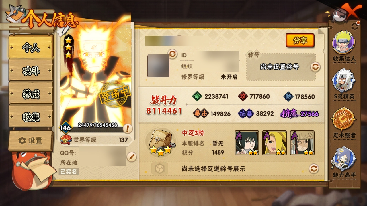 PX_1643122-实名:,可修改,贵族等级:,V11,S忍数:,15,A忍数:,35,战力值(万):,8119375,S级忍者:,千手柱间「秽土转生」,宇智波斑「秽土转生」,艾「三代目雷影」,神秘面具男,佩恩「天道」,大蛇丸,波风水门,迈特凯「死门」,大野木,「忍界大战」,宇智波带土,「忍界大战」,漩涡鸣人,「九喇嘛连结」,宇智波佐助「永恒万花筒」,千手柱间·木叶创立,宇智波斑「秽土转生·解」,大筒木桃式,通灵兽:,忍犬,忍龟,蛤蟆吉,蓝蛇,猿魔,蛞蝓,蛤蟆仙人,镰鼬,山椒鱼,蜃,鲛鲨,蛤蟆健,乌鸦,蛤蟆龙,蛤蟆广,砂之守鹤