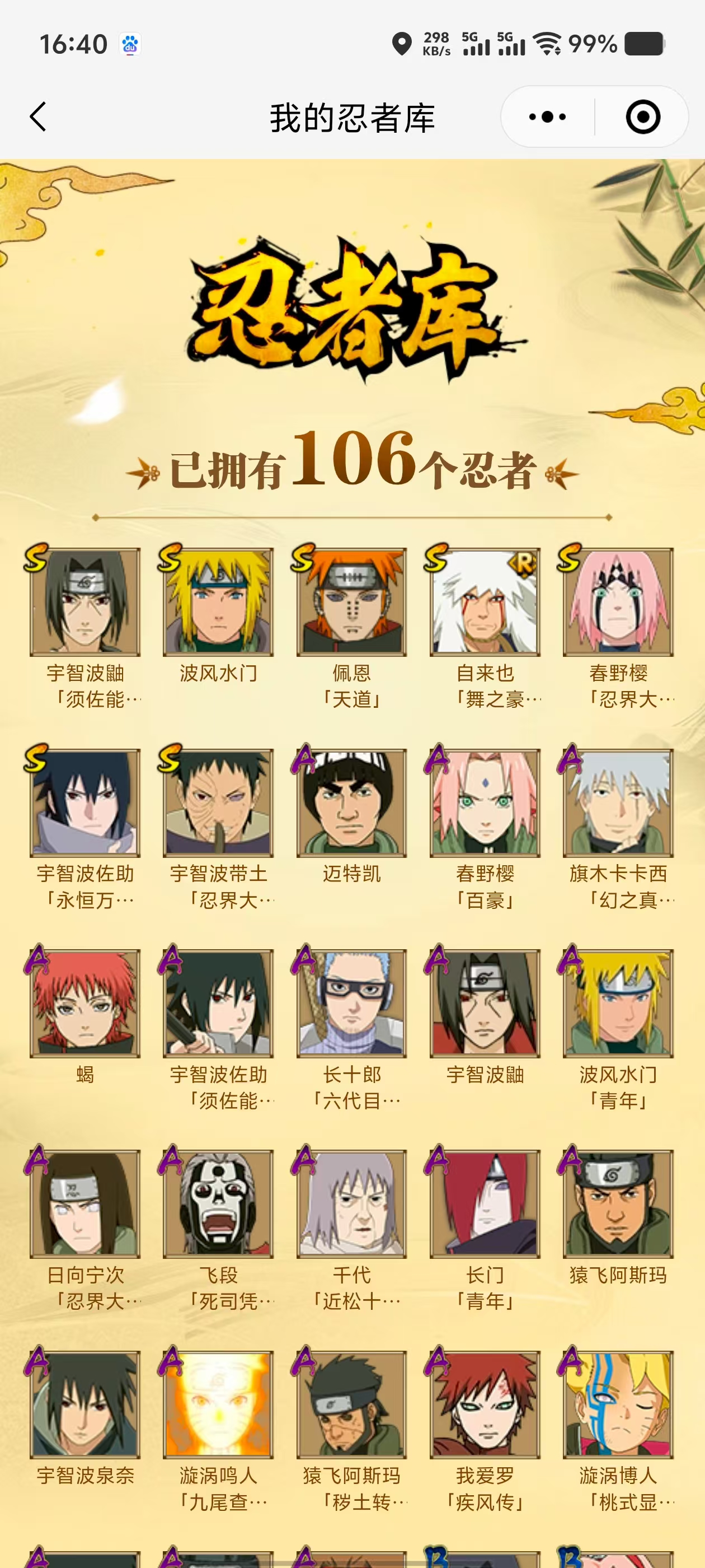【A忍者】,长十郎「六代目水影」,日向宁次「忍界大战」,漩涡博人「桃式显现」,旗木卡卡西「幻之真容」,宇智波泉奈,长门「青年」,波风水门「青年」,宇智波佐助「须佐能乎」,漩涡鸣人「九尾查克拉」,千代「近松十人卫」,秋道丁次「忍界大战」,猿飞阿斯玛「秽土转生」,春野樱「百豪」,宇智波佐助「万花筒写轮眼」,飞段「死司凭血」,我爱罗「疾风传」,蝎,干柿鬼鲛,宇智波鼬,猿飞阿斯玛,迈特凯,