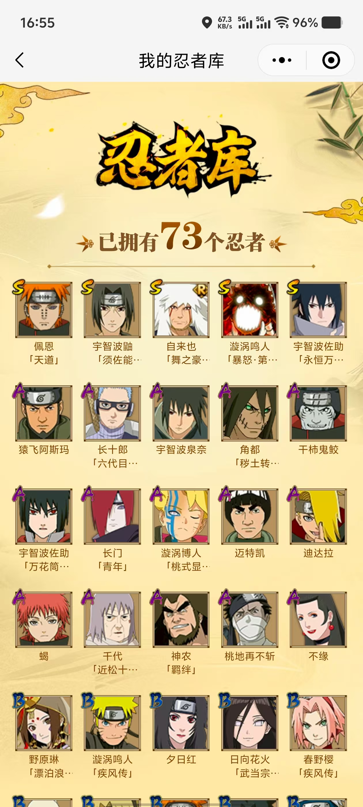 【A忍者】,长十郎「六代目水影」,不缘,漩涡博人「桃式显现」,宇智波泉奈,神农「羁绊」,角都「秽土转生」,长门「青年」,千代「近松十人卫」,宇智波佐助「万花筒写轮眼」,迪达拉,蝎,干柿鬼鲛,猿飞阿斯玛,迈特凯,桃地再不斩,