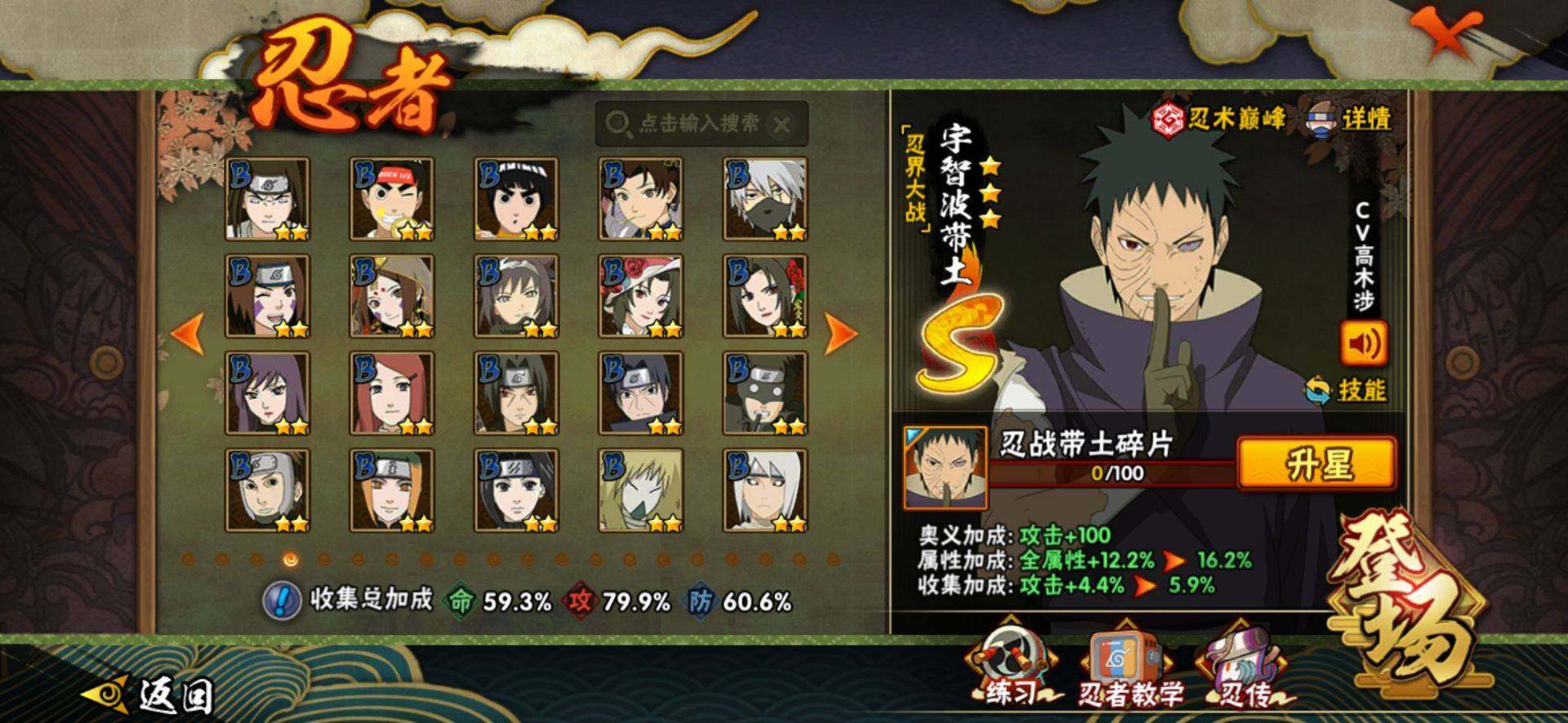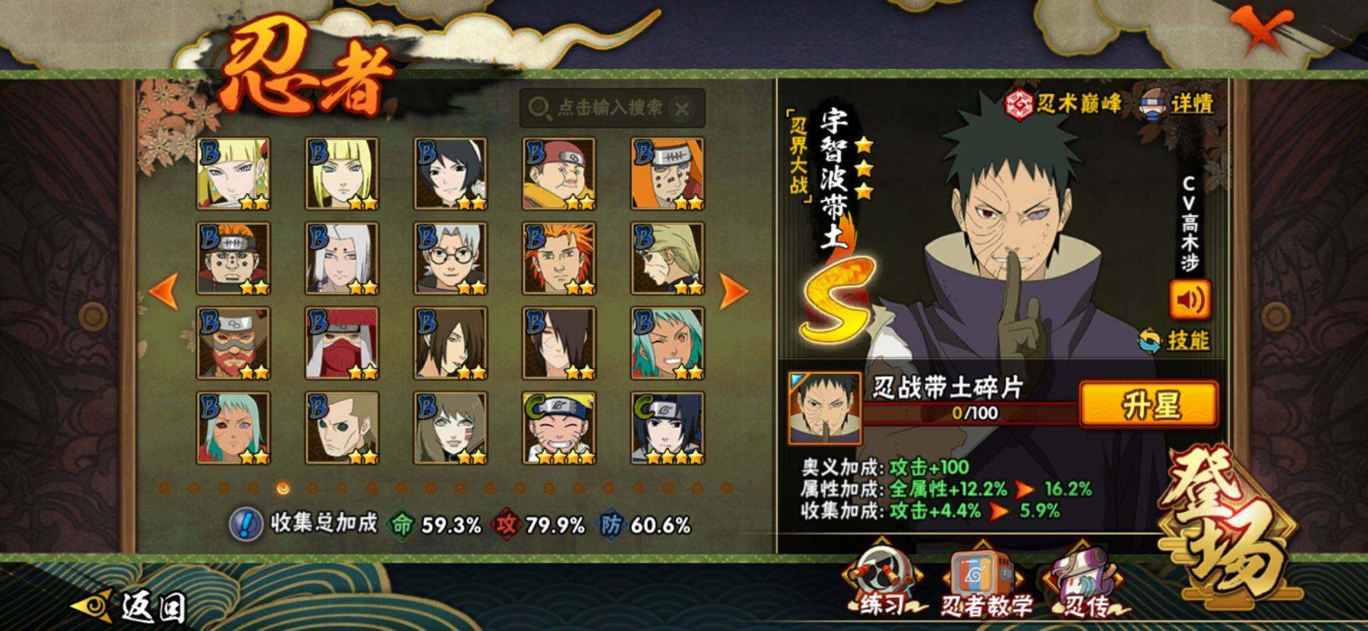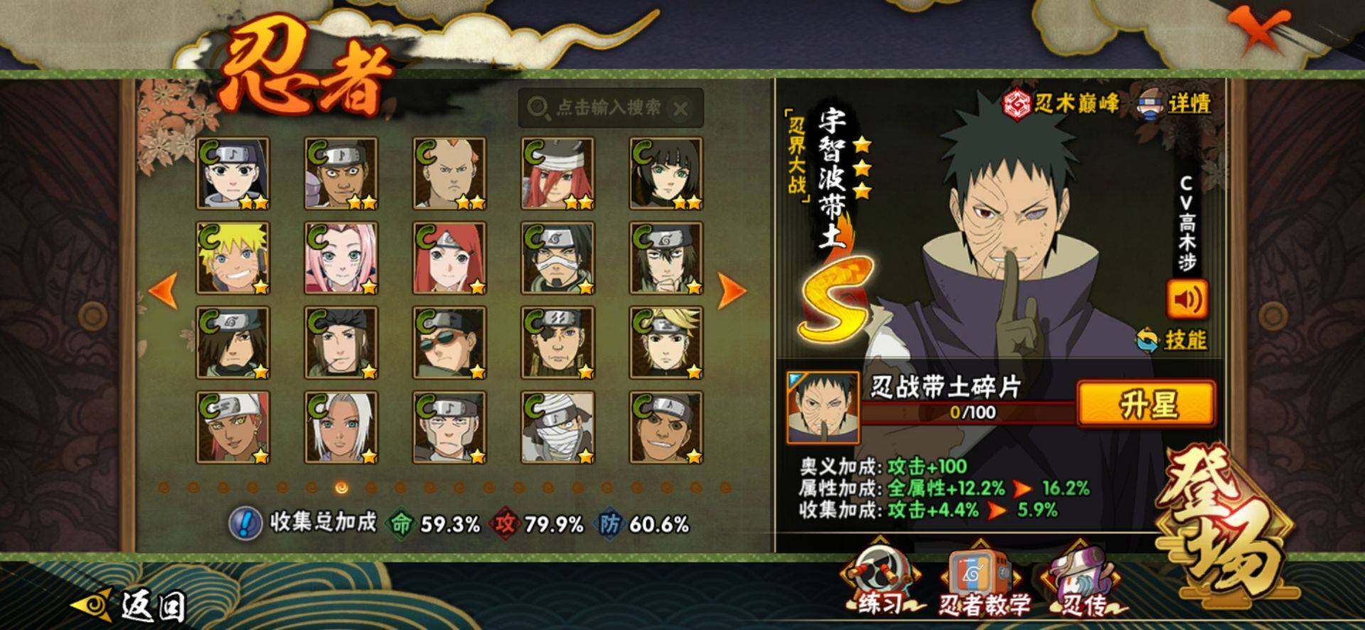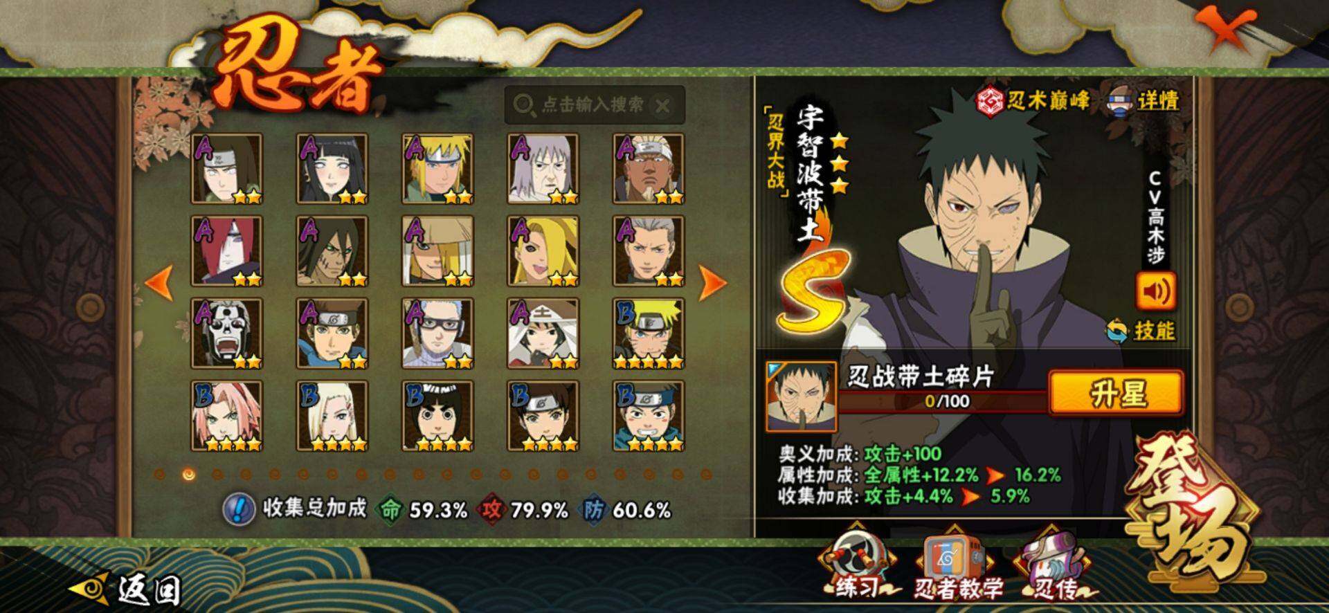 【S级忍者】:春野樱「忍界大战」(3星),宇智波带土「忍界大战」(3星),宇智波鼬「须佐能乎」(3星),自来也「舞之豪杰」(3星),大蛇丸(3星),波风水门(3星),药师兜「仙人模式」(3星),漩涡鸣人「九喇嘛连结」(3星),佩恩「天道」(3星),宇智波佐助「永恒万花筒」(3星),宇智波斑,「白面具」(3星宇智波斑「白面具」)