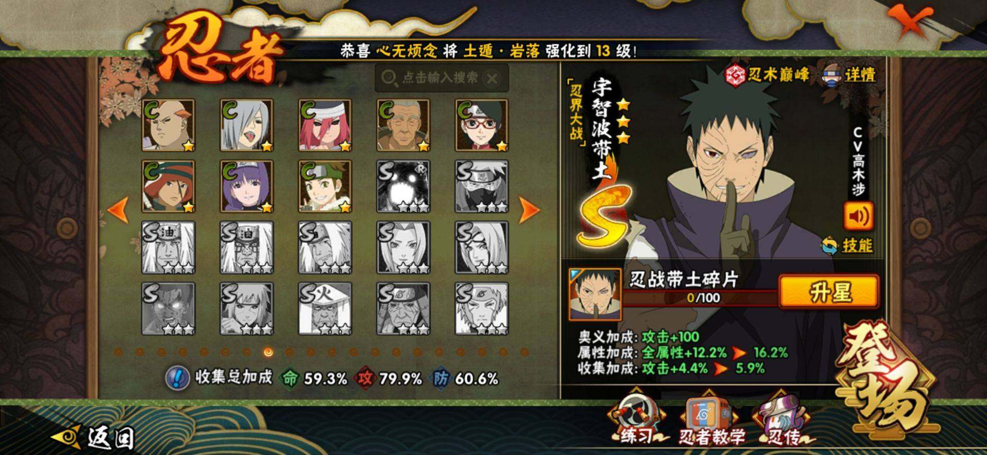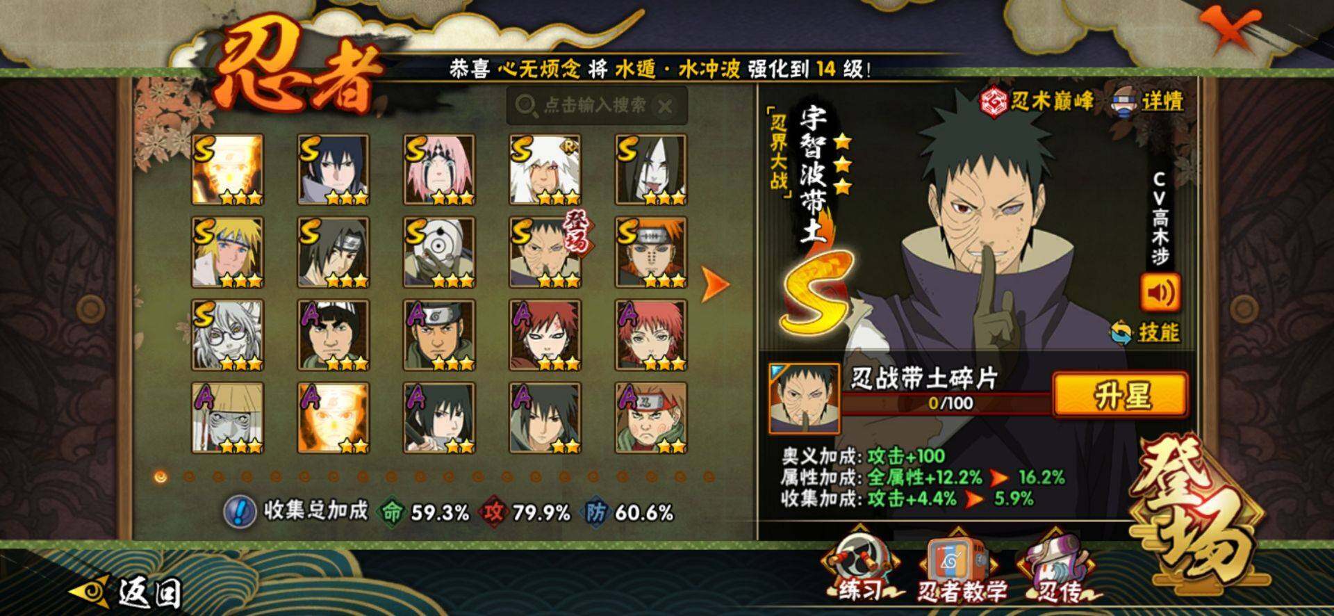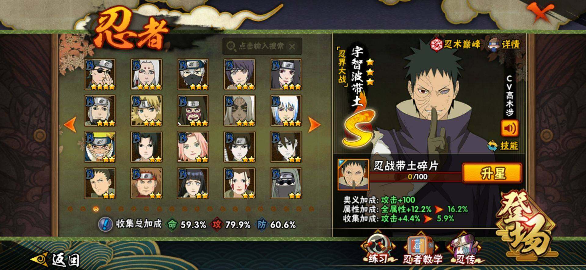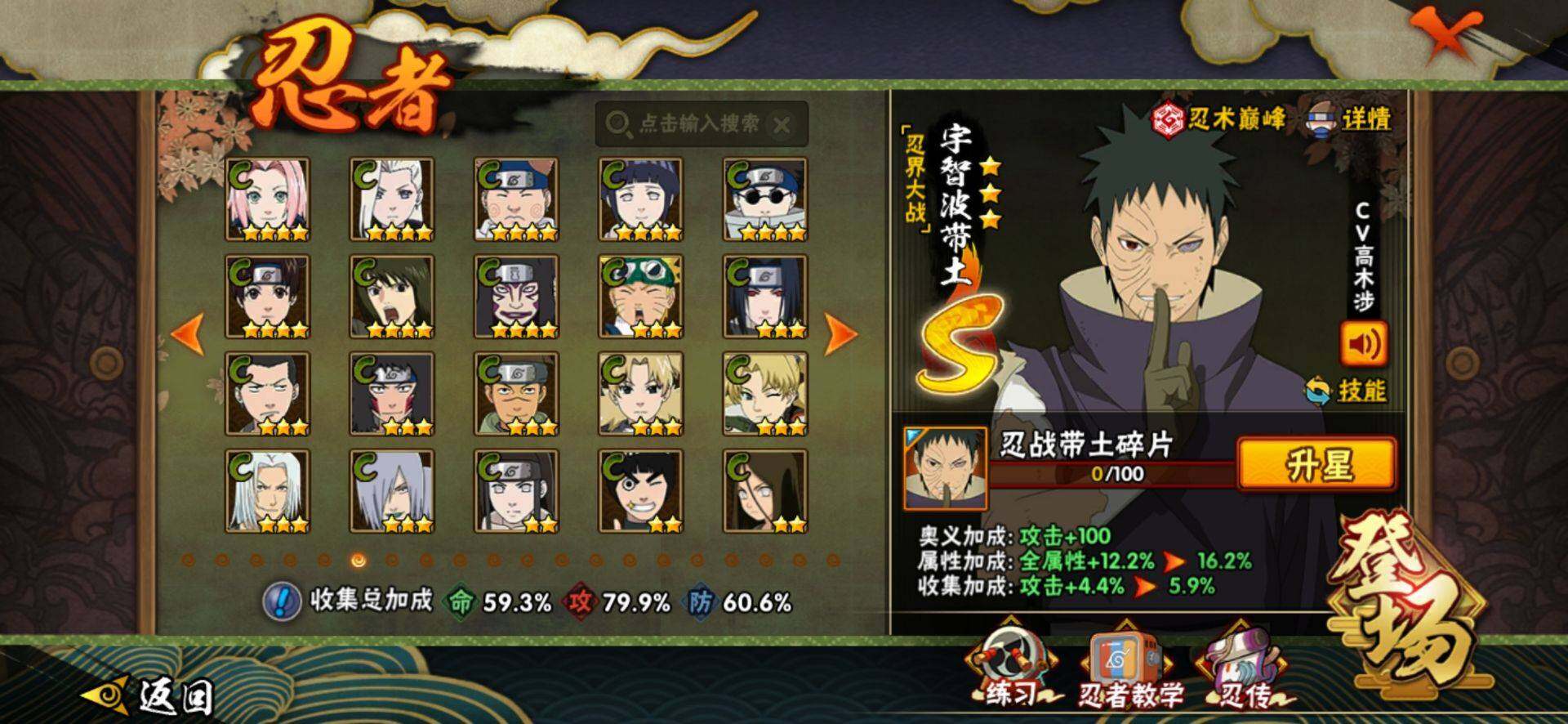 【S级忍者】:春野樱「忍界大战」(3星),宇智波带土「忍界大战」(3星),宇智波鼬「须佐能乎」(3星),自来也「舞之豪杰」(3星),大蛇丸(3星),波风水门(3星),药师兜「仙人模式」(3星),漩涡鸣人「九喇嘛连结」(3星),佩恩「天道」(3星),宇智波佐助「永恒万花筒」(3星),宇智波斑,「白面具」(3星宇智波斑「白面具」)