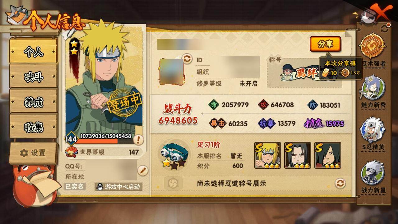 PX_2152503-可换绑,XD0160,可二次,V11/战力694W/S忍16/A忍31/322区服,3星波风水门,3星宇智波鼬「秽土转生」,3星宇智波鼬「须佐能乎」,3星神秘面具男,3星千手扉间,3星波风水门「秽土转生」,3星千手柱间,3星宇智波斑,3星猿飞日斩「秽土转生」,3星长门「秽土转生」,3星佩恩「天道」,3星自来也,3星艾「四代目雷影」,3星自来也「舞之豪杰」,3星金角·银角「秽土转生」,4星大蛇丸,4星我爱罗「疾风传」,2星迪达拉,5星蝎,5星迈特凯,5星猿飞阿斯玛,5星干柿鬼鲛,2星宇智波止水,2星小南,2星旗木卡卡西「万花筒写轮眼」,2星角都「地怨虞」,2星漩涡鸣人「仙人模式」,5星飞段,3星飞段「死司凭血」,2星志村团藏,2星宇智波鼬,2星波风水门「青年」,3星奇拉比,2星宇智波佐助「万花筒写轮眼」,2星漩涡鸣人「九尾查克拉」,2星宇智波佐助「须佐能乎」,3星大蛇丸「晓」,2星绝,2星照美冥「五代目水影」,2星春野樱「百豪」,2星秋道丁次「忍界大战」,2星千代「近松十人卫」,2星小南「夏日泳装」,2星我爱罗「忍界大战」,2星宇智波佐助「疾风传咒印」,2星地陆,2星药师兜「半蛇斗篷」
