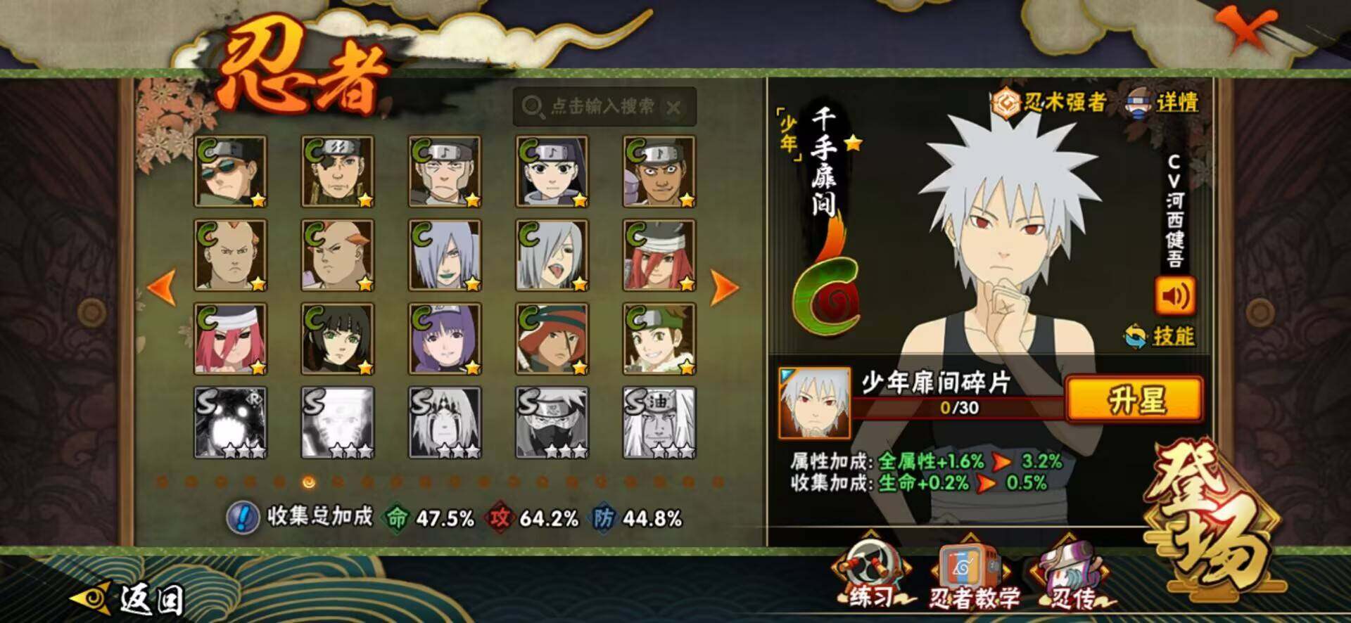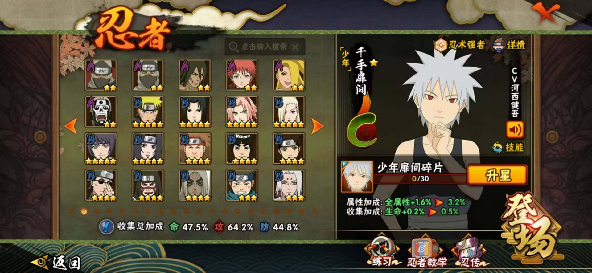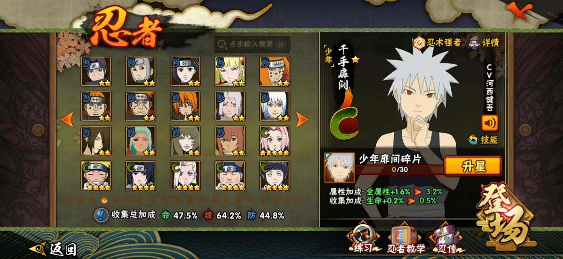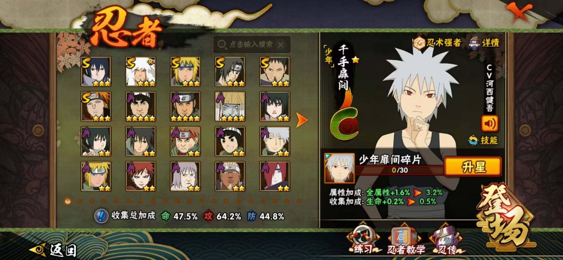 【S级忍者】:宇智波带土「忍界大战」(3星),宇智波鼬「须佐能乎」(3星),自来也「舞之豪杰」(3星),波风水门(3星),佩恩「天道」(3星),宇智波佐助「永恒万花筒」(3星)