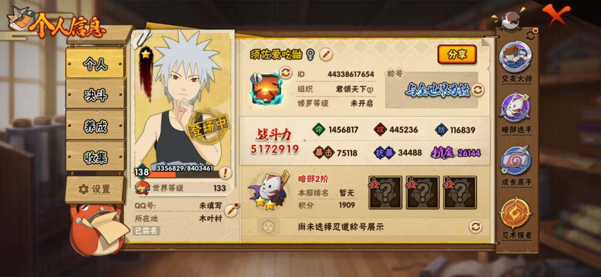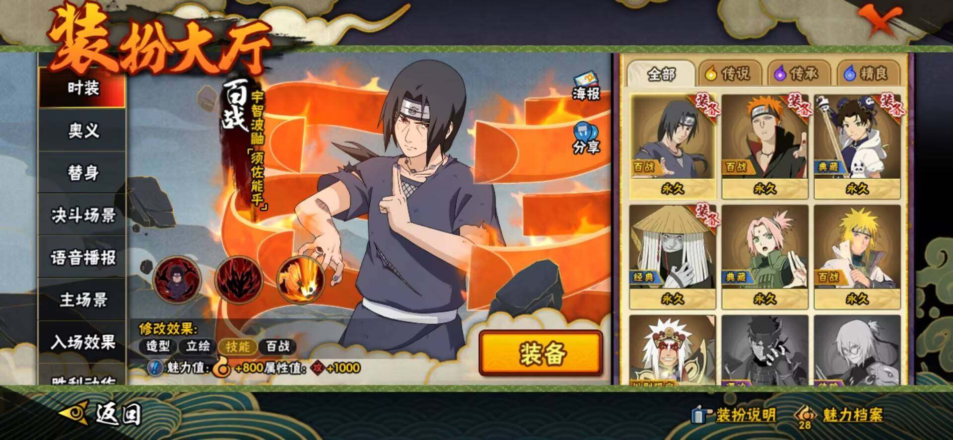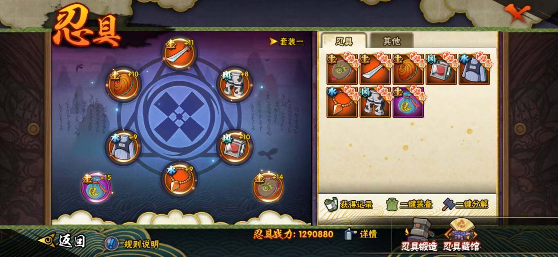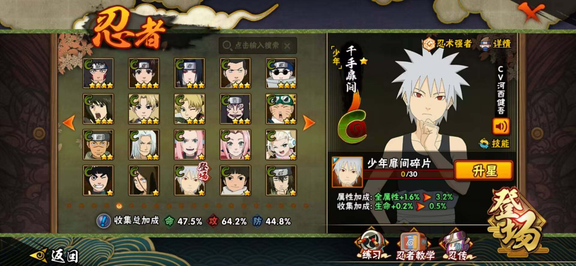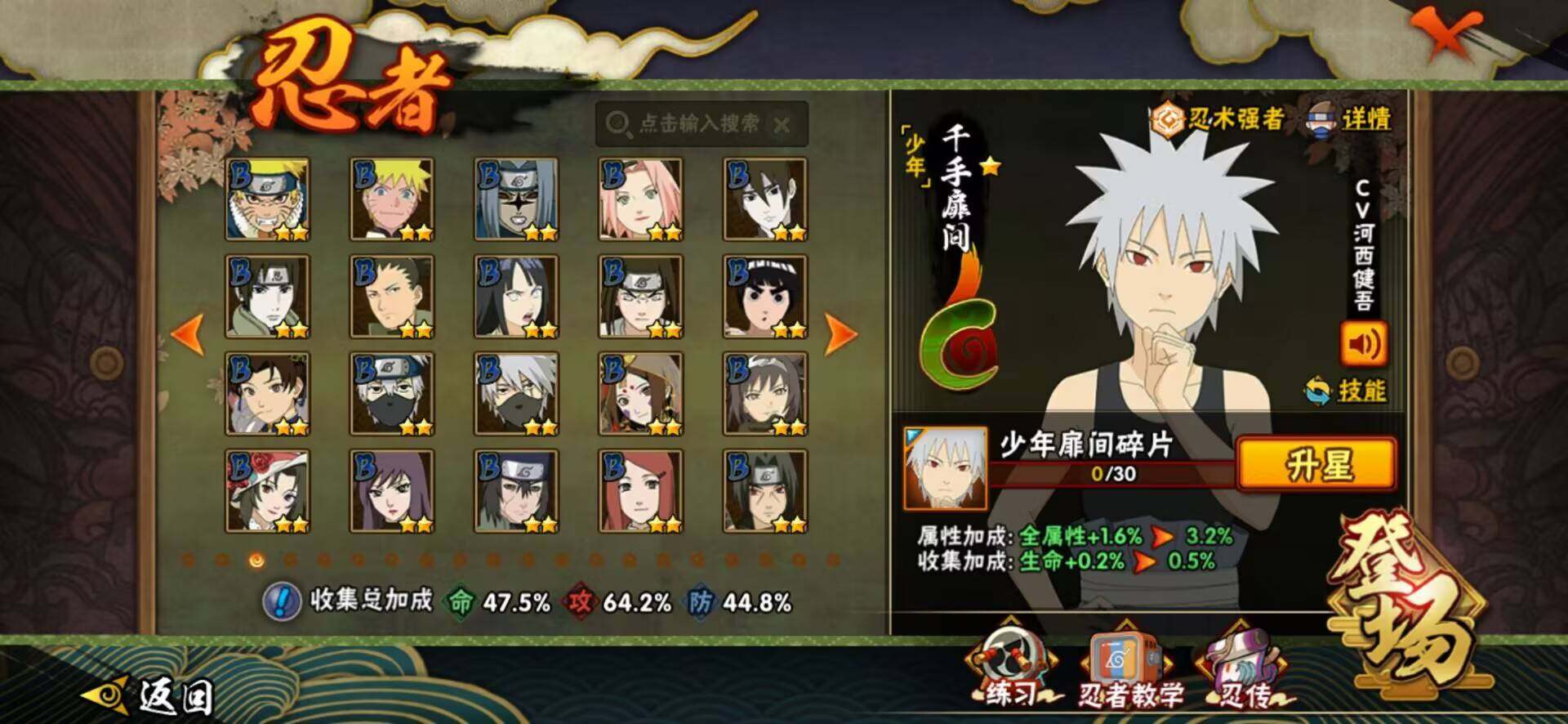 【S级忍者】:宇智波带土「忍界大战」(3星),宇智波鼬「须佐能乎」(3星),自来也「舞之豪杰」(3星),波风水门(3星),佩恩「天道」(3星),宇智波佐助「永恒万花筒」(3星)