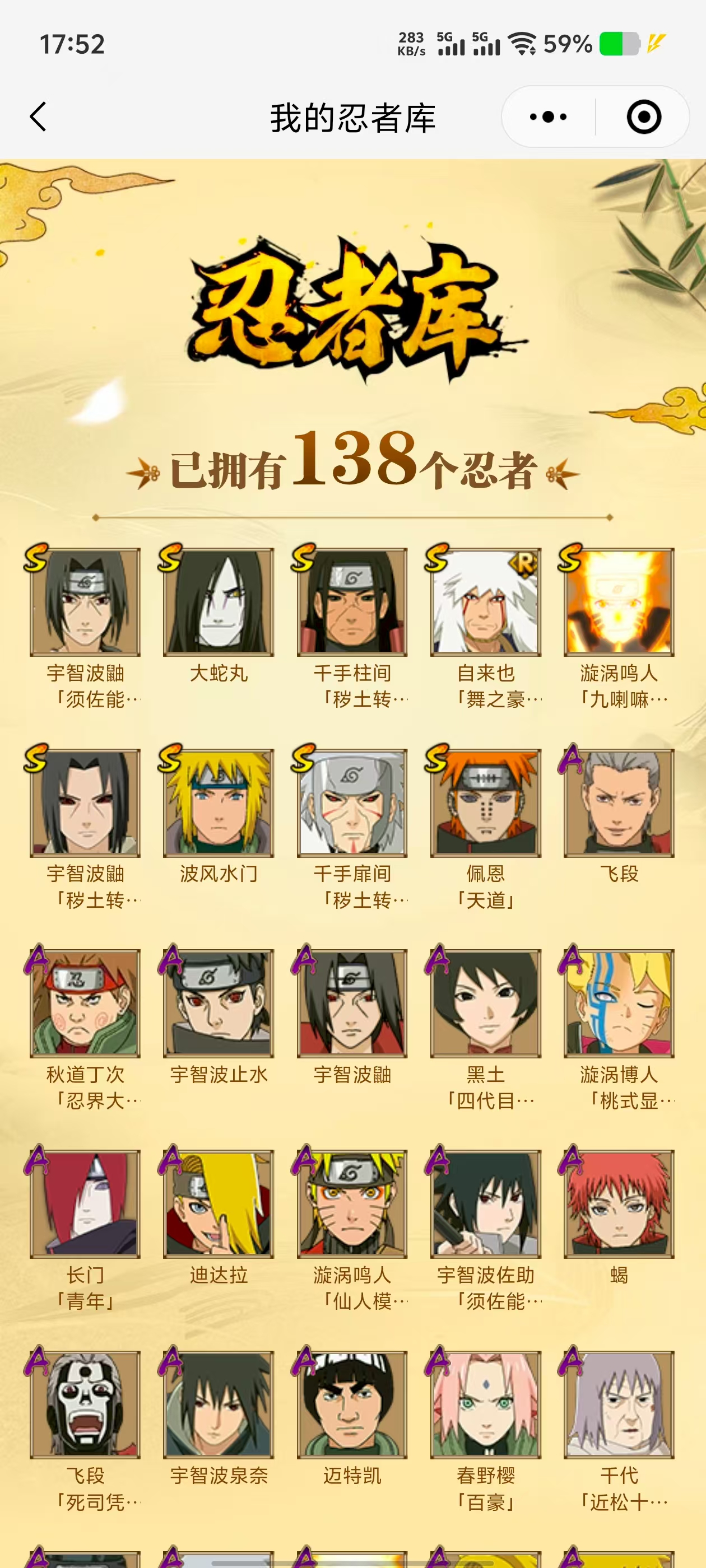 【A忍者】,漩涡博人「桃式显现」,日向雏田「最终章」,旗木卡卡西「幻之真容」,宇智波泉奈,宇智波止水,长门「青年」,波风水门「青年」,宇智波佐助「须佐能乎」,迪达拉「秽土转生」,漩涡鸣人「九尾查克拉」,千代「近松十人卫」,秋道丁次「忍界大战」,春野樱「百豪」,漩涡鸣人「仙人模式」,飞段「死司凭血」,飞段,迪达拉,我爱罗「疾风传」,蝎,干柿鬼鲛,宇智波鼬,猿飞阿斯玛,迈特凯,