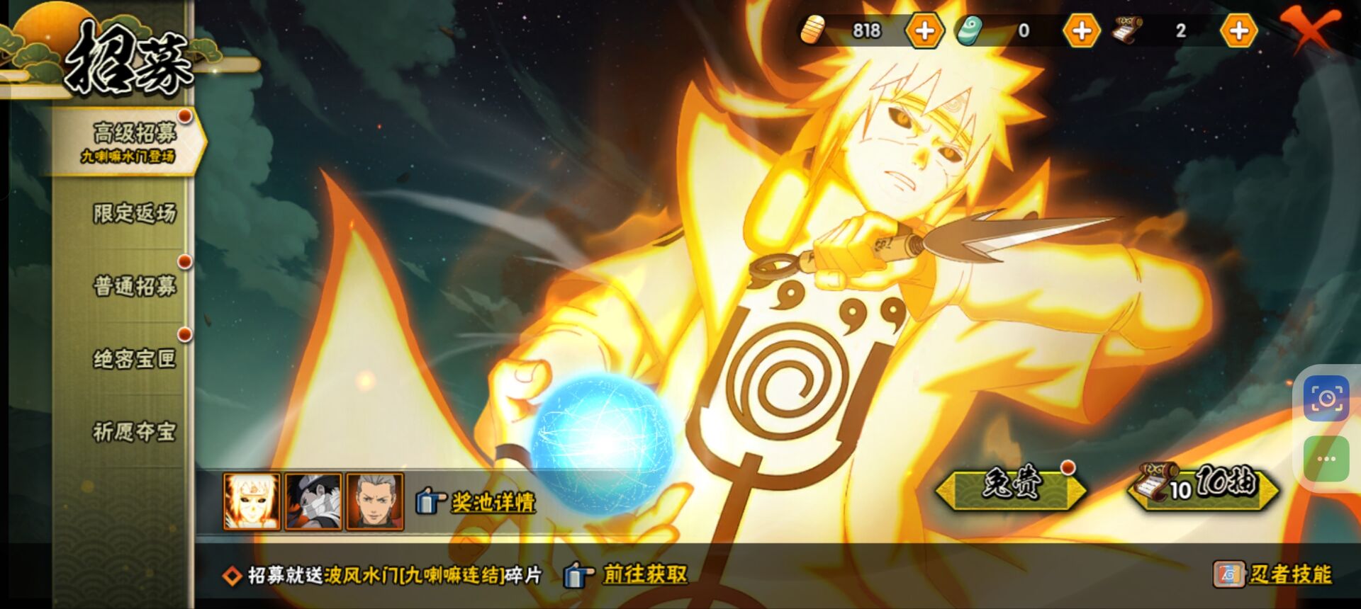 【S忍者】,漩涡鸣人「九喇嘛连结」,千手柱间「秽土转生」,自来也「舞之豪杰」,宇智波鼬「秽土转生」,千手扉间「秽土转生」,宇智波鼬「须佐能乎」,佩恩「天道」,波风水门,大蛇丸,