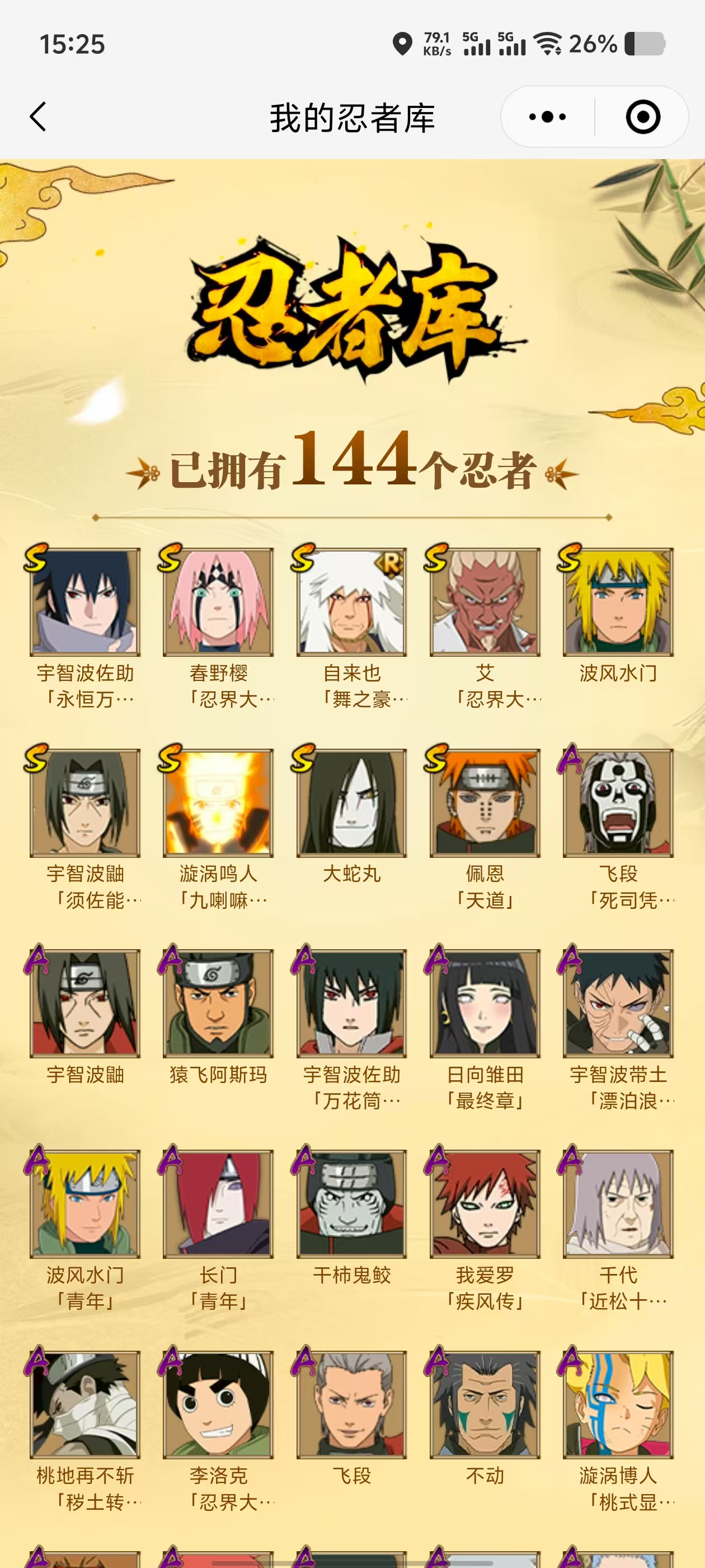 【A忍者】,纲手「侠隐江湖」,长十郎「六代目水影」,不缘,日向宁次「忍界大战」,漩涡博人「桃式显现」,日向雏田「最终章」,旗木卡卡西「幻之真容」,李洛克「忍界大战」,不动,蝎「绯流琥」,宇智波泉奈,宇智波带土「漂泊浪客」,桃地再不斩「秽土转生」,长门「青年」,艾「青年」,不风,波风水门「青年」,宇智波佐助「须佐能乎」,角都「晓创生」,千代「近松十人卫」,秋道丁次「忍界大战」,宇智波佐助「万花筒写轮眼」,飞段「死司凭血」,飞段,我爱罗「疾风传」,蝎,干柿鬼鲛,宇智波鼬,猿飞阿斯玛,迈特凯,桃地再不斩,