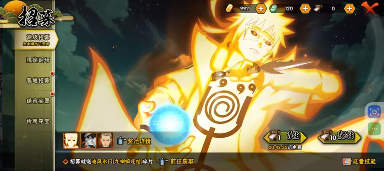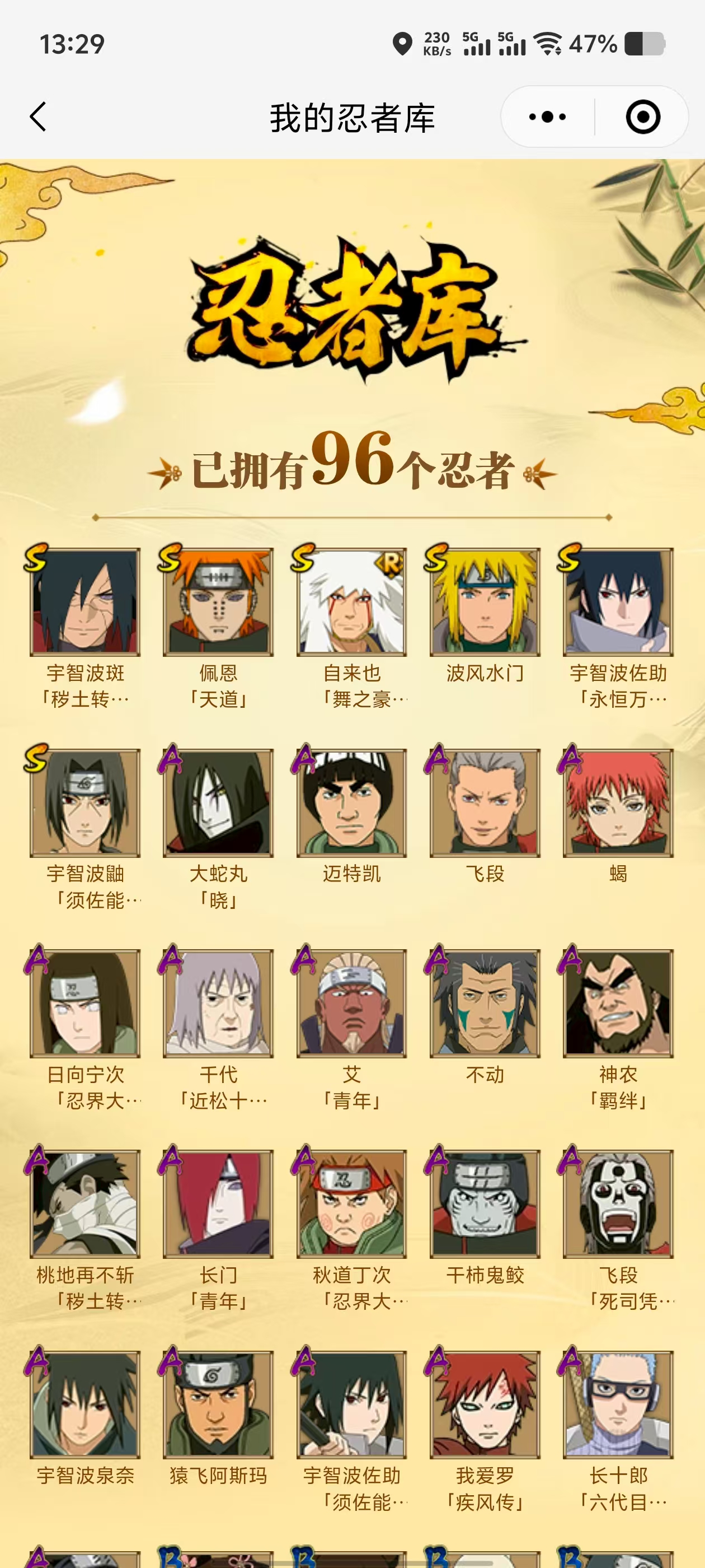 【A忍者】,长十郎「六代目水影」,日向宁次「忍界大战」,不动,宇智波泉奈,神农「羁绊」,桃地再不斩「秽土转生」,长门「青年」,艾「青年」,宇智波佐助「须佐能乎」,千代「近松十人卫」,秋道丁次「忍界大战」,大蛇丸「晓」,飞段「死司凭血」,飞段,我爱罗「疾风传」,蝎,干柿鬼鲛,猿飞阿斯玛,迈特凯,桃地再不斩,