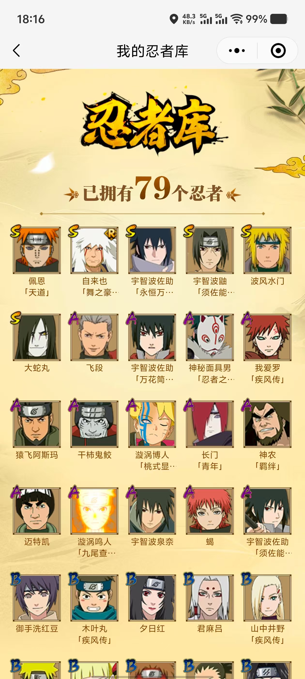 【A忍者】,漩涡博人「桃式显现」,宇智波泉奈,神农「羁绊」,长门「青年」,神秘面具男「忍者之路」,宇智波佐助「须佐能乎」,漩涡鸣人「九尾查克拉」,宇智波佐助「万花筒写轮眼」,飞段,我爱罗「疾风传」,蝎,干柿鬼鲛,猿飞阿斯玛,迈特凯,