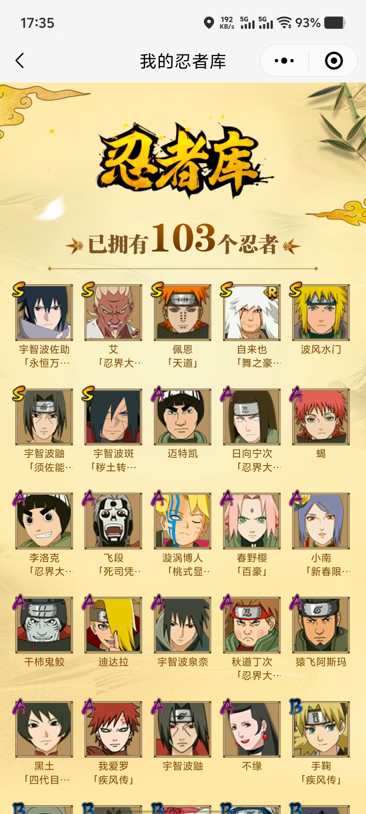 【A忍者】,不缘,日向宁次「忍界大战」,漩涡博人「桃式显现」,李洛克「忍界大战」,宇智波泉奈,小南「新春限定」,秋道丁次「忍界大战」,春野樱「百豪」,飞段「死司凭血」,迪达拉,我爱罗「疾风传」,蝎,干柿鬼鲛,宇智波鼬,猿飞阿斯玛,迈特凯,