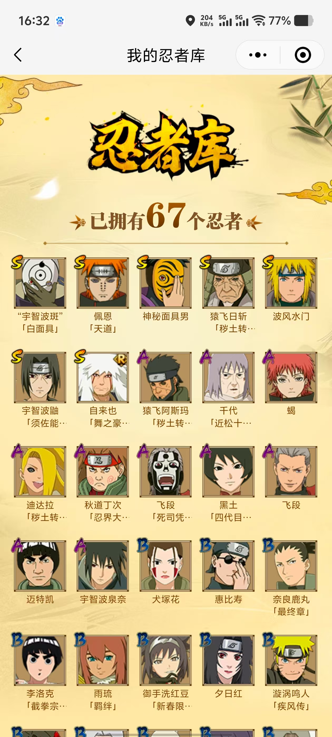 PX_2160088-7S忍/10A忍/战力370W/V1/区服2321 【S忍者】,自来也「舞之豪杰」,宇智波斑「白面具」,猿飞日斩「秽土转生」,神秘面具男,宇智波鼬「须佐能乎」,佩恩「天道」,波风水门, 【A忍者】,宇智波泉奈,迪达拉「秽土转生」,千代「近松十人卫」,秋道丁次「忍界大战」,猿飞阿斯玛「秽土转生」,飞段「死司凭血」,飞段,蝎,迈特凯,