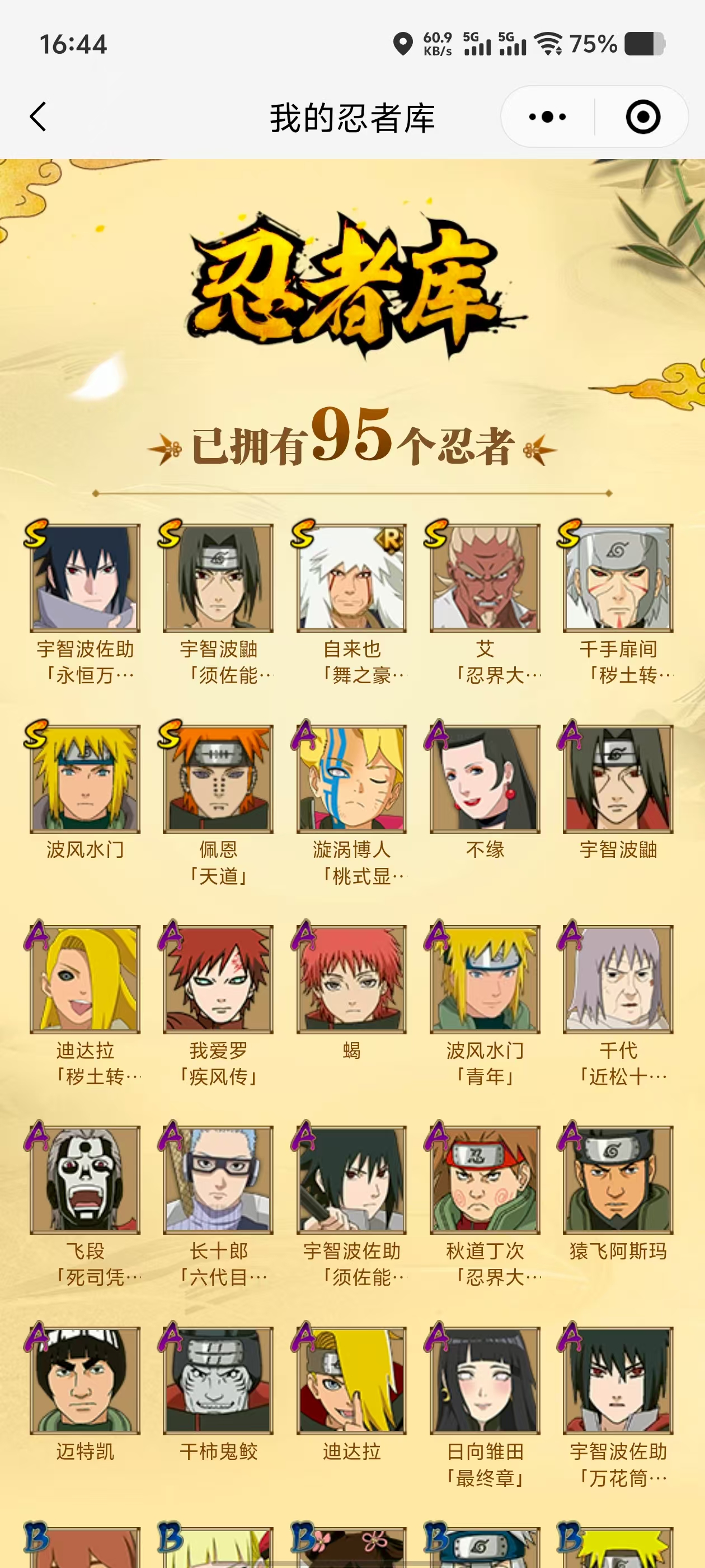 【A忍者】,长十郎「六代目水影」,不缘,漩涡博人「桃式显现」,日向雏田「最终章」,波风水门「青年」,宇智波佐助「须佐能乎」,迪达拉「秽土转生」,千代「近松十人卫」,秋道丁次「忍界大战」,宇智波佐助「万花筒写轮眼」,飞段「死司凭血」,迪达拉,我爱罗「疾风传」,蝎,干柿鬼鲛,宇智波鼬,猿飞阿斯玛,迈特凯,