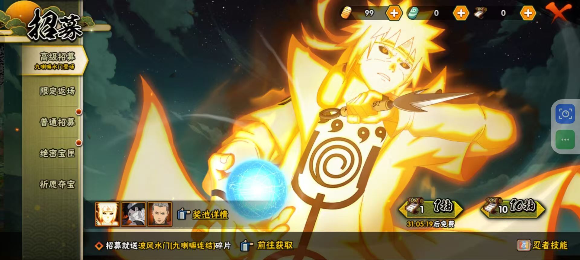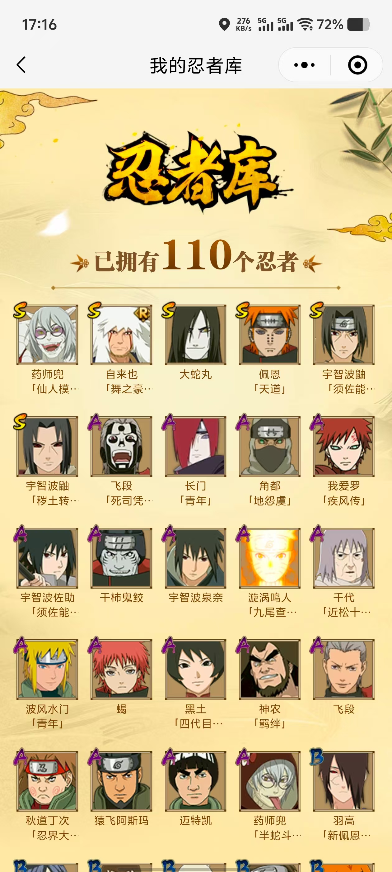 【A忍者】,宇智波泉奈,神农「羁绊」,长门「青年」,波风水门「青年」,宇智波佐助「须佐能乎」,漩涡鸣人「九尾查克拉」,千代「近松十人卫」,药师兜「半蛇斗篷」,秋道丁次「忍界大战」,角都「地怨虞」,飞段「死司凭血」,飞段,我爱罗「疾风传」,蝎,干柿鬼鲛,猿飞阿斯玛,迈特凯,