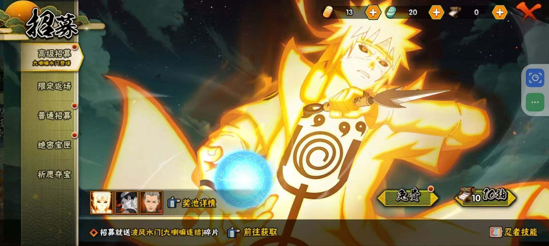 【S忍者】,宇智波斑「秽土转生·解」,宇智波佐助「永恒万花筒」,迈特凯「死门」,宇智波带土「忍界大战」,千手柱间「秽土转生」,自来也「舞之豪杰」,旗木卡卡西「须佐能乎」,宇智波鼬「秽土转生」,宇智波鼬「须佐能乎」,佩恩「天道」,波风水门,大蛇丸,