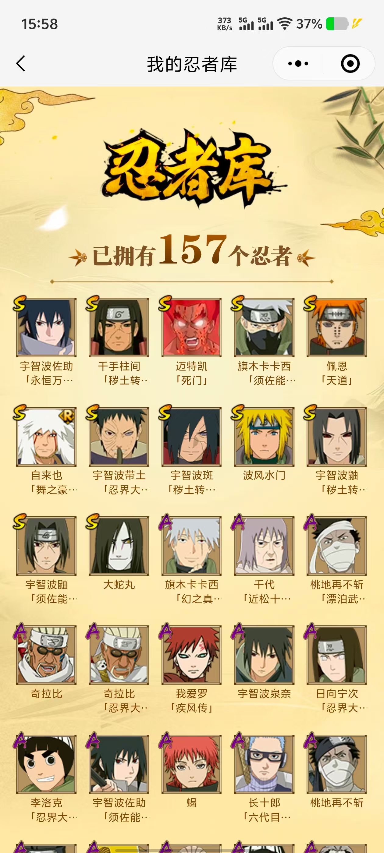 【A忍者】,长十郎「六代目水影」,日向宁次「忍界大战」,漩涡博人「桃式显现」,旗木卡卡西「幻之真容」,李洛克「忍界大战」,宇智波泉奈,艾「青年」,达鲁伊「五代目雷影」,波风水门「青年」,奇拉比「忍界大战」,宇智波佐助「须佐能乎」,桃地再不斩「漂泊武士」,迪达拉「秽土转生」,漩涡鸣人「九尾查克拉」,角都「晓创生」,千代「近松十人卫」,秋道丁次「忍界大战」,照美冥「五代目水影」,宇智波佐助「万花筒写轮眼」,奇拉比,飞段「死司凭血」,飞段,迪达拉,我爱罗「疾风传」,蝎,干柿鬼鲛,宇智波鼬,猿飞阿斯玛,迈特凯,桃地再不斩,