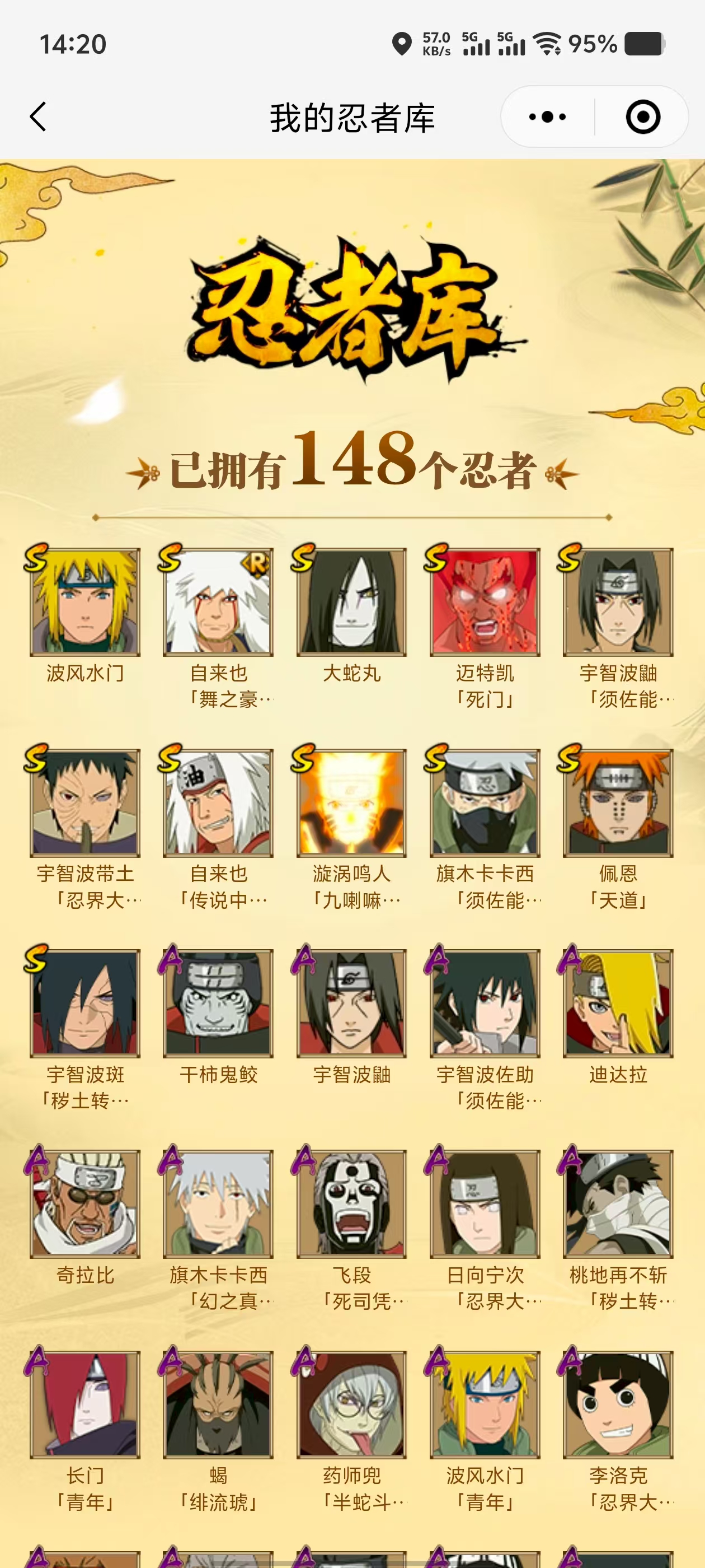 【A忍者】,不缘,日向宁次「忍界大战」,漩涡博人「桃式显现」,旗木卡卡西「幻之真容」,李洛克「忍界大战」,蝎「绯流琥」,宇智波泉奈,桃地再不斩「秽土转生」,长门「青年」,艾「青年」,达鲁伊「五代目雷影」,波风水门「青年」,宇智波佐助「须佐能乎」,千代「近松十人卫」,药师兜「半蛇斗篷」,秋道丁次「忍界大战」,宇智波佐助「万花筒写轮眼」,奇拉比,飞段「死司凭血」,飞段,迪达拉,我爱罗「疾风传」,蝎,干柿鬼鲛,宇智波鼬,猿飞阿斯玛,迈特凯,