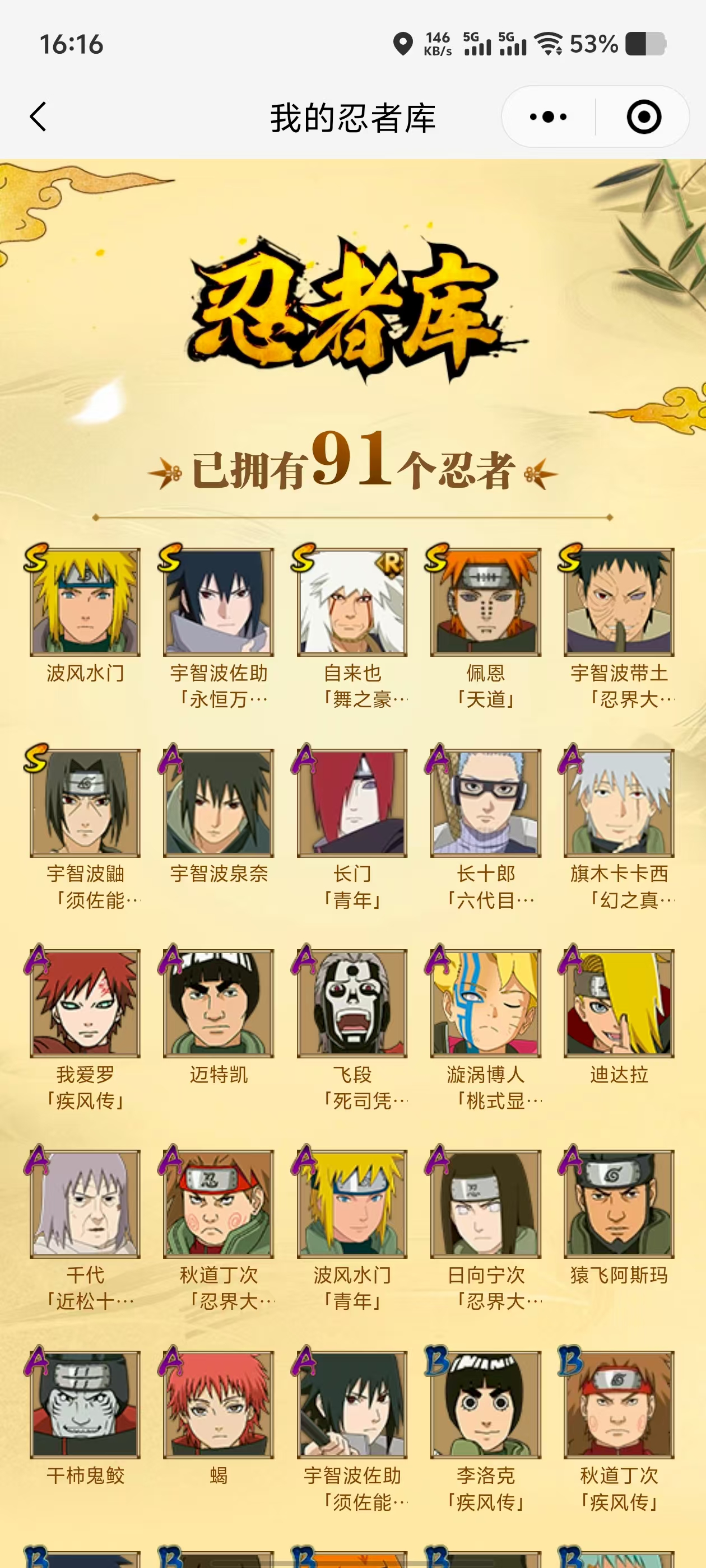 【A忍者】,长十郎「六代目水影」,日向宁次「忍界大战」,漩涡博人「桃式显现」,旗木卡卡西「幻之真容」,宇智波泉奈,长门「青年」,波风水门「青年」,宇智波佐助「须佐能乎」,千代「近松十人卫」,秋道丁次「忍界大战」,飞段「死司凭血」,迪达拉,我爱罗「疾风传」,蝎,干柿鬼鲛,猿飞阿斯玛,迈特凯,