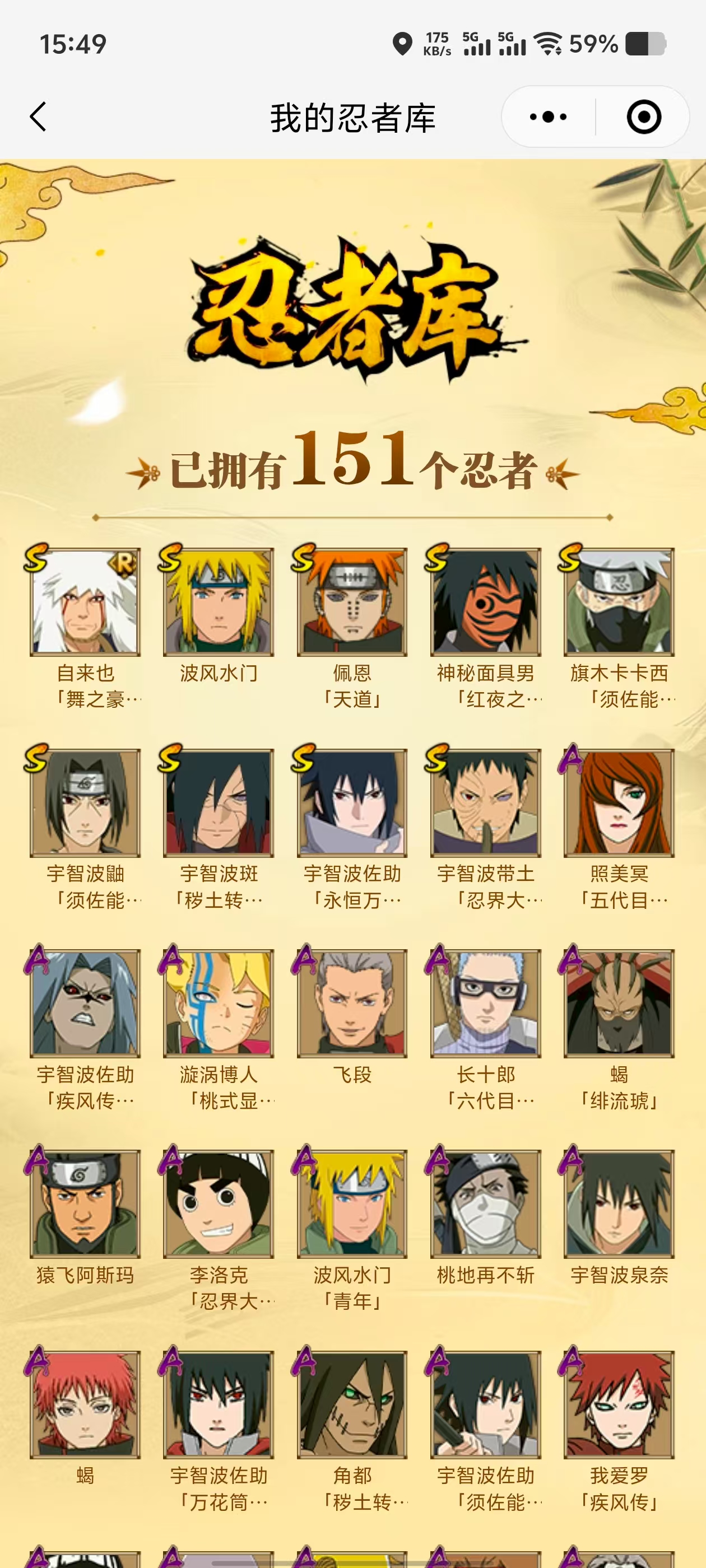 【A忍者】,长十郎「六代目水影」,日向宁次「忍界大战」,漩涡博人「桃式显现」,旗木卡卡西「幻之真容」,李洛克「忍界大战」,蝎「绯流琥」,宇智波泉奈,角都「秽土转生」,波风水门「青年」,宇智波佐助「须佐能乎」,千代「近松十人卫」,宇智波佐助「疾风传咒印」,秋道丁次「忍界大战」,照美冥「五代目水影」,宇智波佐助「万花筒写轮眼」,飞段「死司凭血」,飞段,迪达拉,我爱罗「疾风传」,蝎,干柿鬼鲛,猿飞阿斯玛,迈特凯,桃地再不斩,