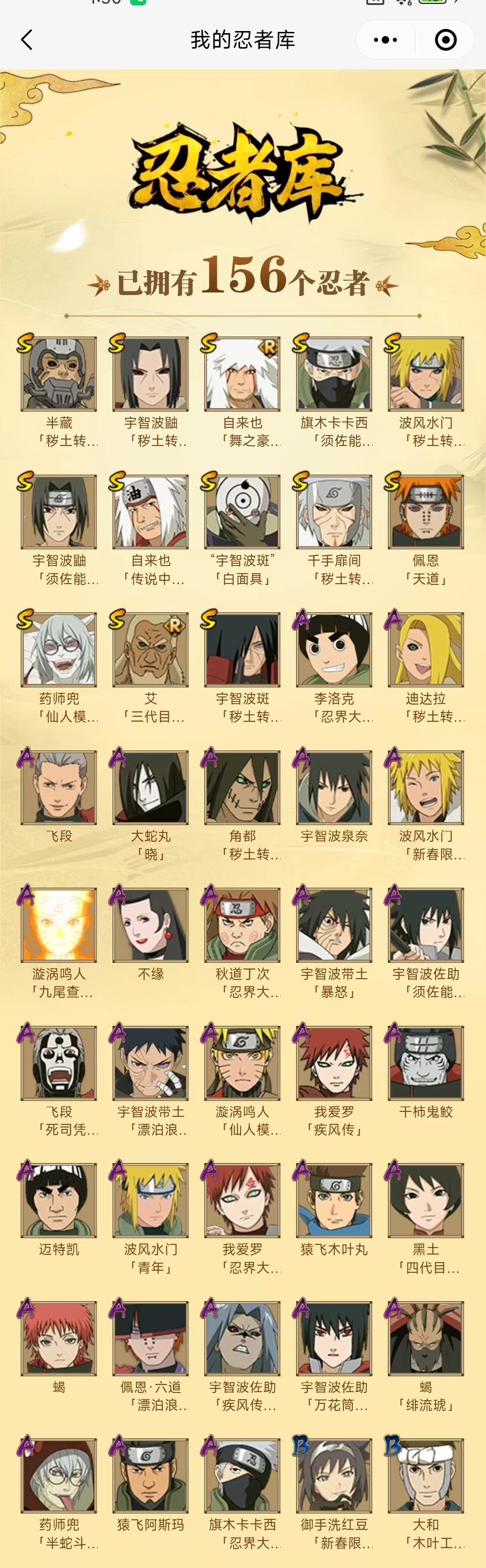 【A忍者】,不缘,李洛克「忍界大战」,蝎「绯流琥」,宇智波泉奈,宇智波带土「漂泊浪客」,角都「秽土转生」,佩恩·六道「漂泊浪客」,波风水门「青年」,宇智波佐助「须佐能乎」,迪达拉「秽土转生」,旗木卡卡西「忍界大战」,宇智波带土「暴怒」,漩涡鸣人「九尾查克拉」,药师兜「半蛇斗篷」,宇智波佐助「疾风传咒印」,我爱罗「忍界大战」,秋道丁次「忍界大战」,大蛇丸「晓」,波风水门「新春限定」,宇智波佐助「万花筒写轮眼」,漩涡鸣人「仙人模式」,飞段「死司凭血」,飞段,我爱罗「疾风传」,蝎,干柿鬼鲛,猿飞阿斯玛,迈特凯,