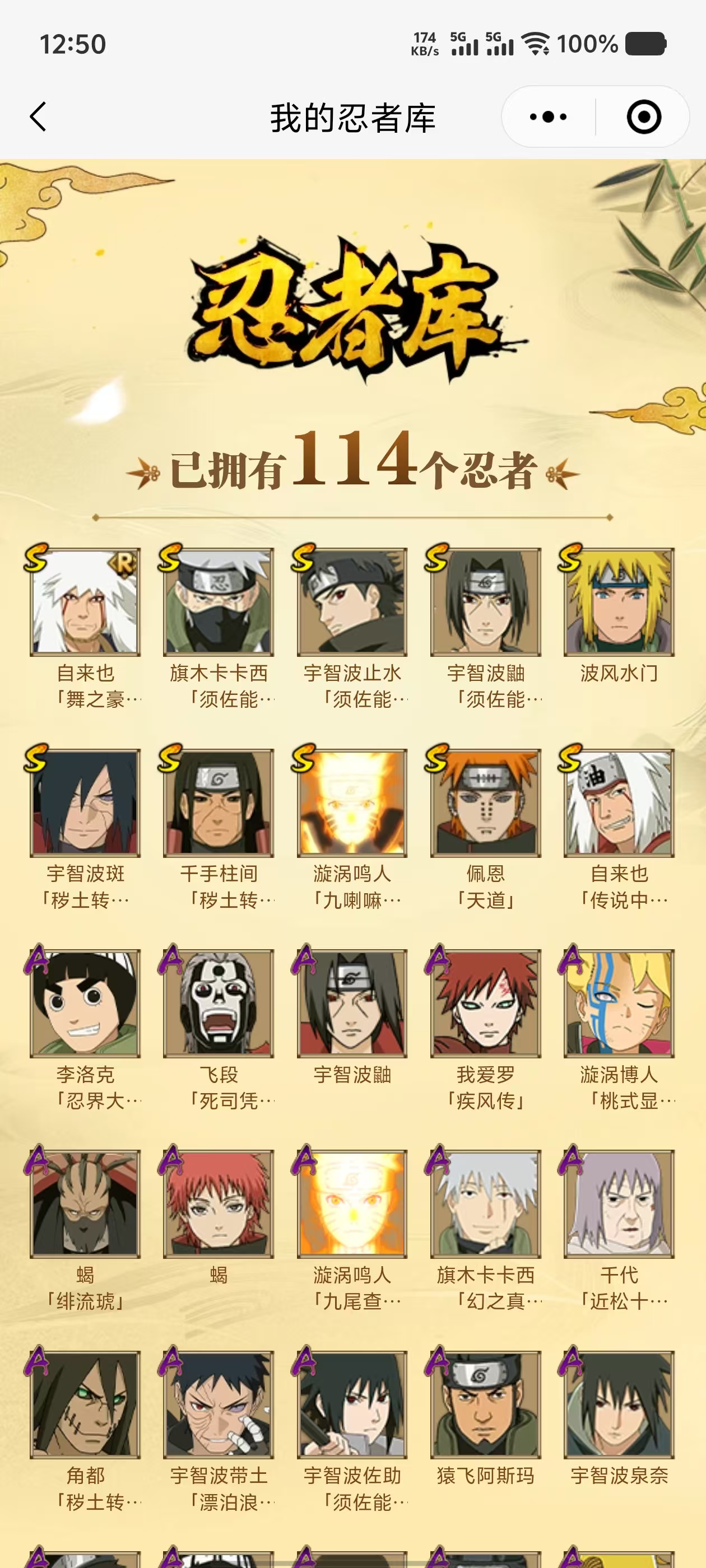 【A忍者】,不缘,日向宁次「忍界大战」,漩涡博人「桃式显现」,旗木卡卡西「幻之真容」,李洛克「忍界大战」,蝎「绯流琥」,宇智波泉奈,宇智波带土「漂泊浪客」,桃地再不斩「秽土转生」,角都「秽土转生」,波风水门「青年」,宇智波佐助「须佐能乎」,漩涡鸣人「九尾查克拉」,千代「近松十人卫」,飞段「死司凭血」,飞段,迪达拉,我爱罗「疾风传」,蝎,干柿鬼鲛,宇智波鼬,猿飞阿斯玛,迈特凯,