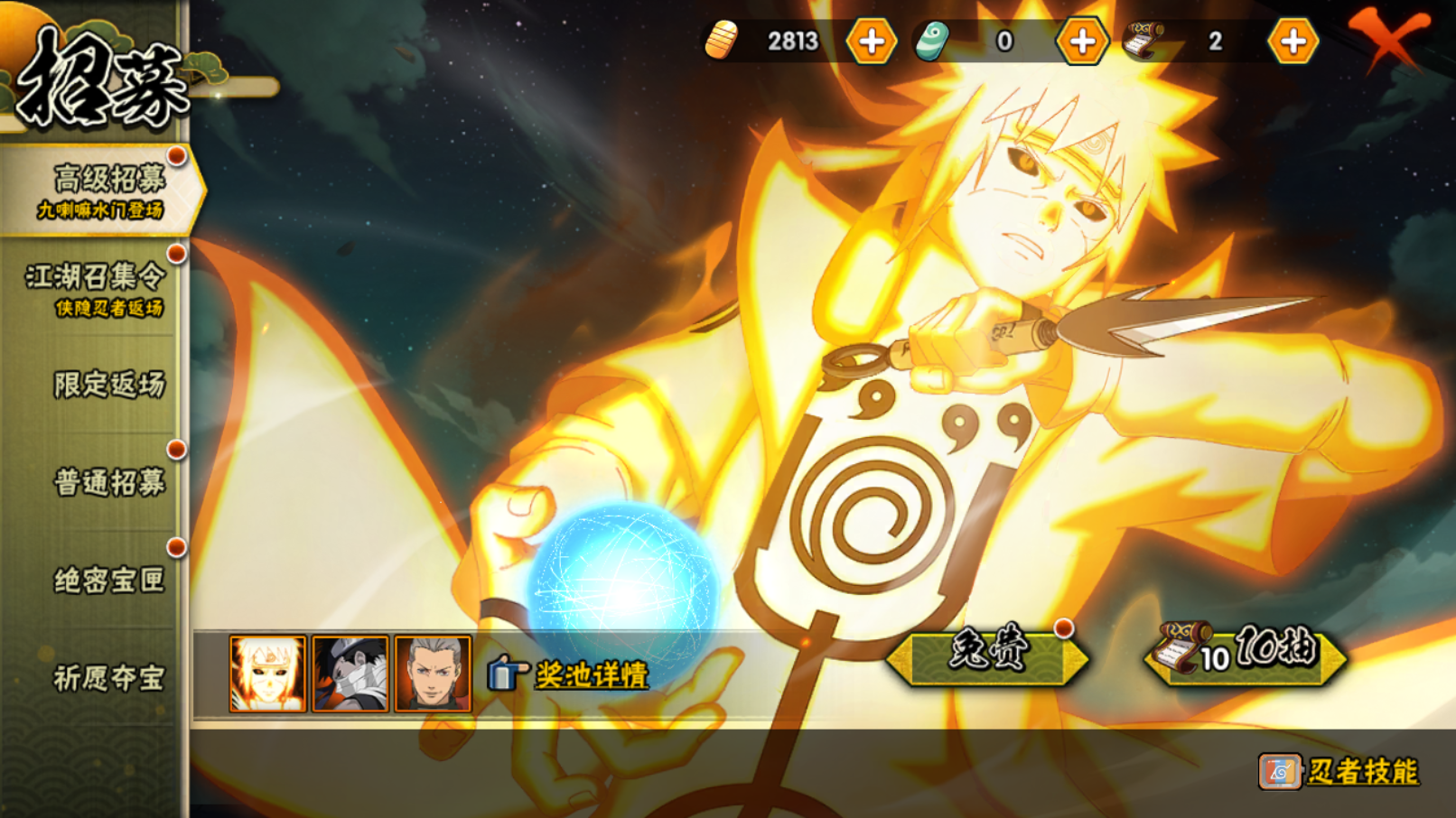 【S忍者】,宇智波斑「秽土转生·解」,宇智波佐助「永恒万花筒」,漩涡鸣人「九喇嘛连结」,自来也「舞之豪杰」,旗木卡卡西「须佐能乎」,宇智波鼬「须佐能乎」,佩恩「天道」,波风水门,